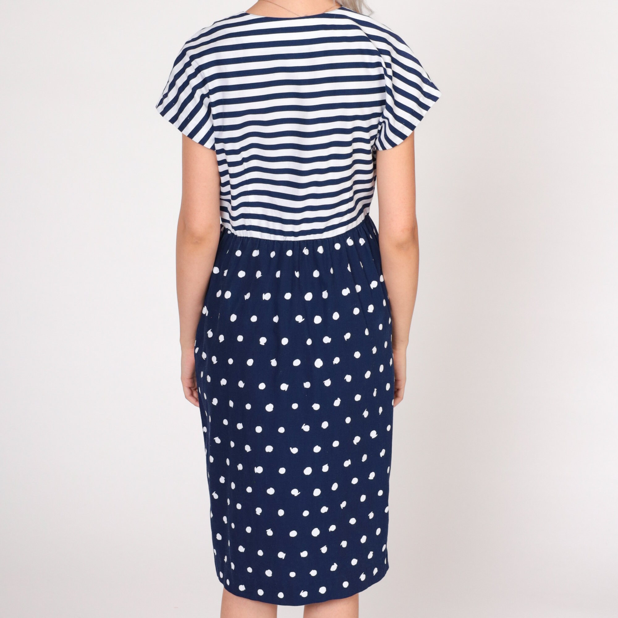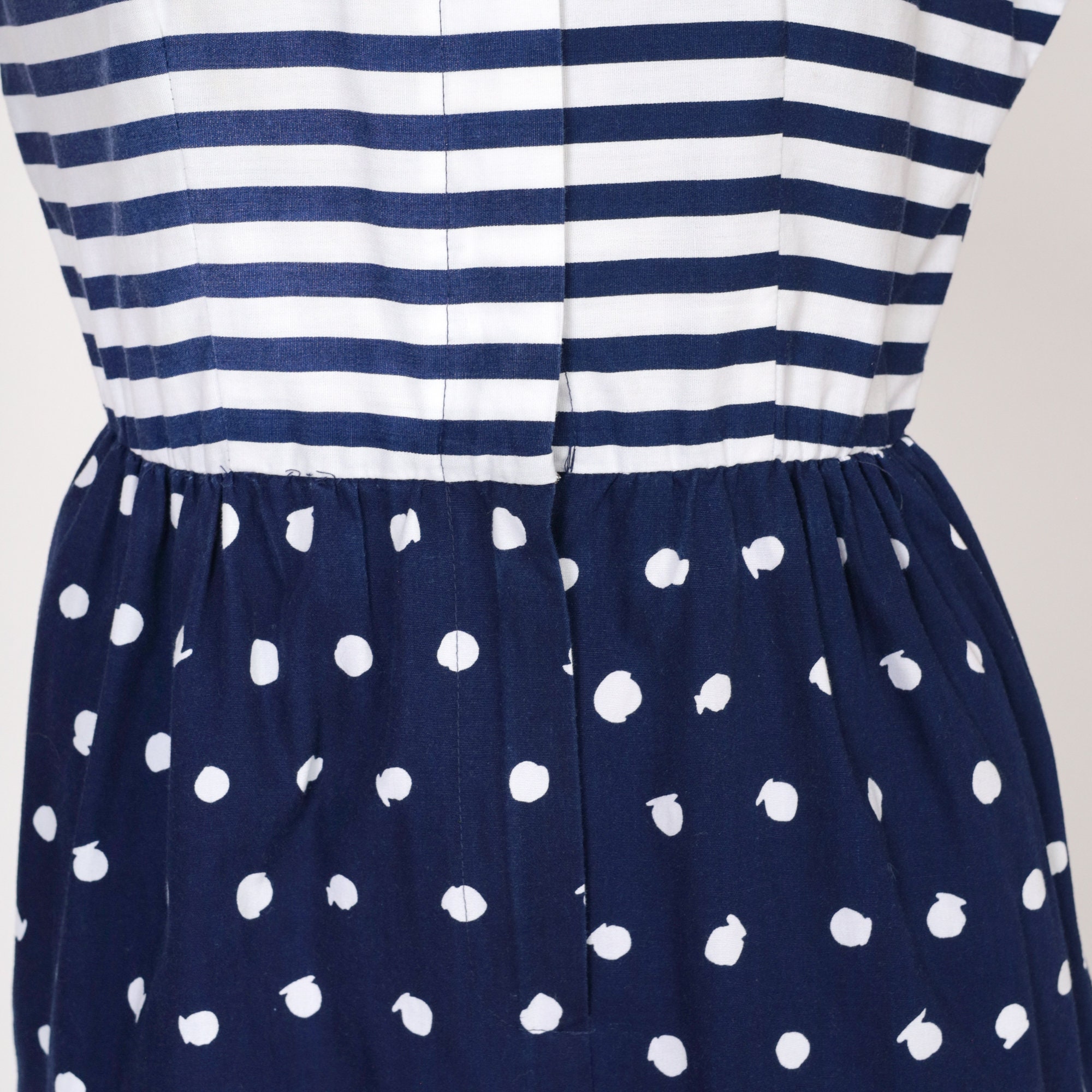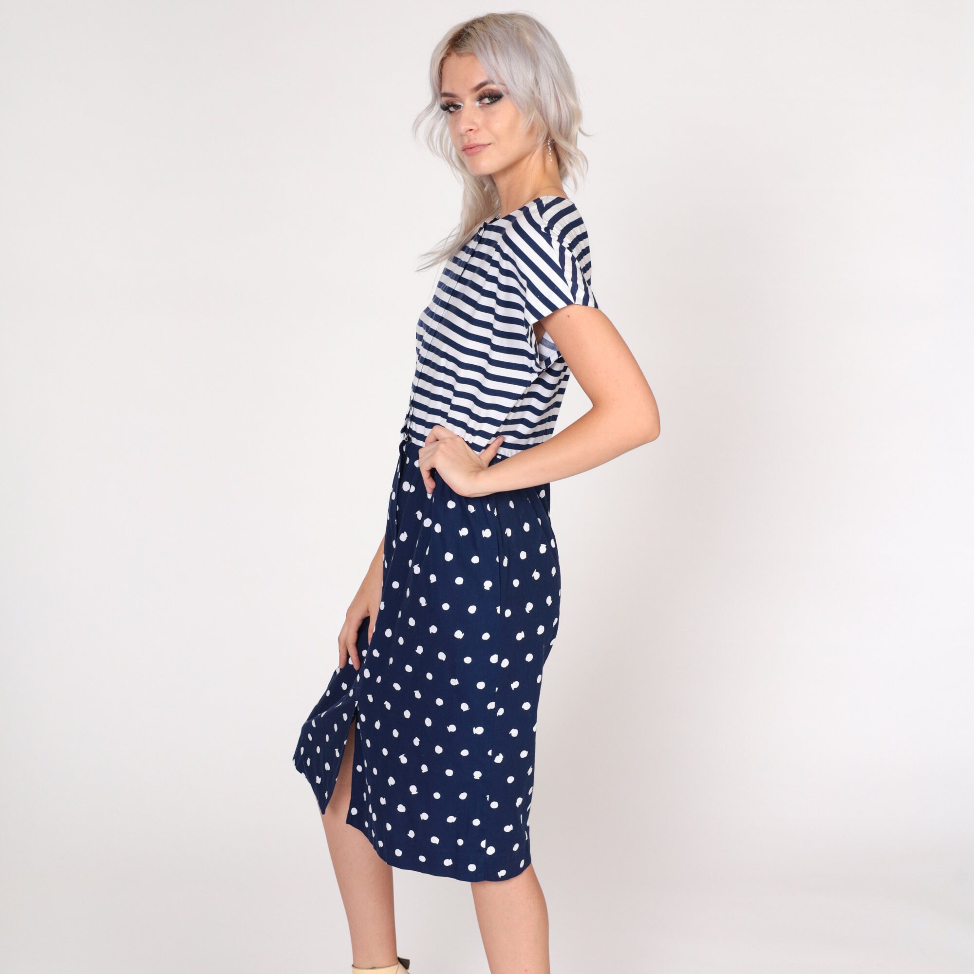 Vintage 80s dress in white and blue with a striped bodice and a polka dot skirt. High waisted with short sleeves; knee length midi with pockets.
