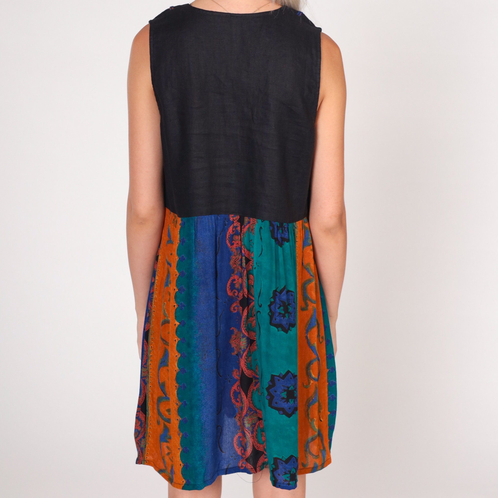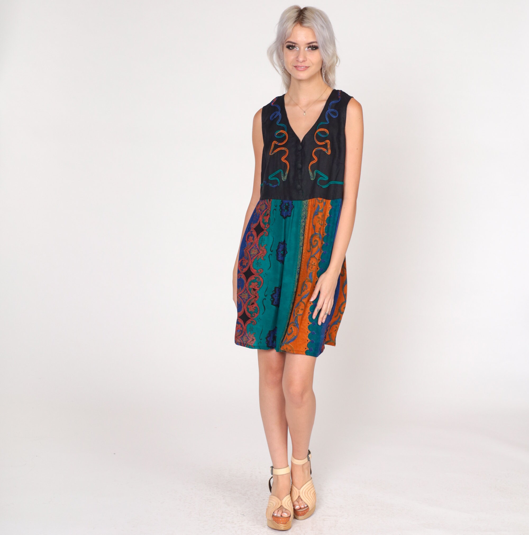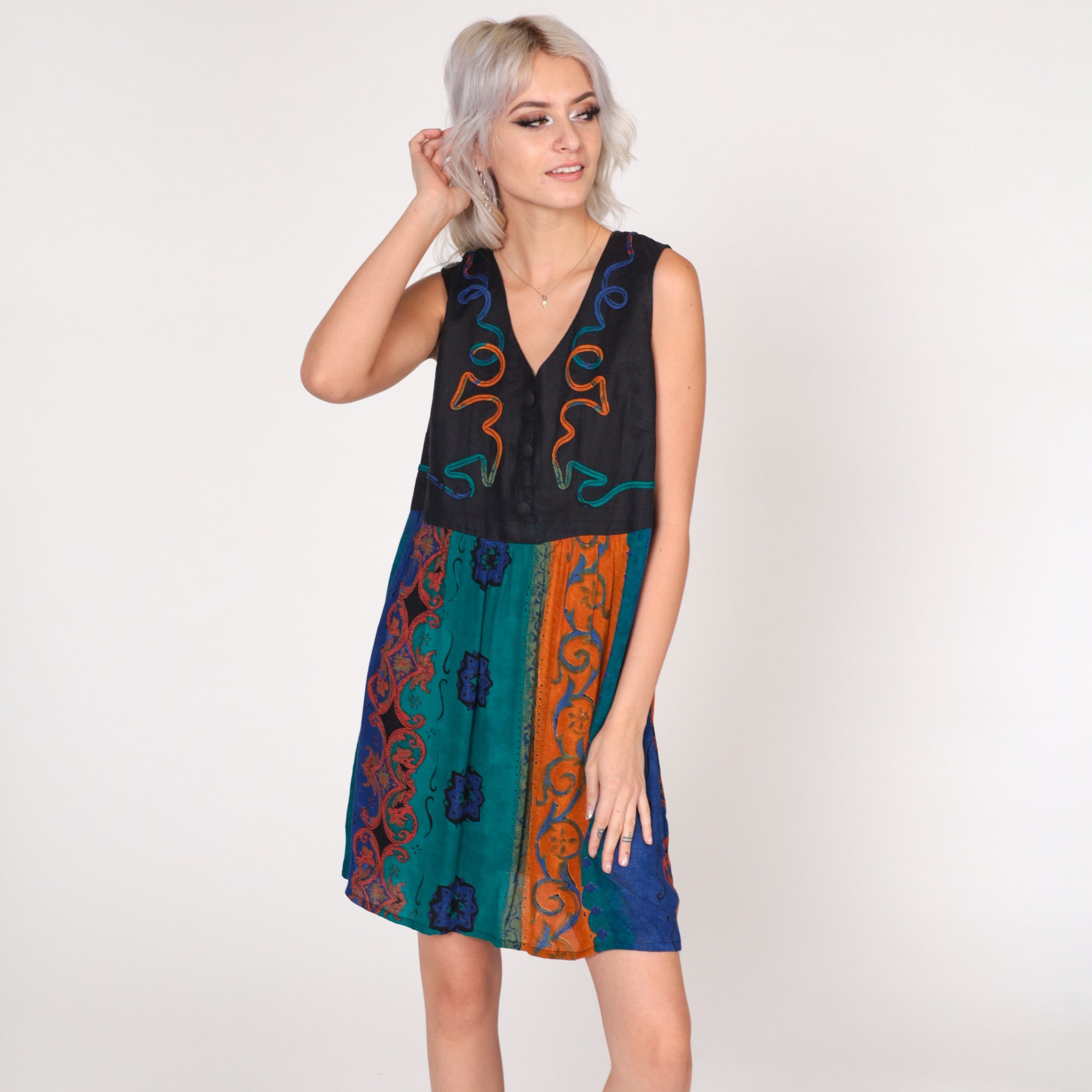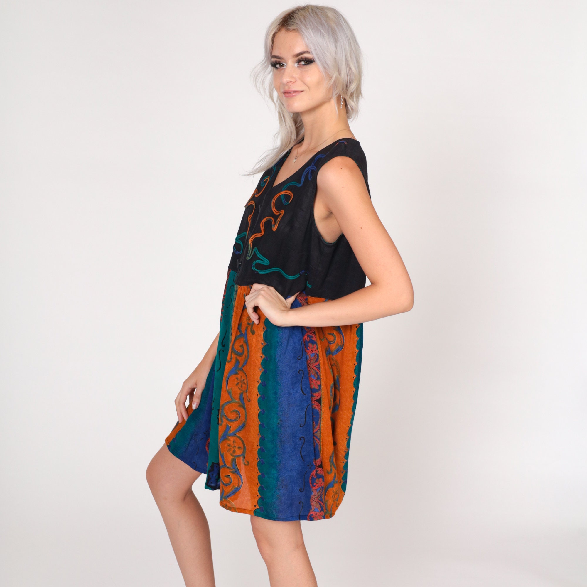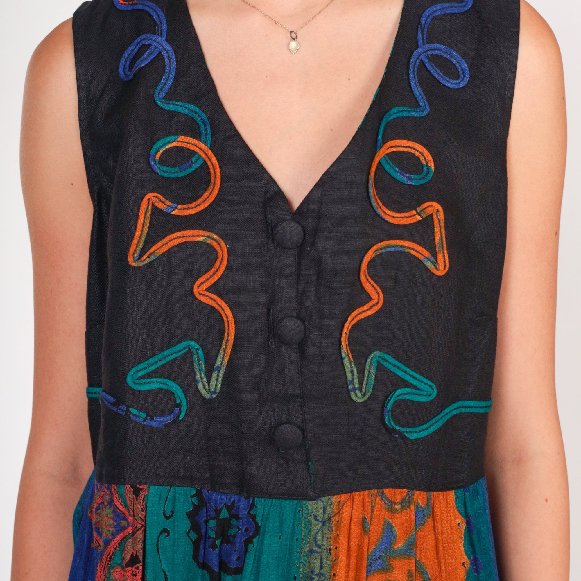 Vintage 90s dress with a black bodice and an abstract striped print skirt. Sleeveless with buttons up the chest and soutache trim.