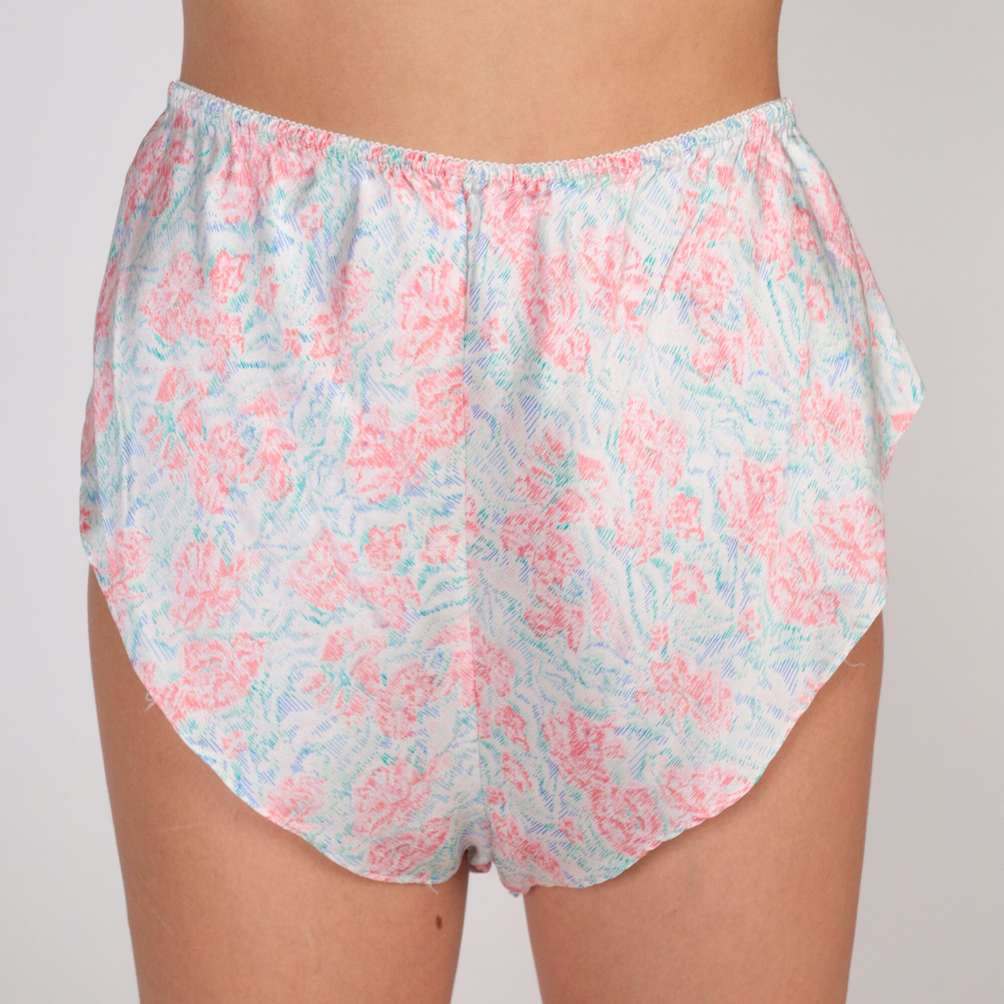 Vintage 80s sleep shorts in a floral print silk with an elastic waist and a dolphin cut.