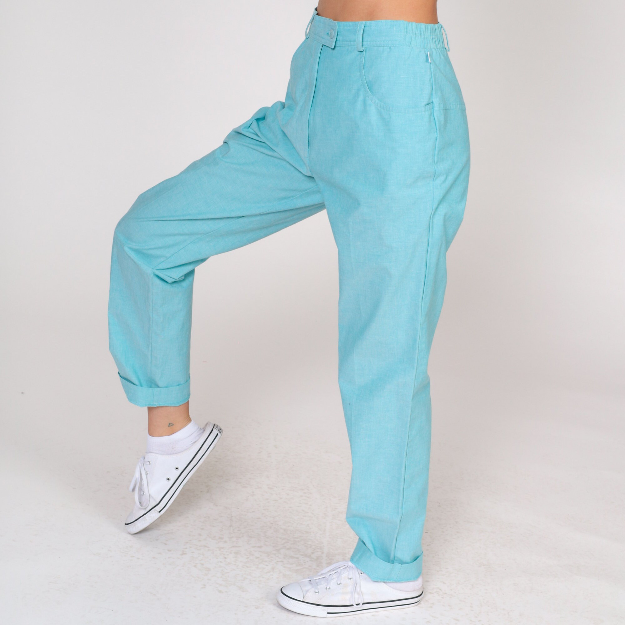 Vintage 80s pants in bright blue. High waisted with a tapered leg.