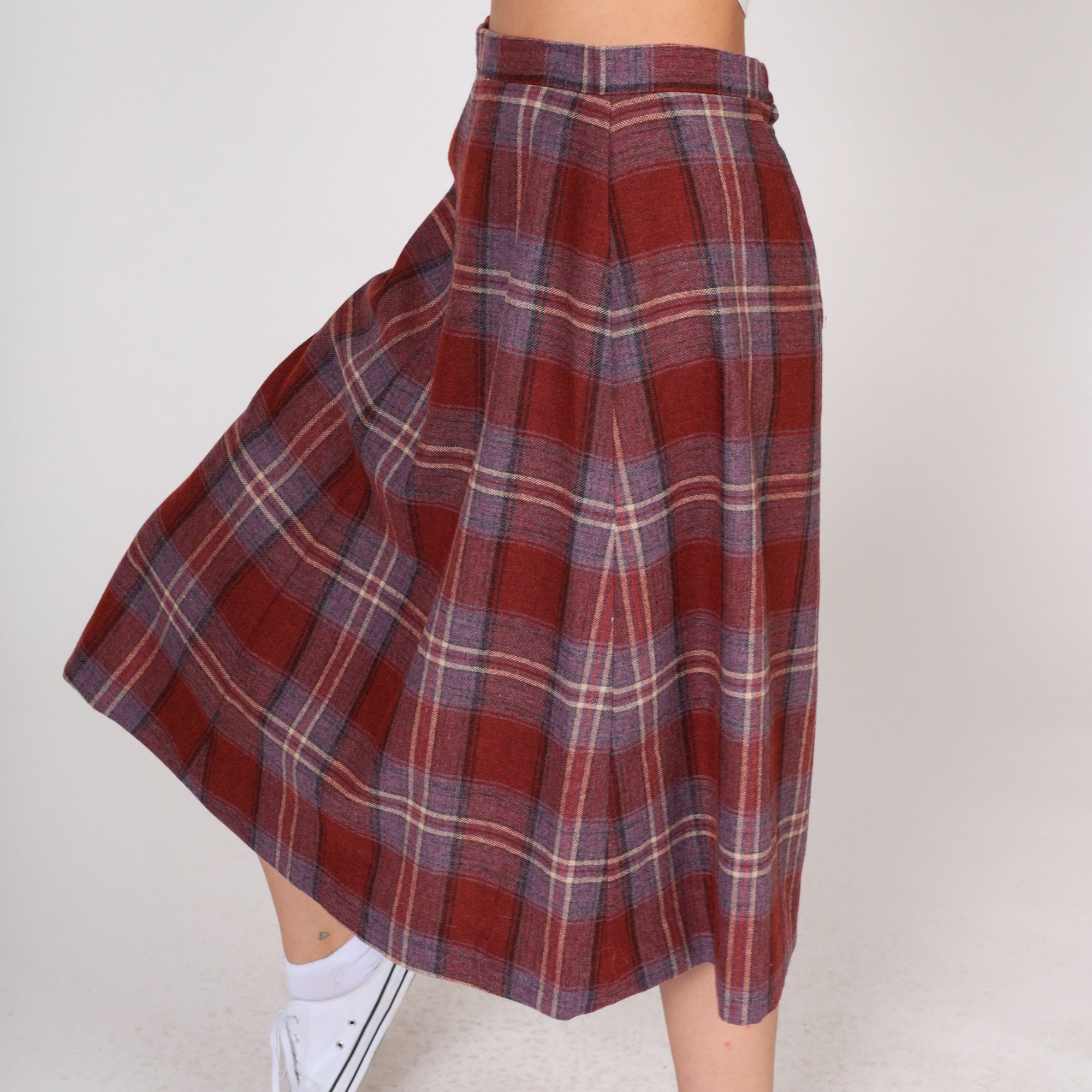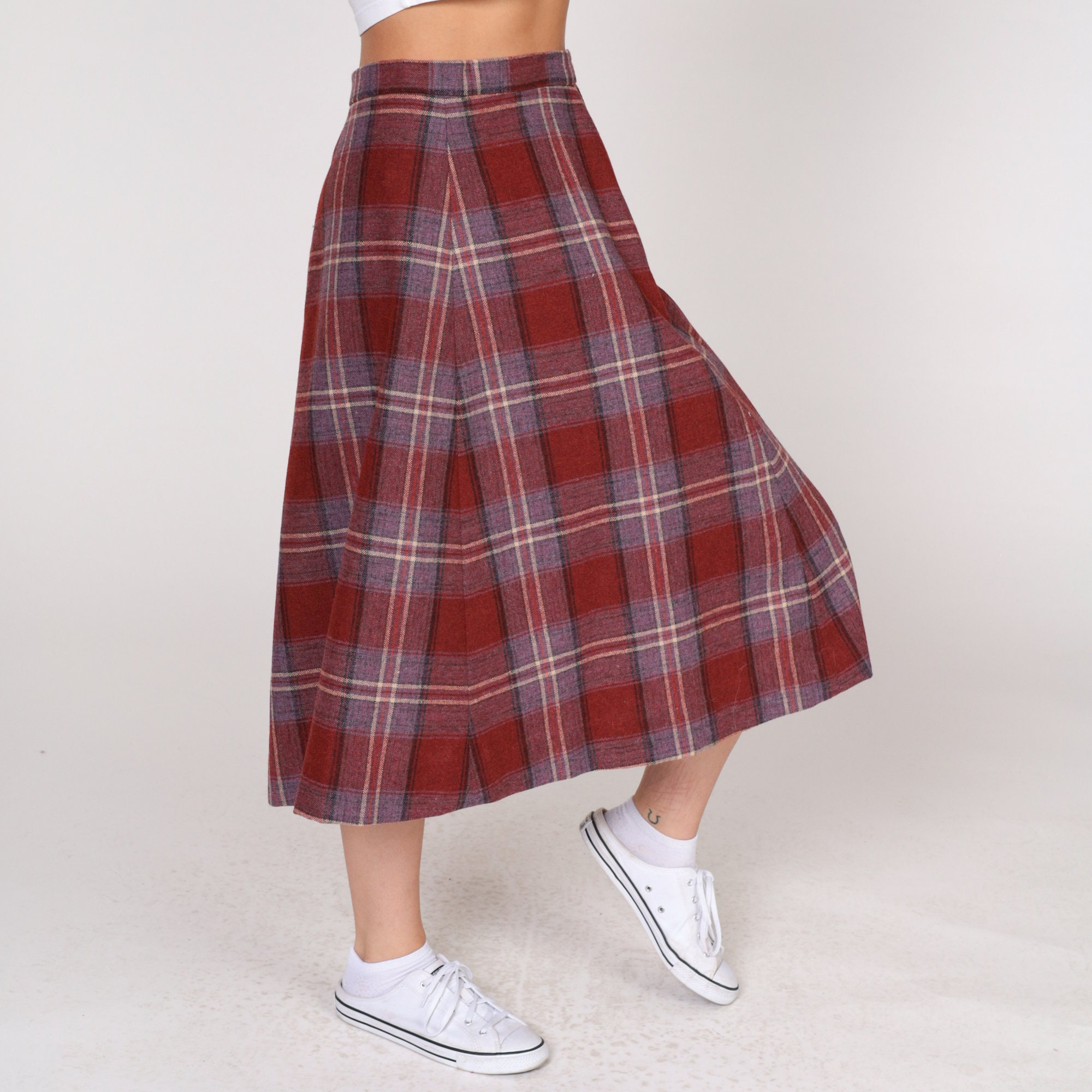 Vintage 80s skirt in a rust red plaid wool blend. Midi length with a high waist and an a-line cut.