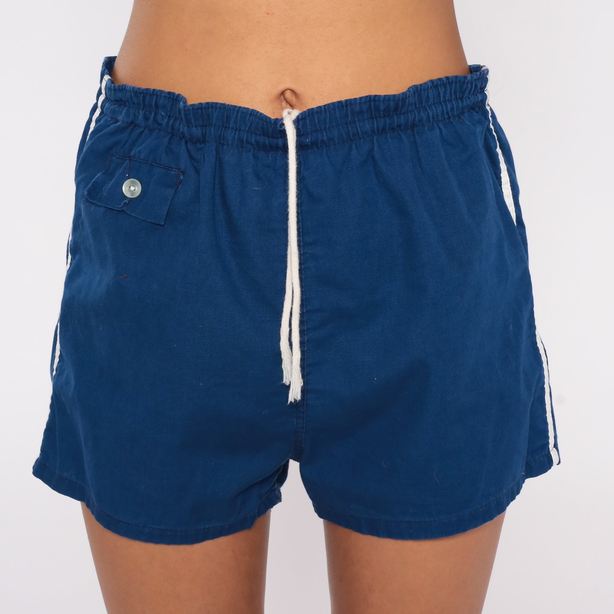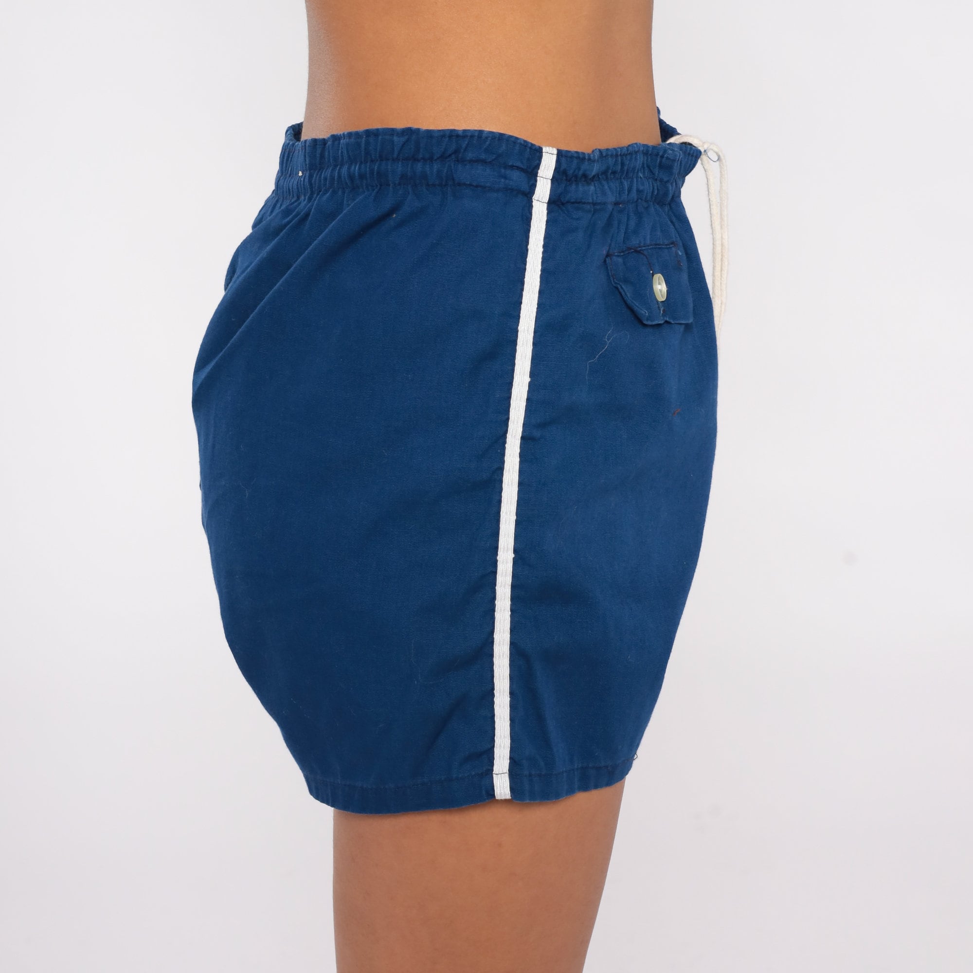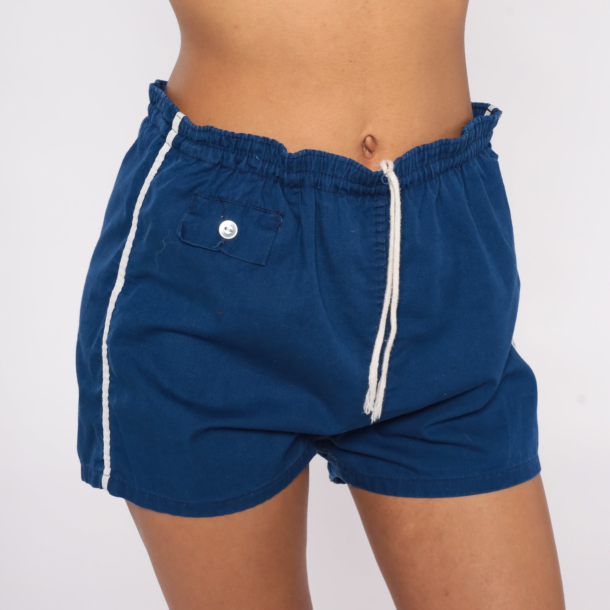 Vintage 80s running shorts in blue cotton with white striped trim and a high drawstring waist.