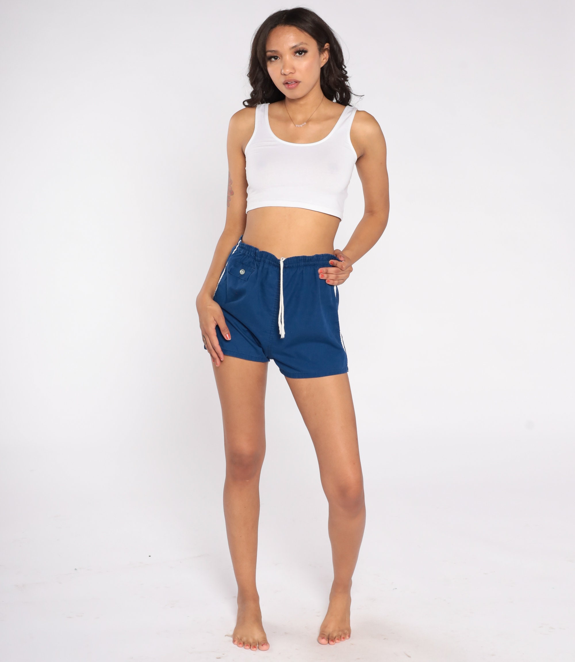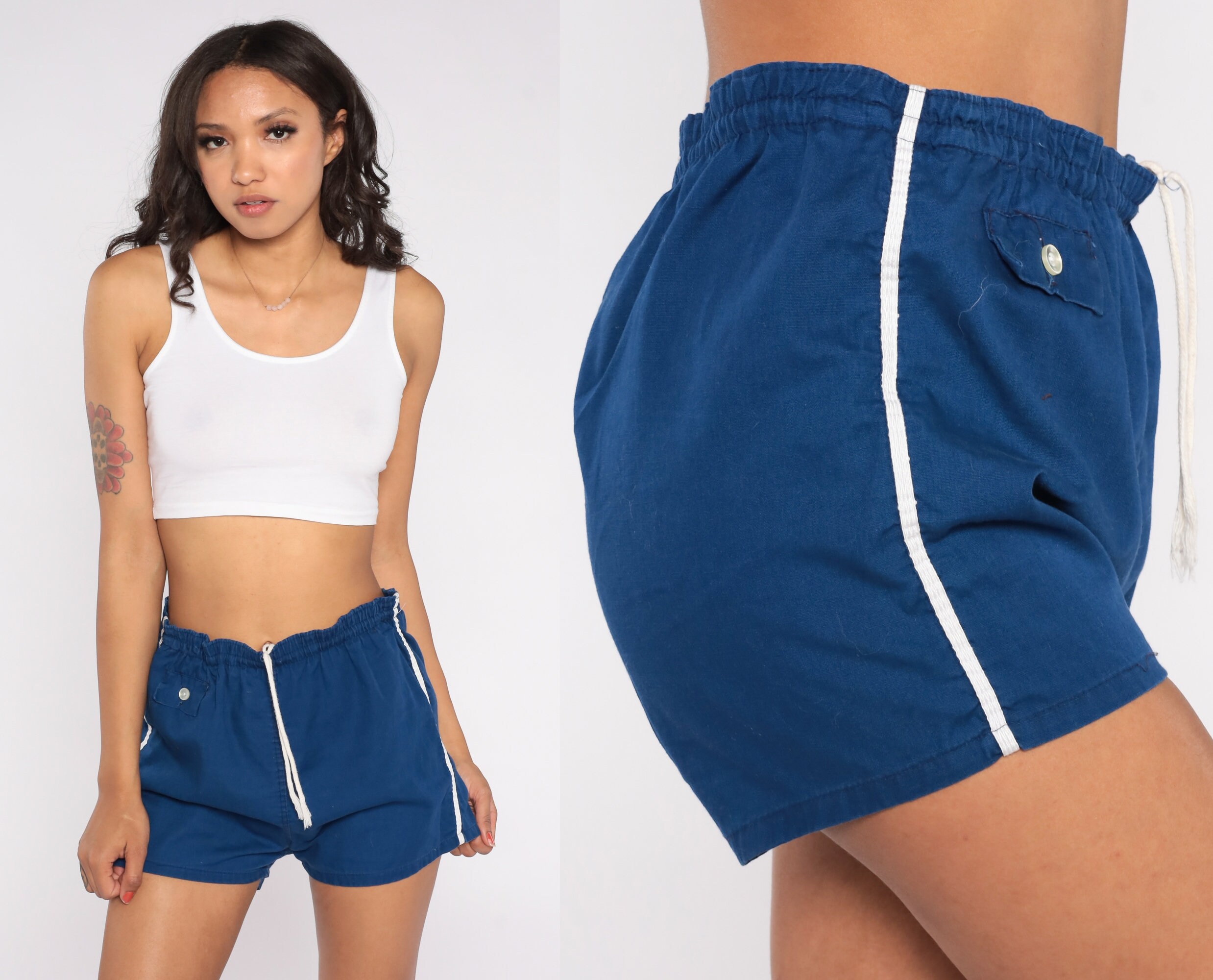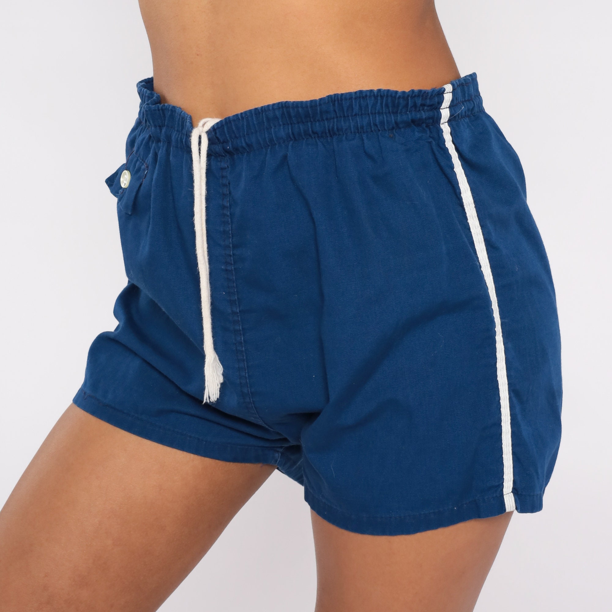 Vintage 80s running shorts in blue cotton with white striped trim and a high drawstring waist.
