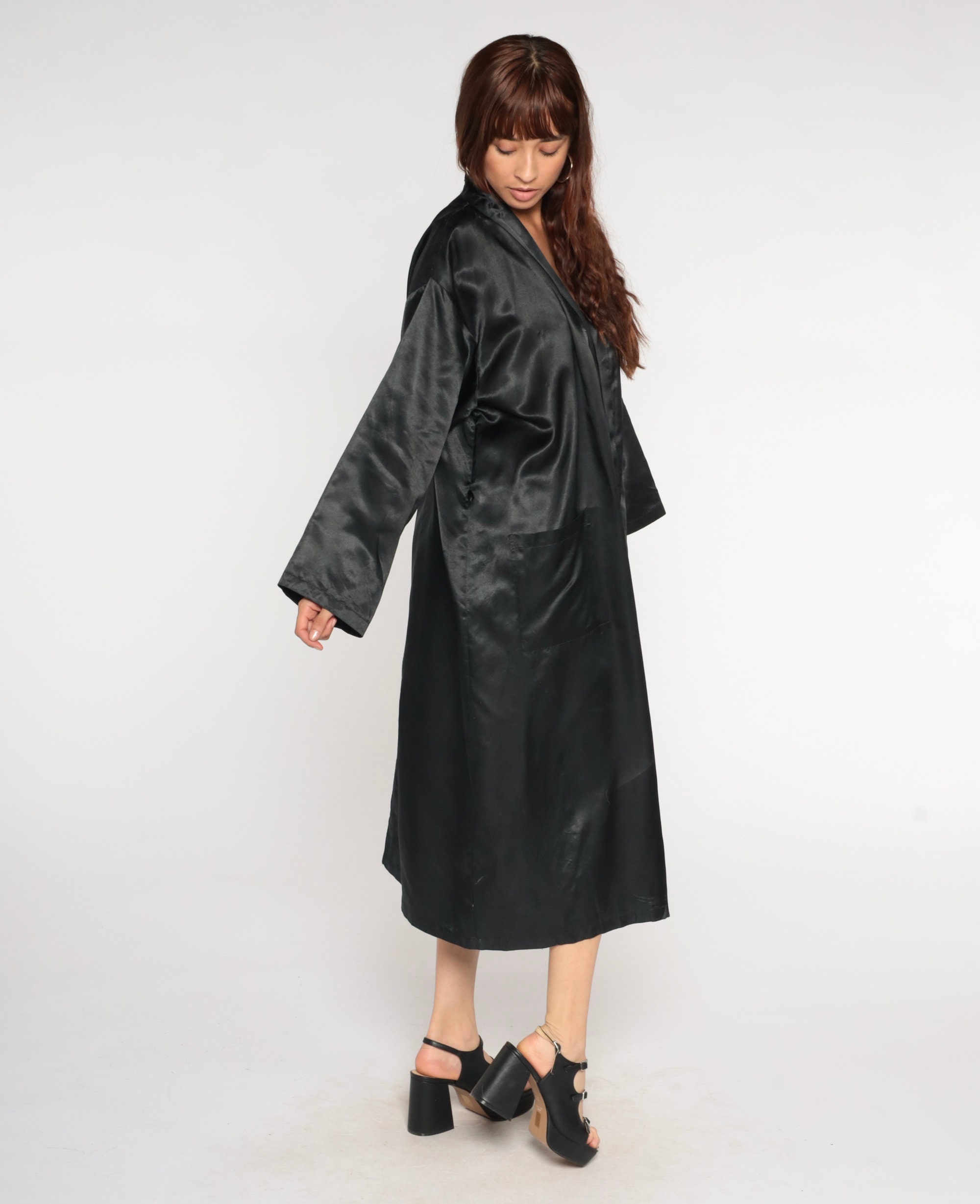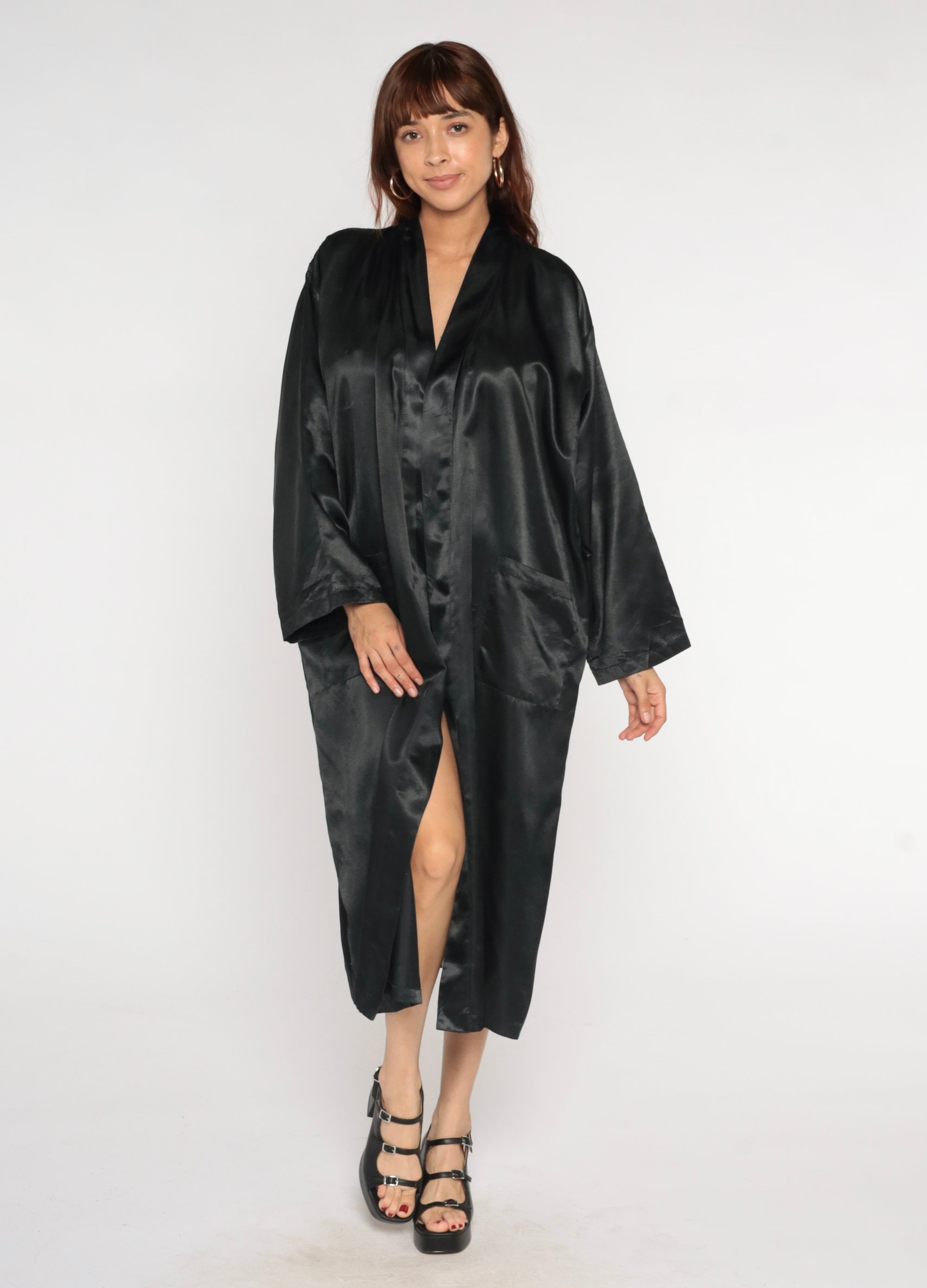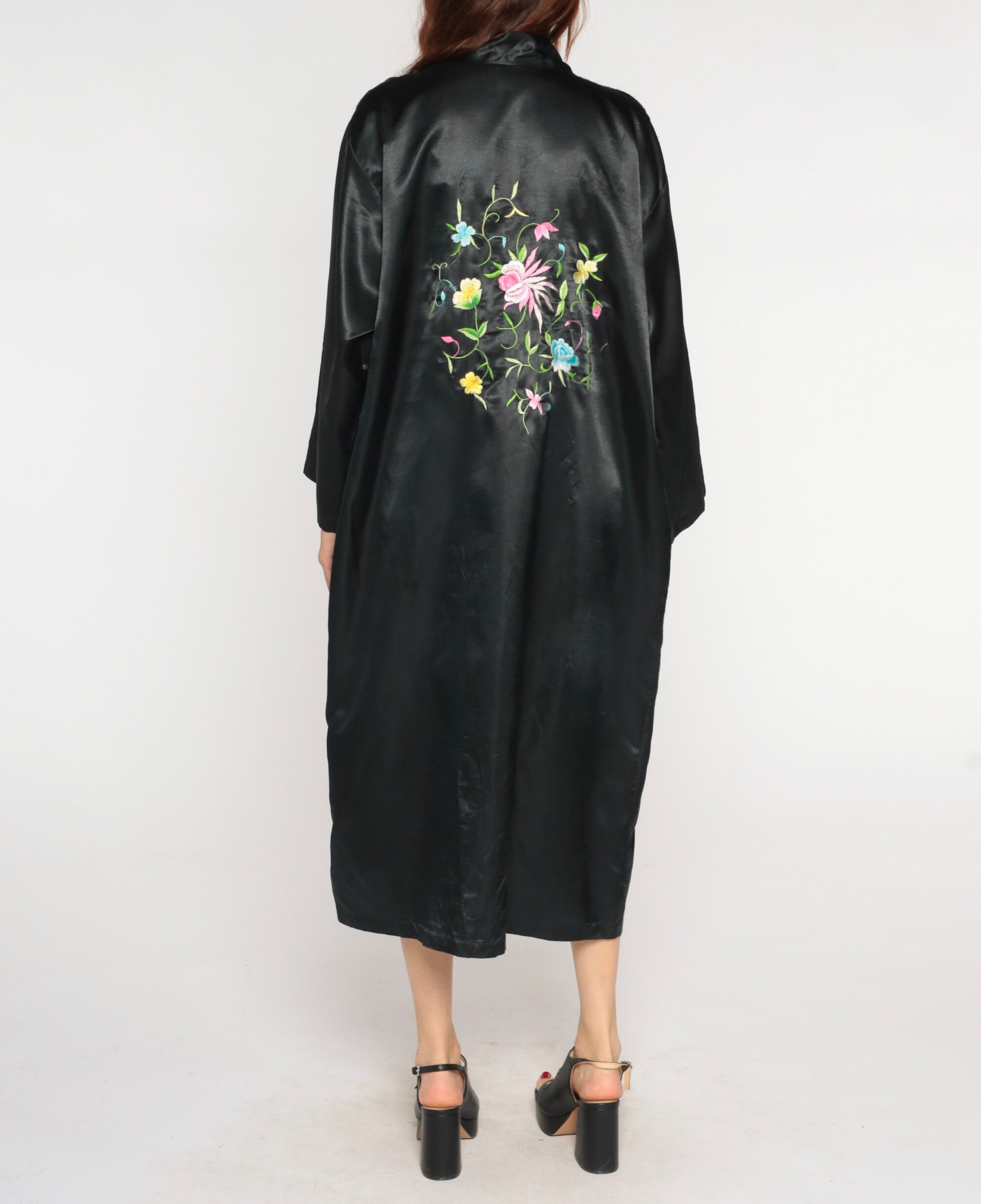 Vintage 90s kimono robe in black satin with an open front and floral embroidery on the back.