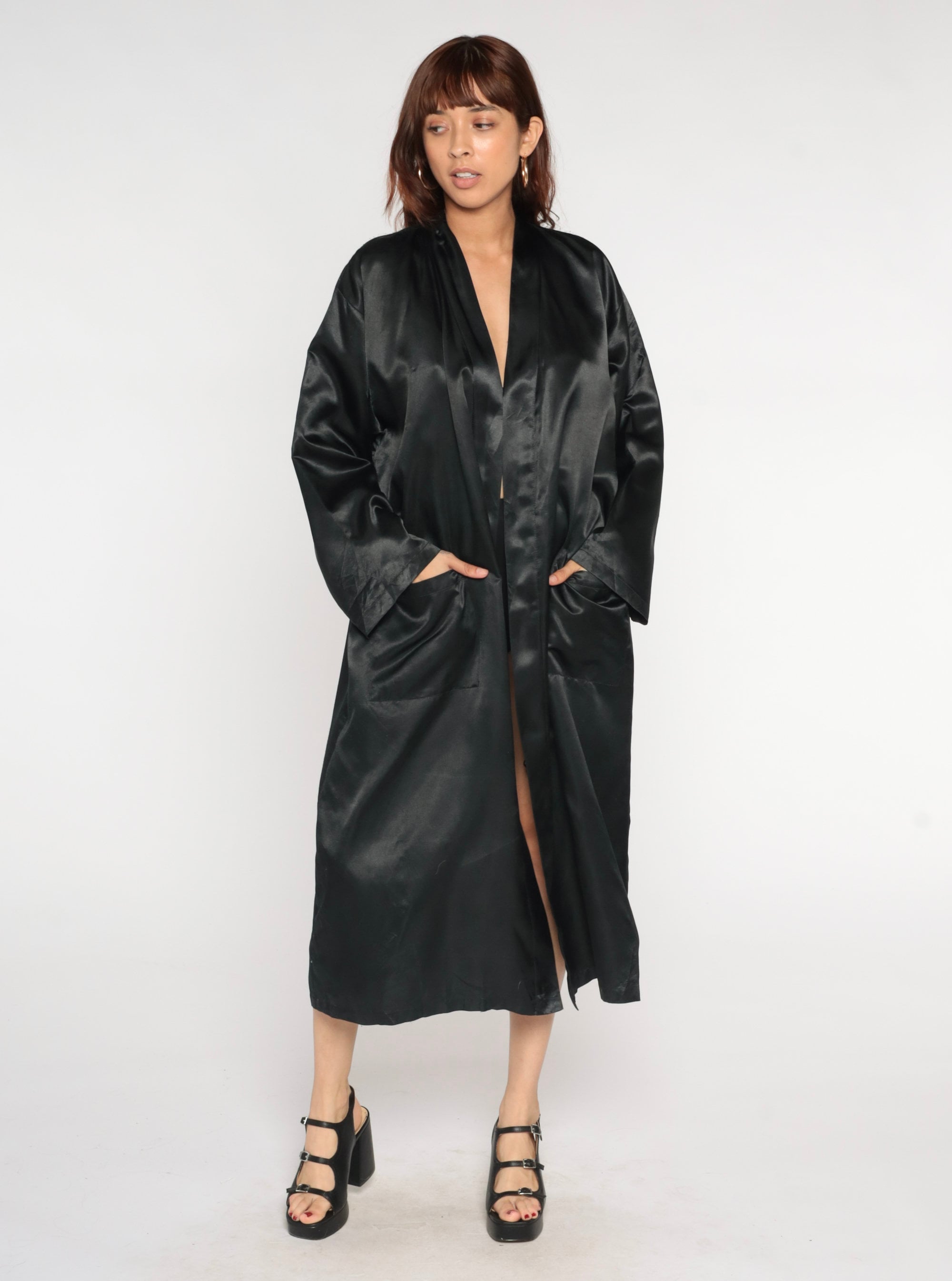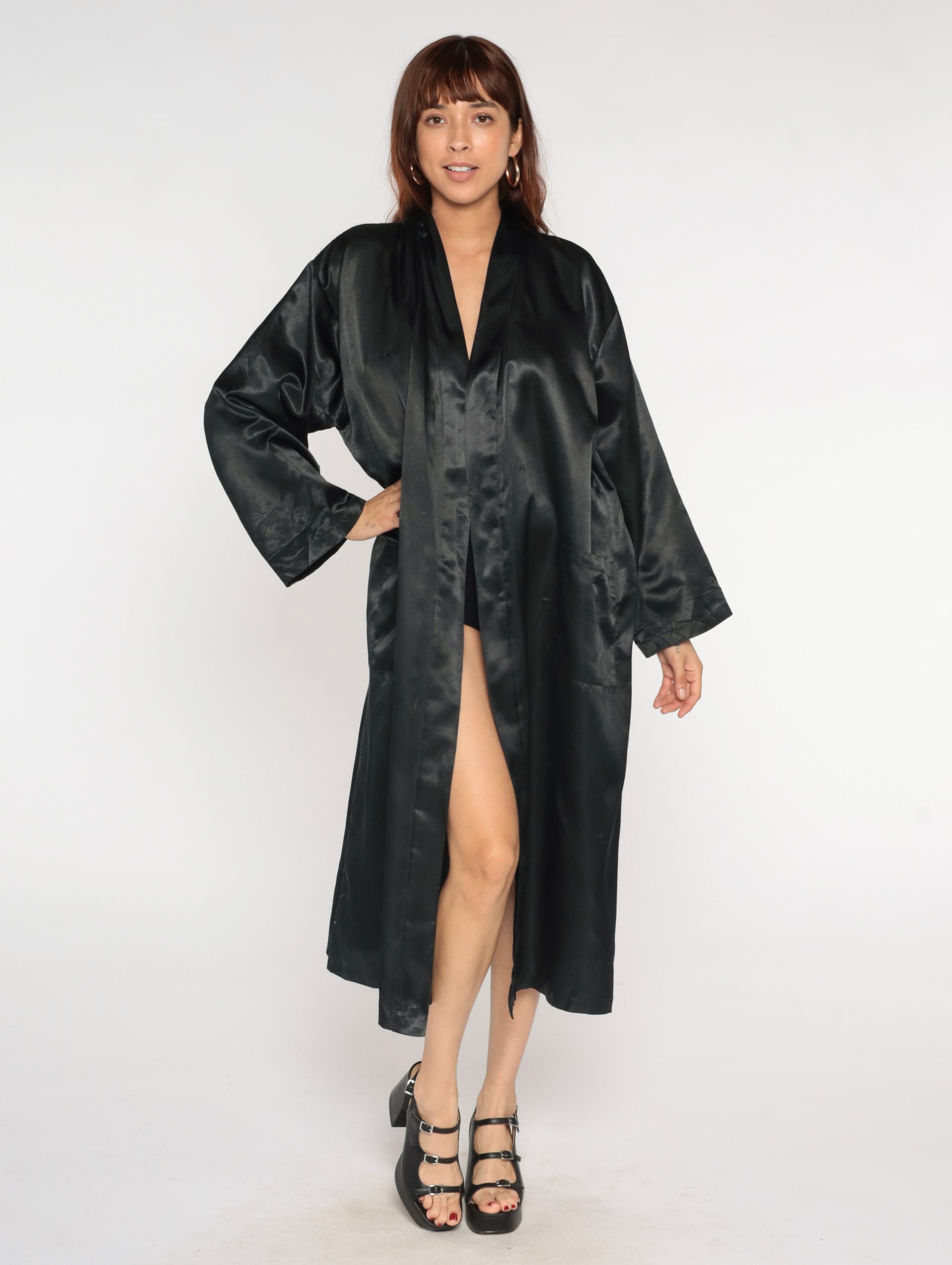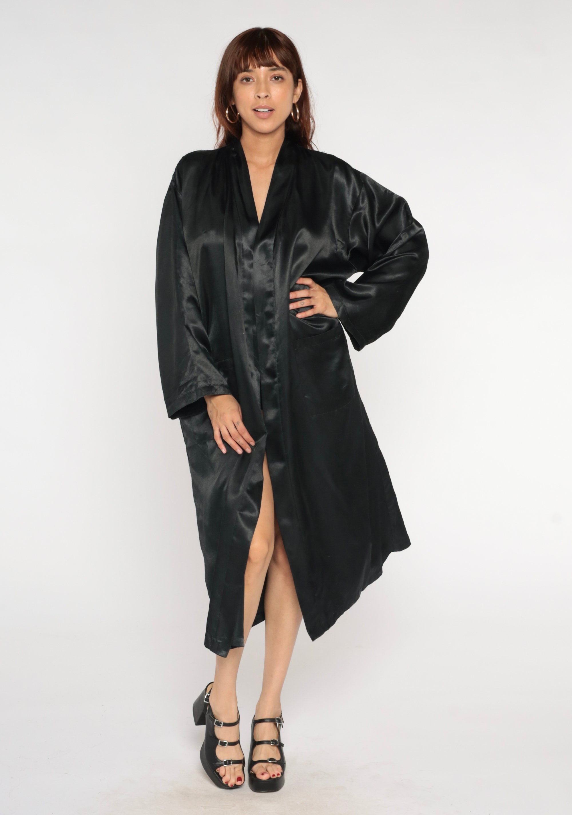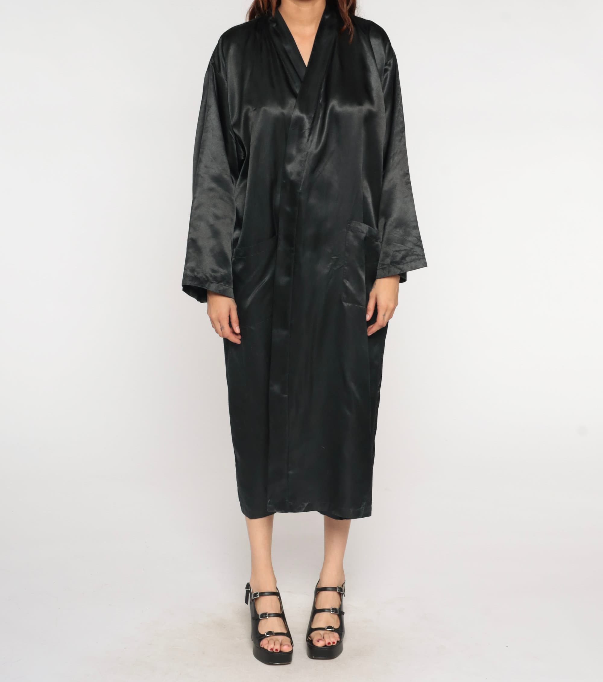 Vintage 90s kimono robe in black satin with an open front and floral embroidery on the back.