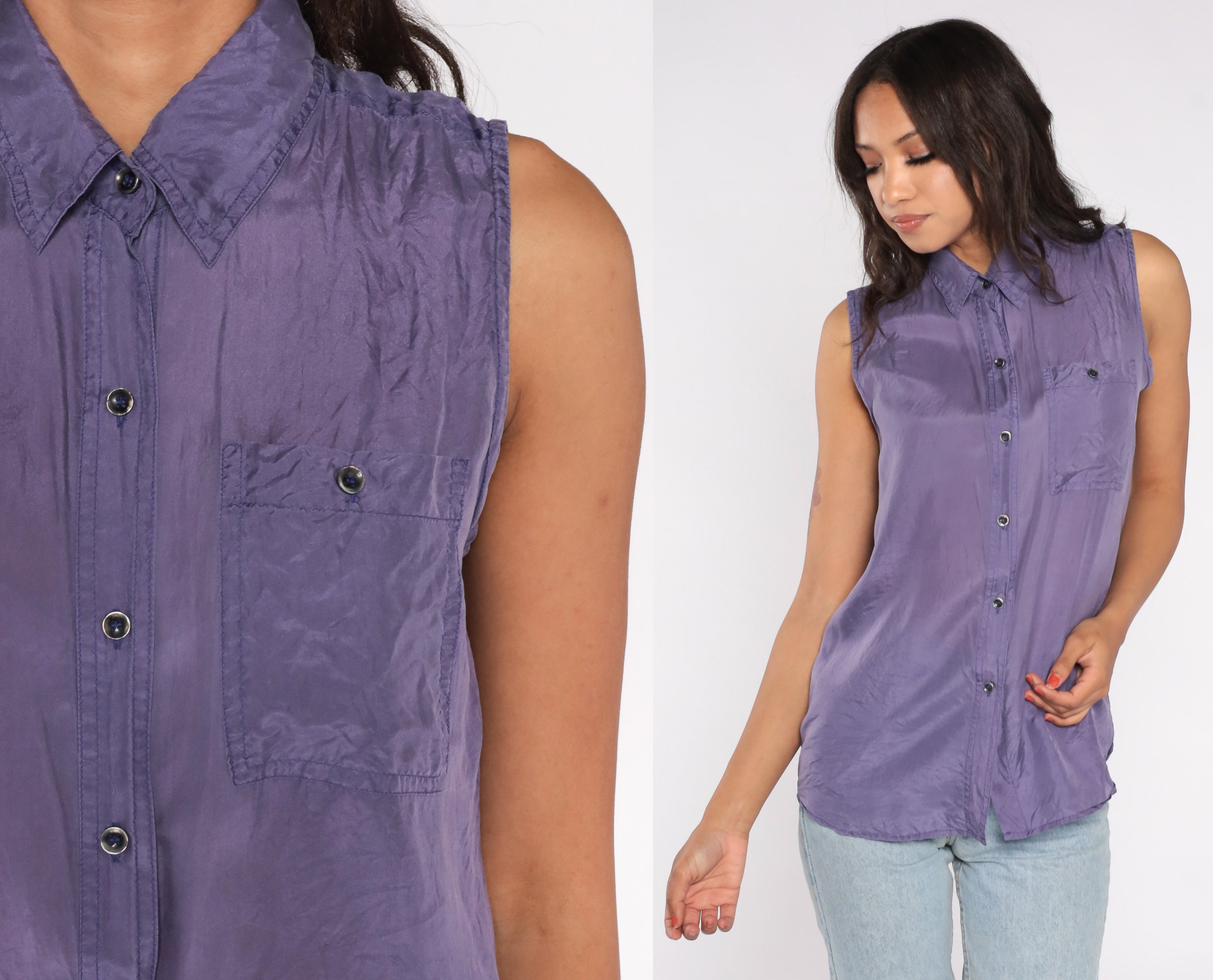 Vintage 90s blouse in purple silk. Sleeveless with buttons up the front.