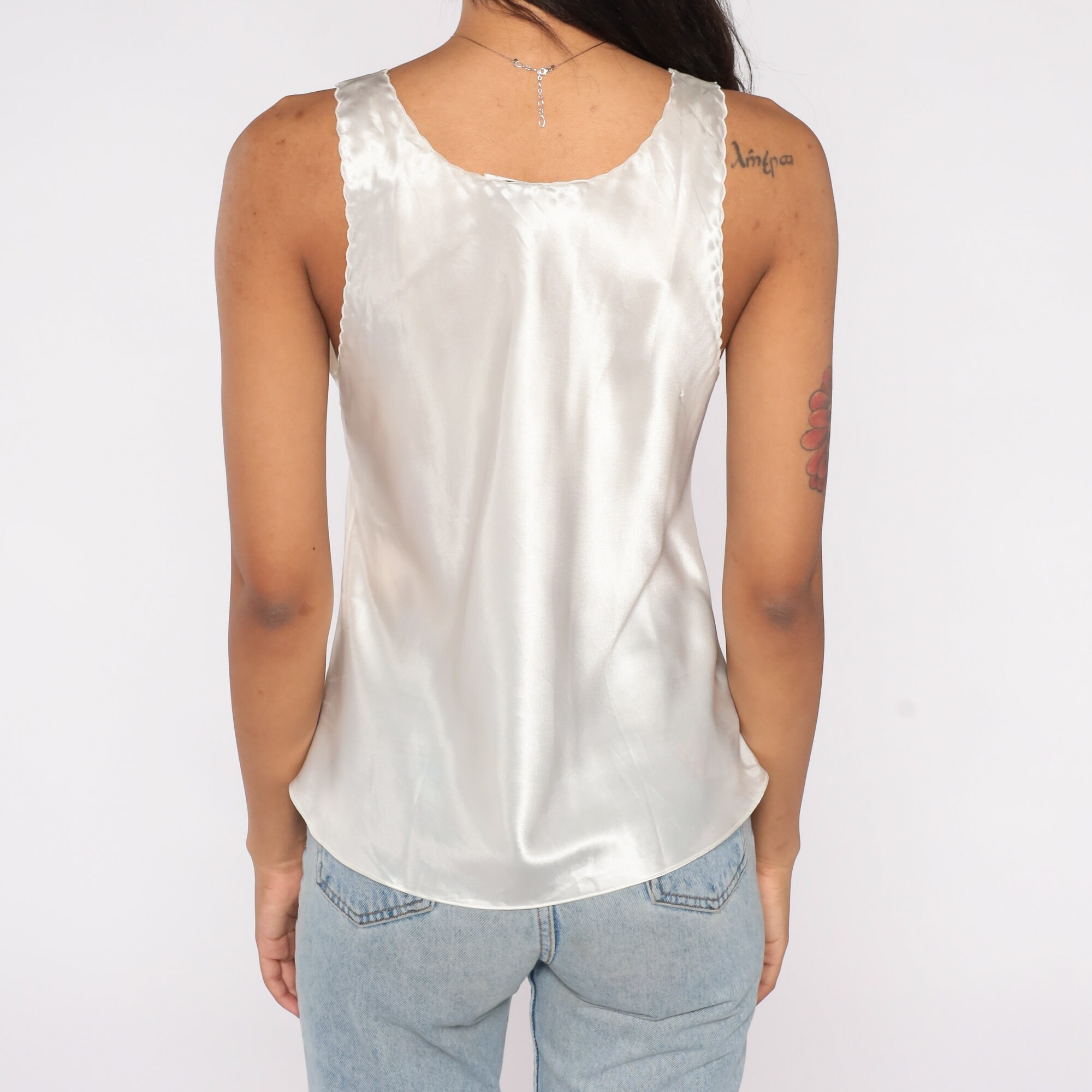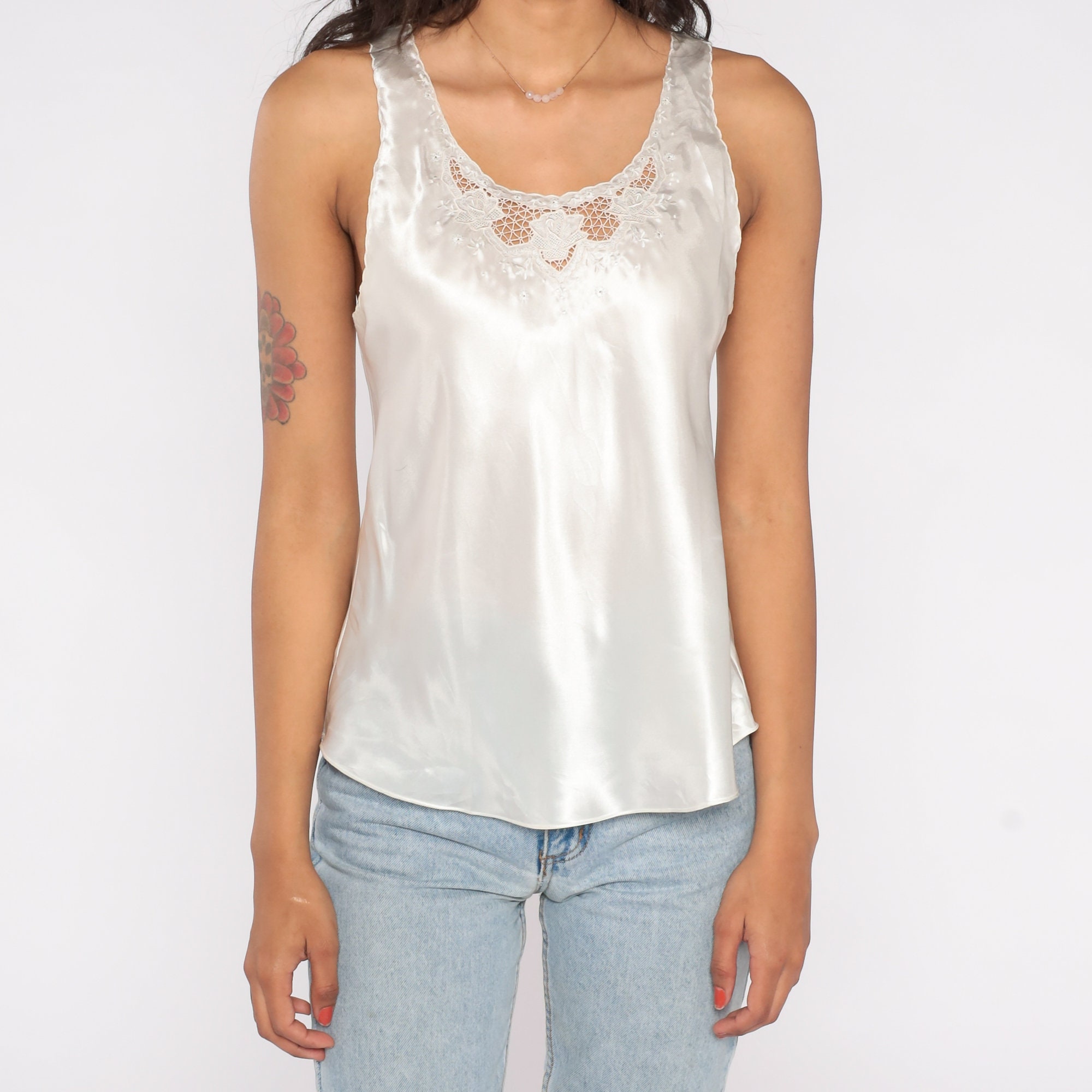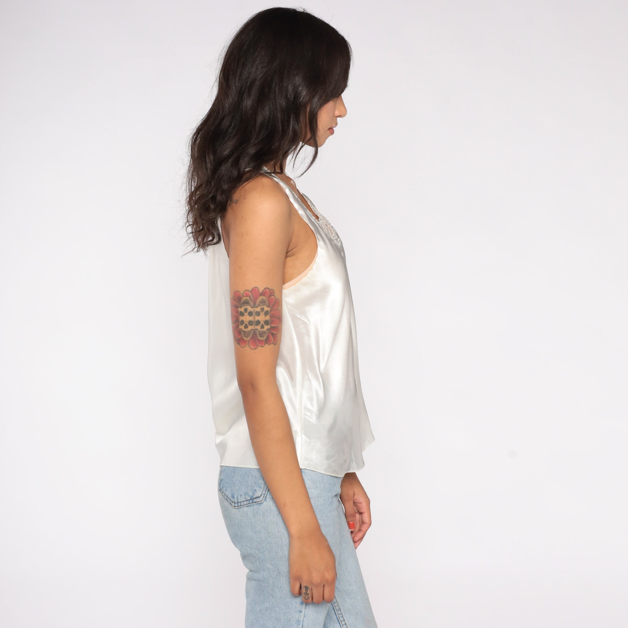 Vintage 90s top in white with floral embroidery and cutwork. Sleeveless with scalloped edges.