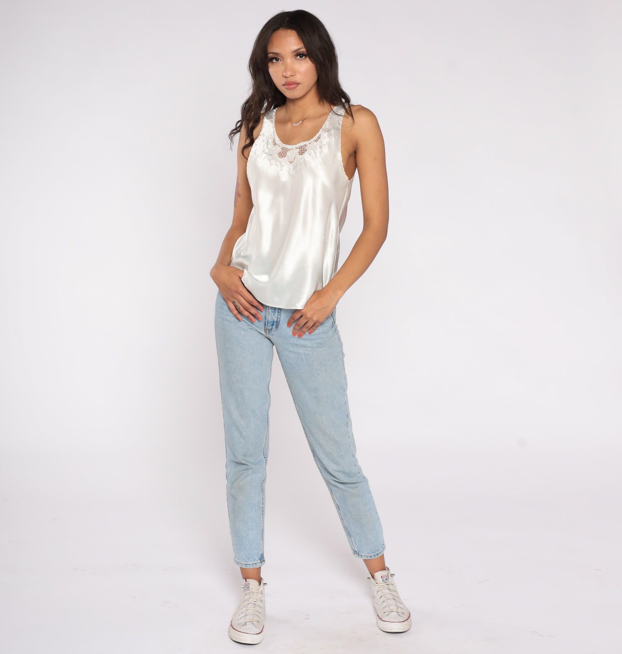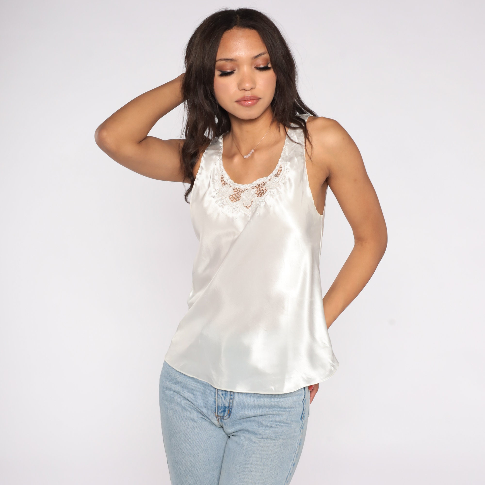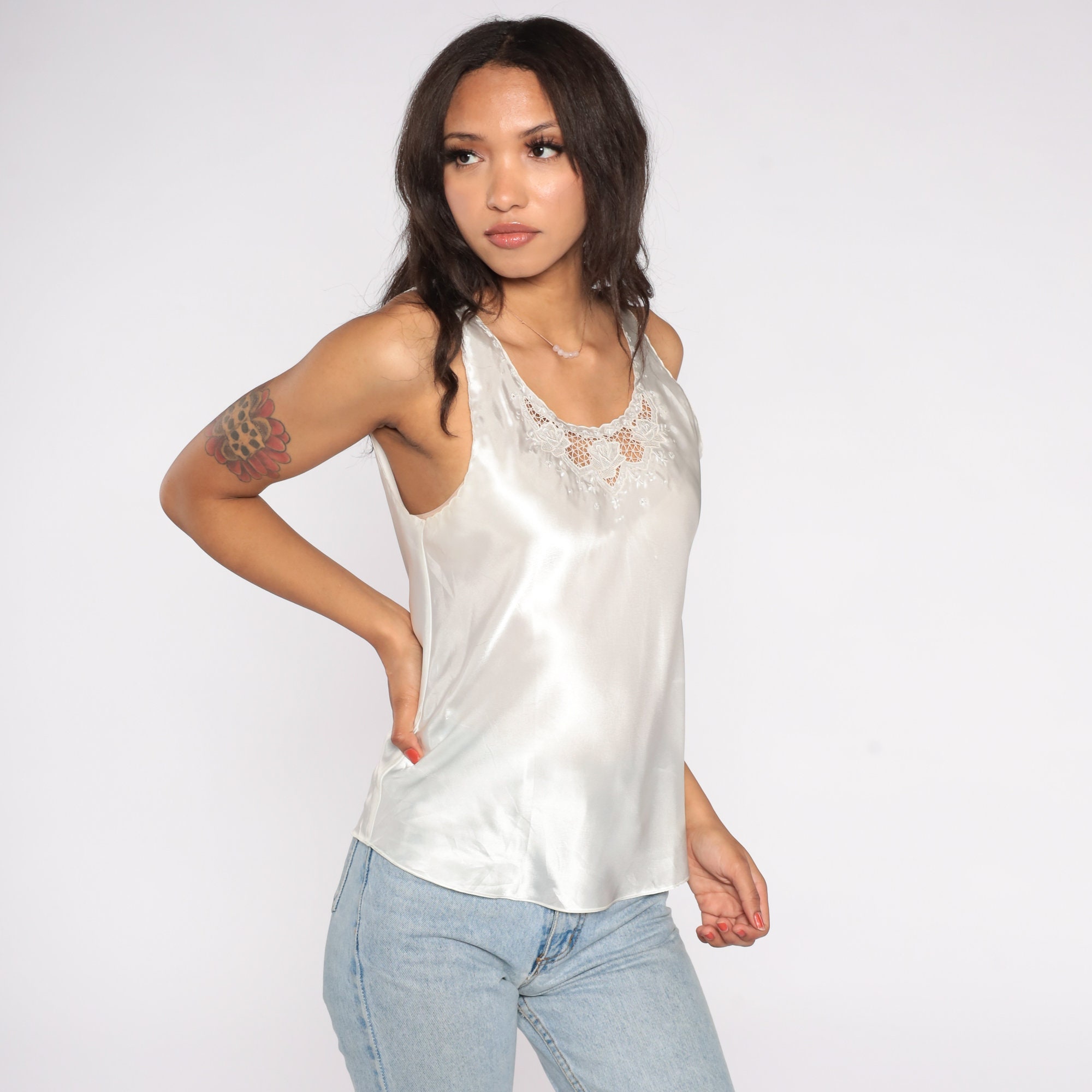 Vintage 90s top in white with floral embroidery and cutwork. Sleeveless with scalloped edges.