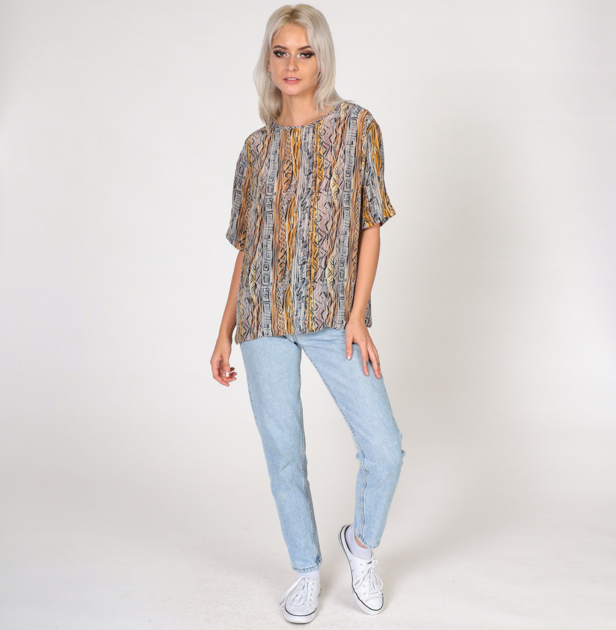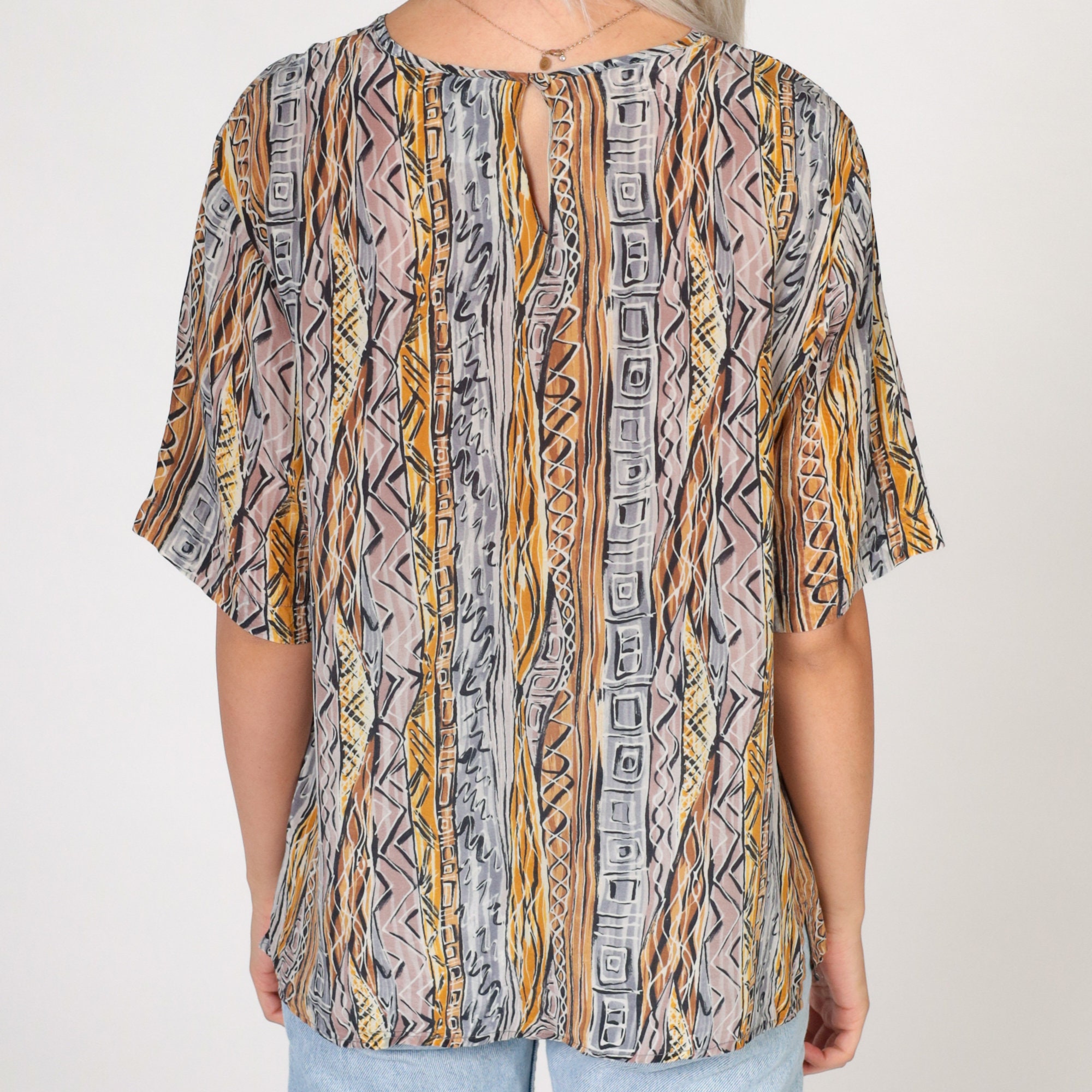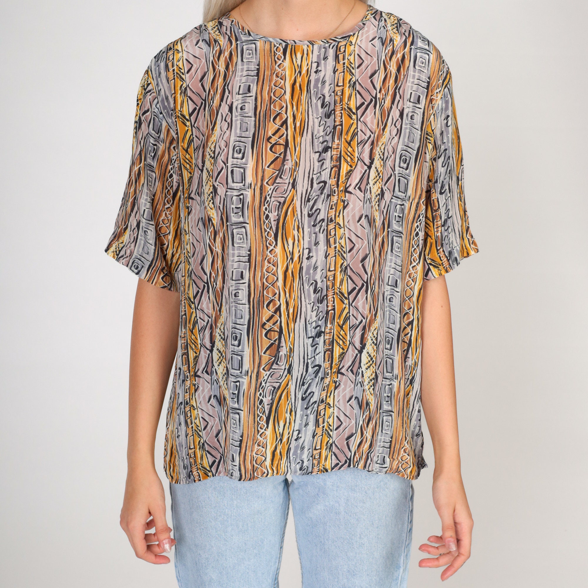 Vintage 90s silk shirt in an abstract print with short sleeves and a keyhole button in the back.