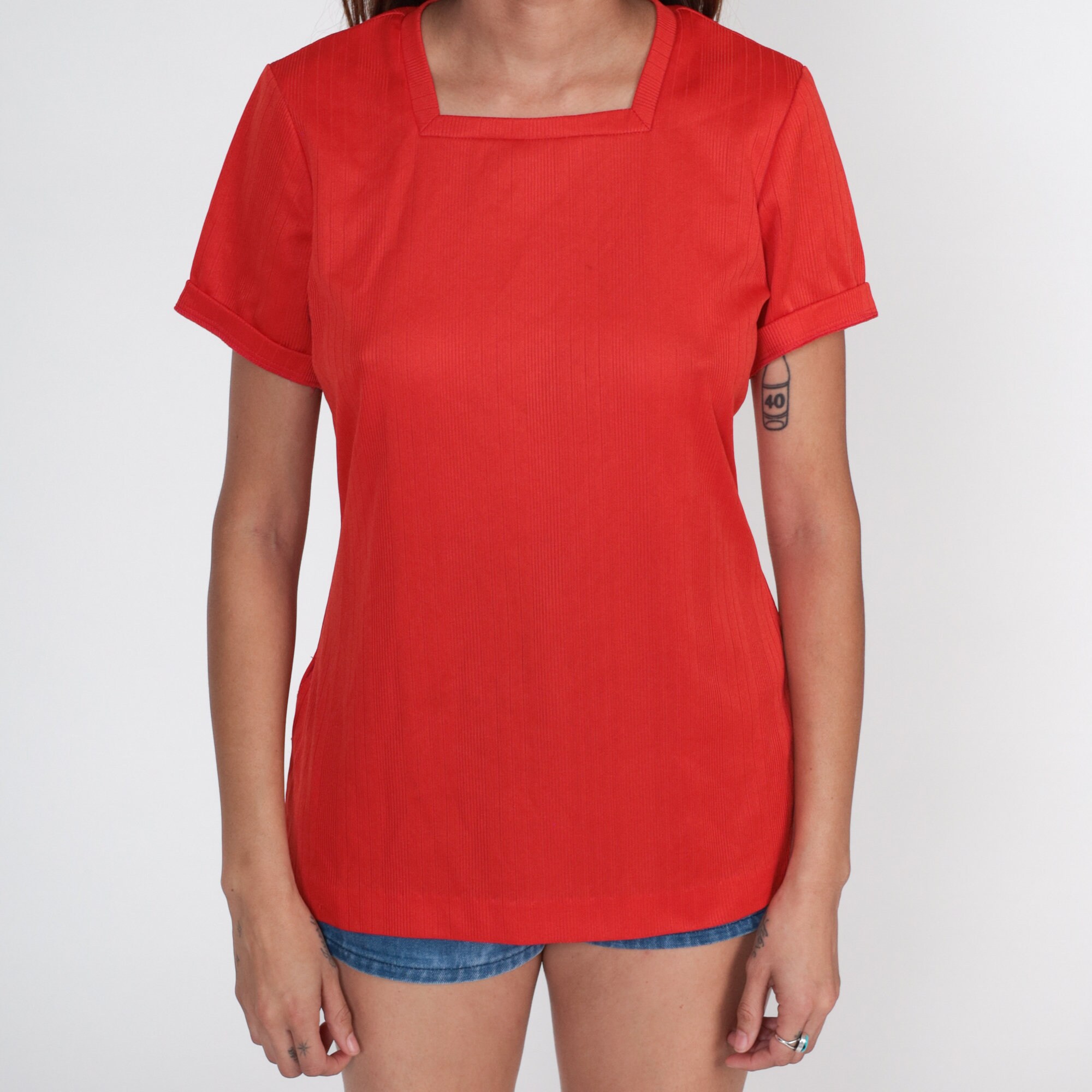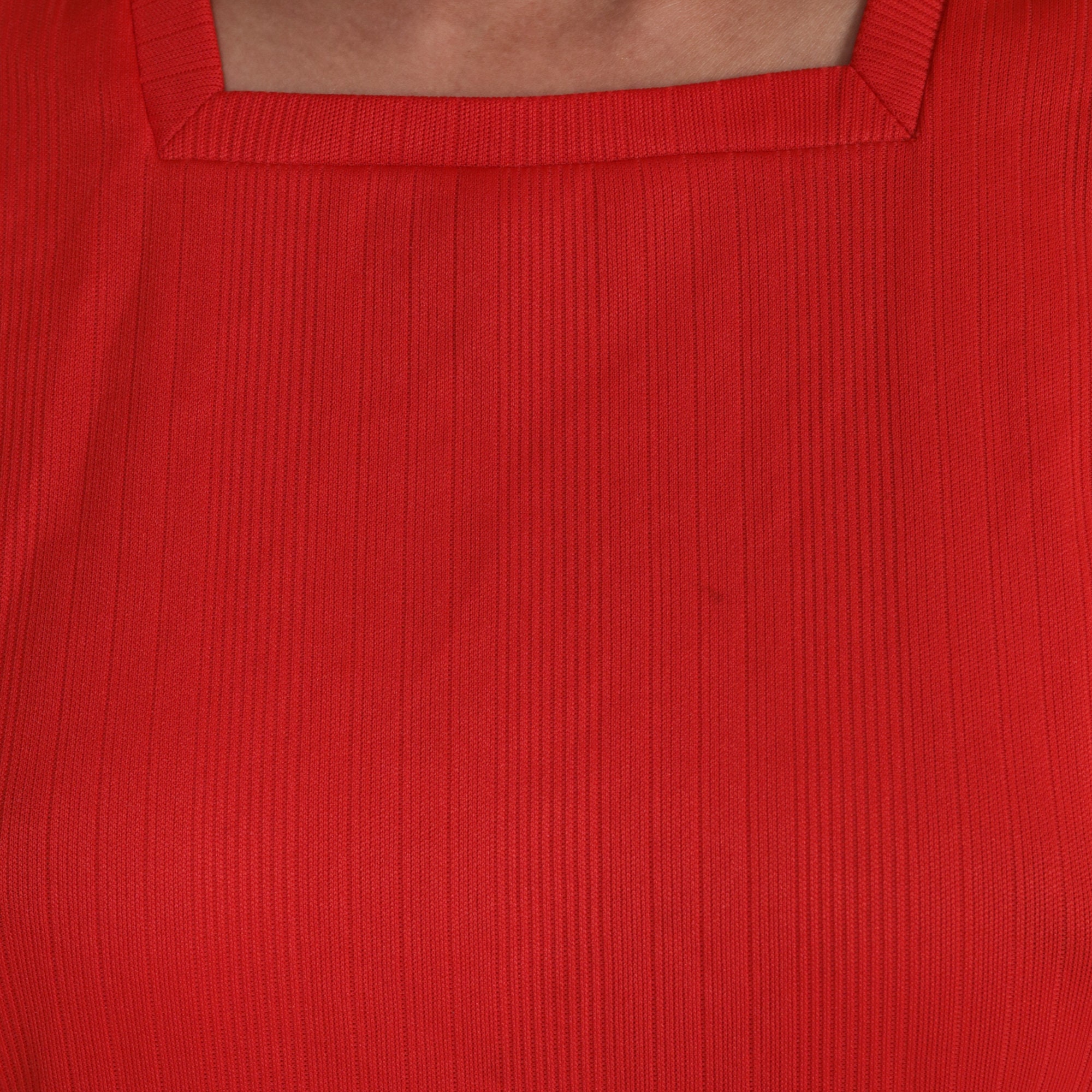 Vintage 70s top in ribbed red polyester with a square neckline and short sleeves.