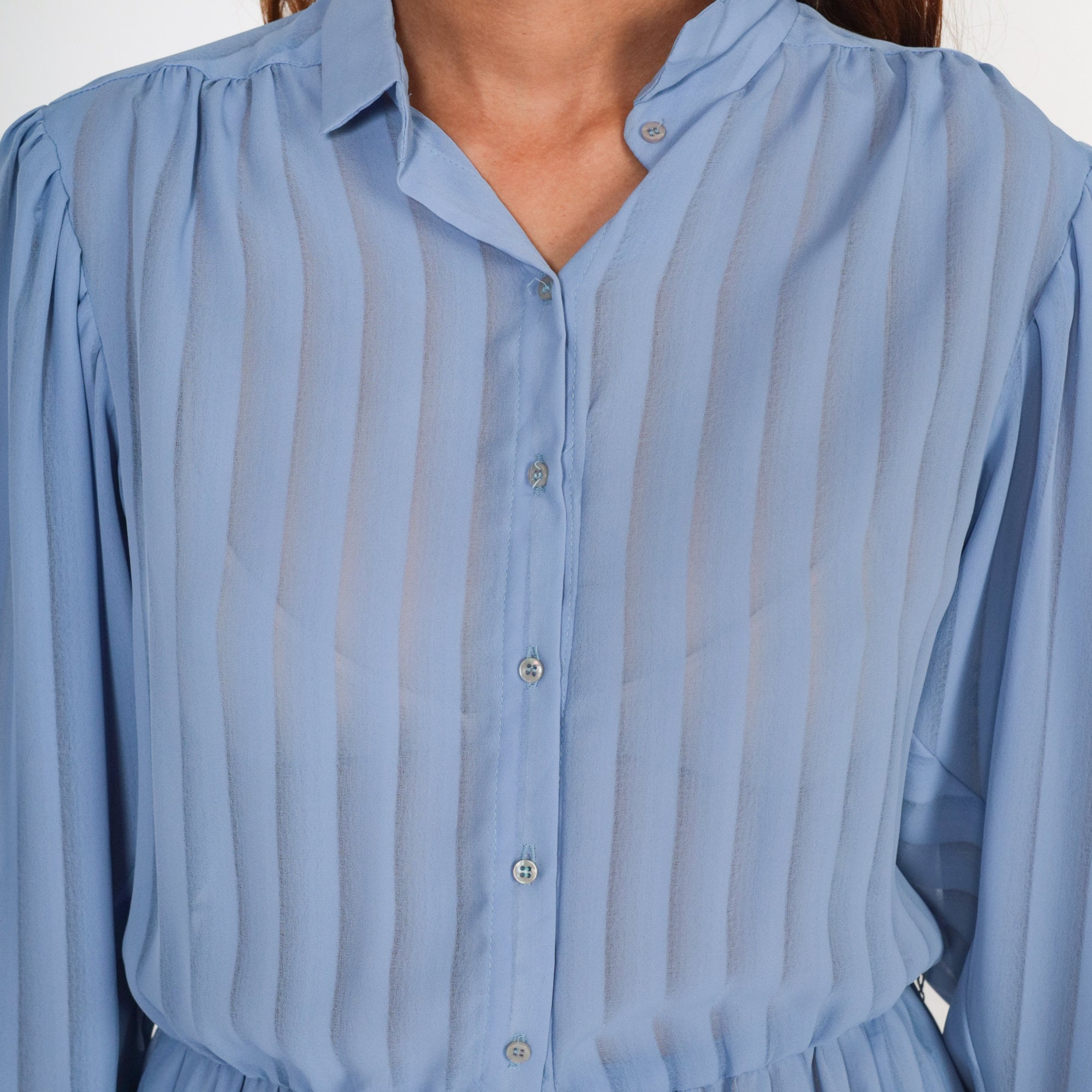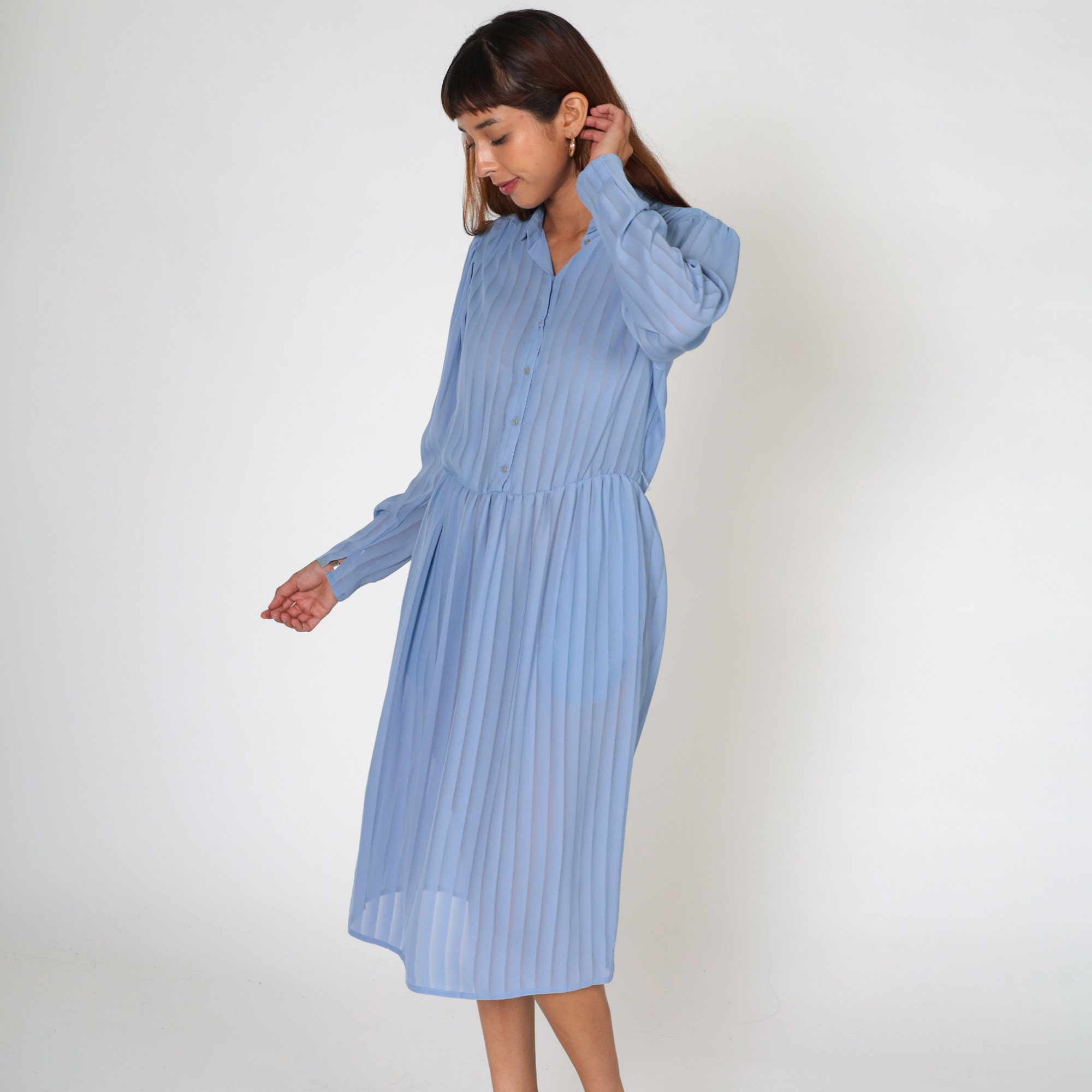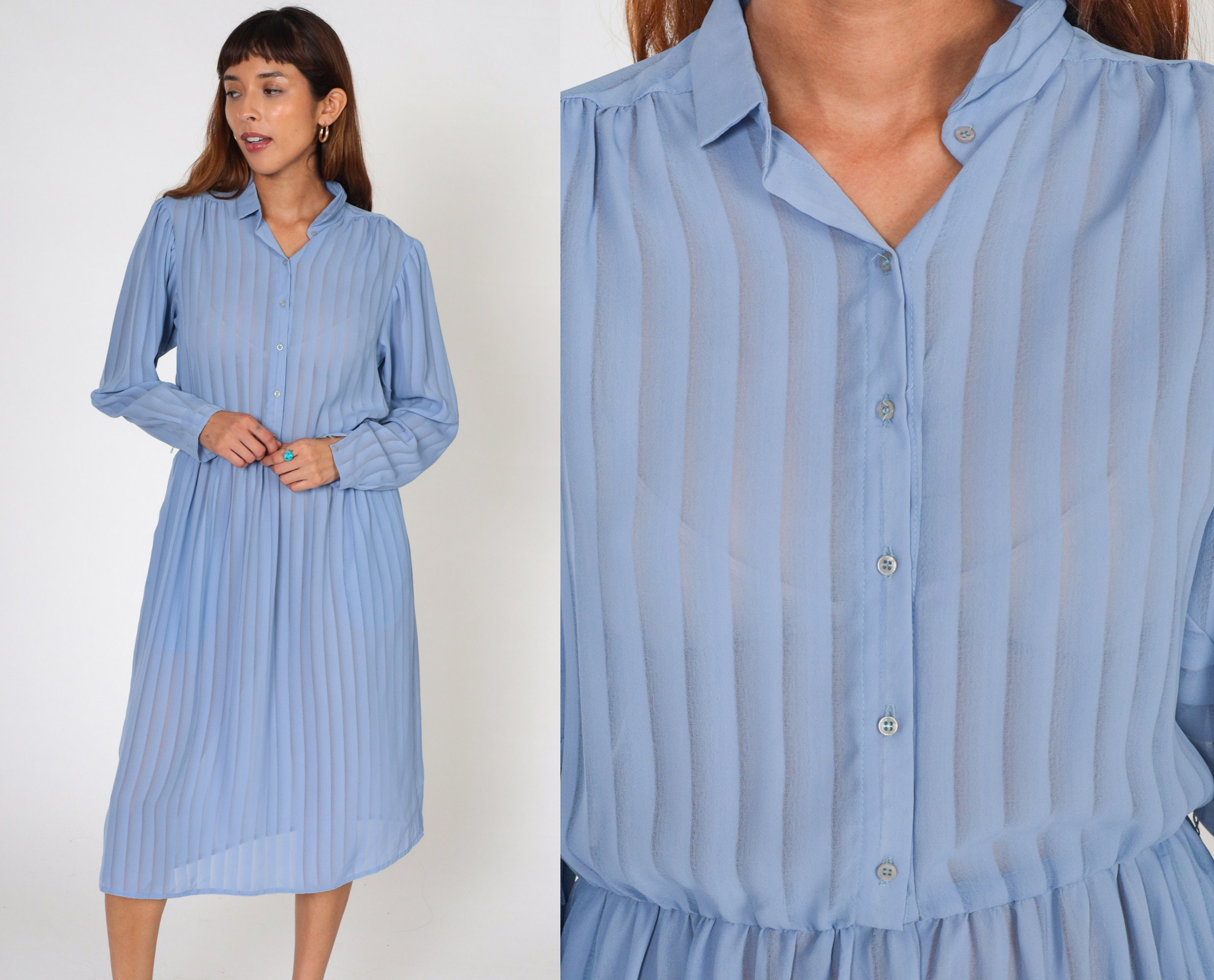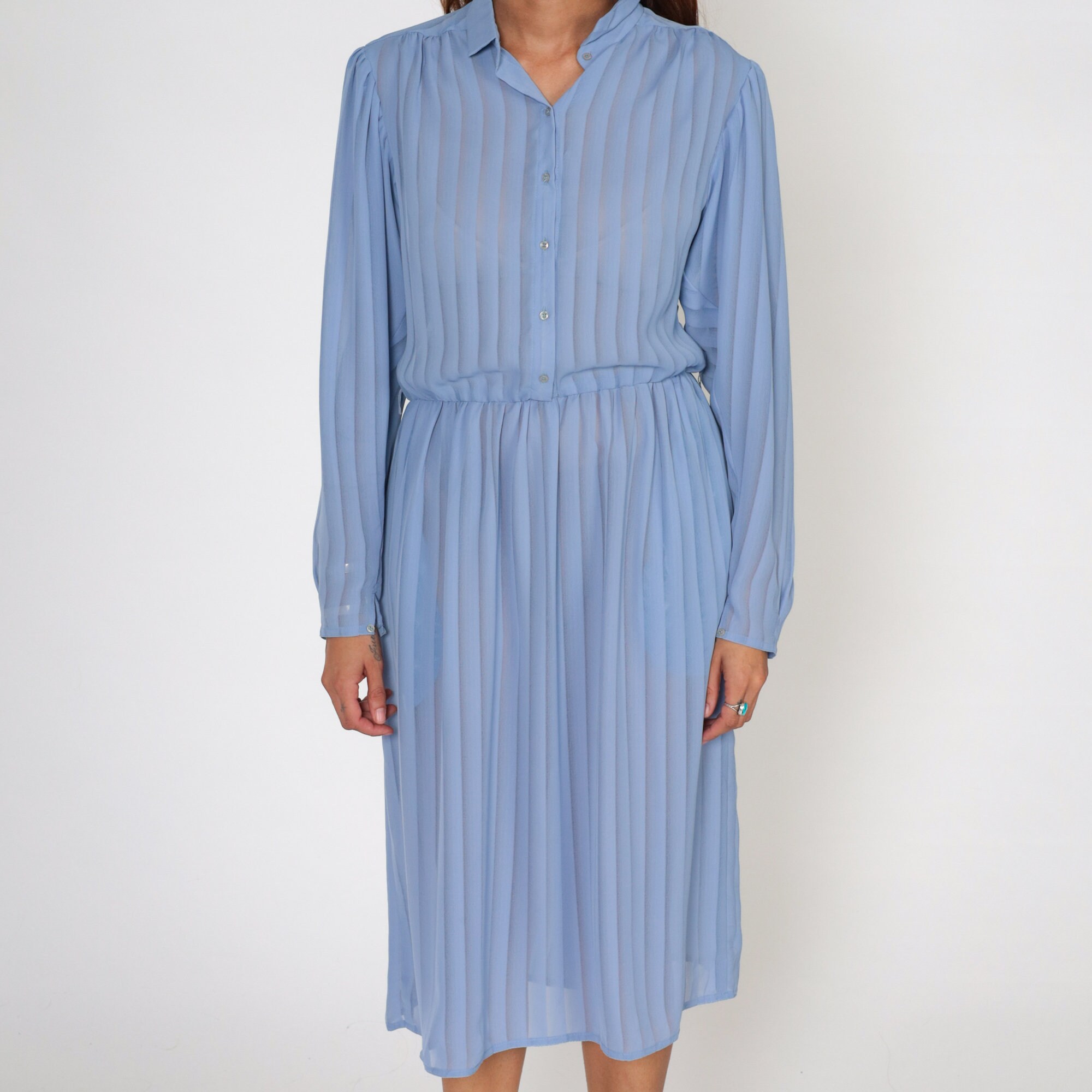 Vintage 80s dress in sheer periwinkle blue with a buttons up the chest. High waisted with puff sleeves. Midi length.