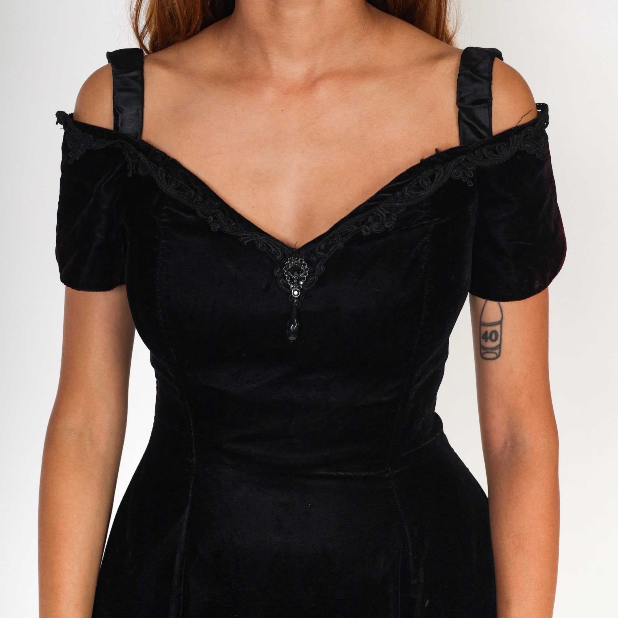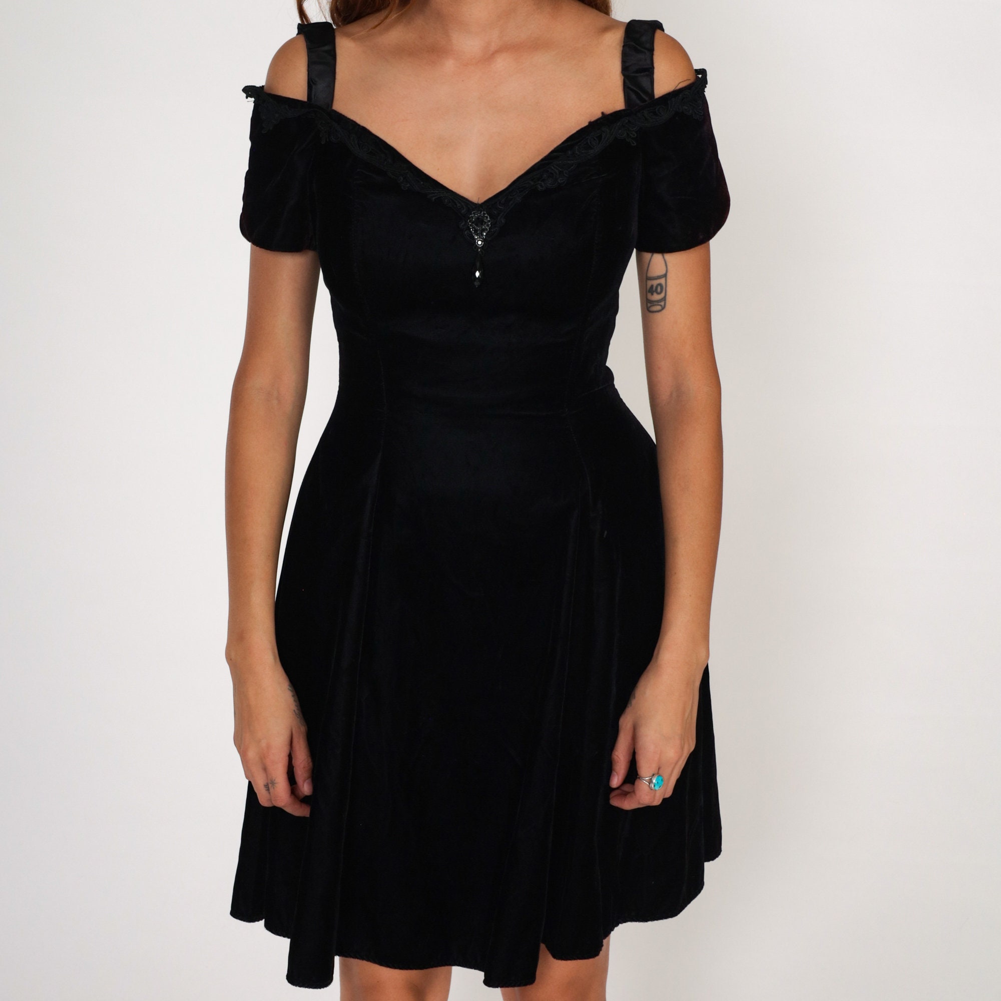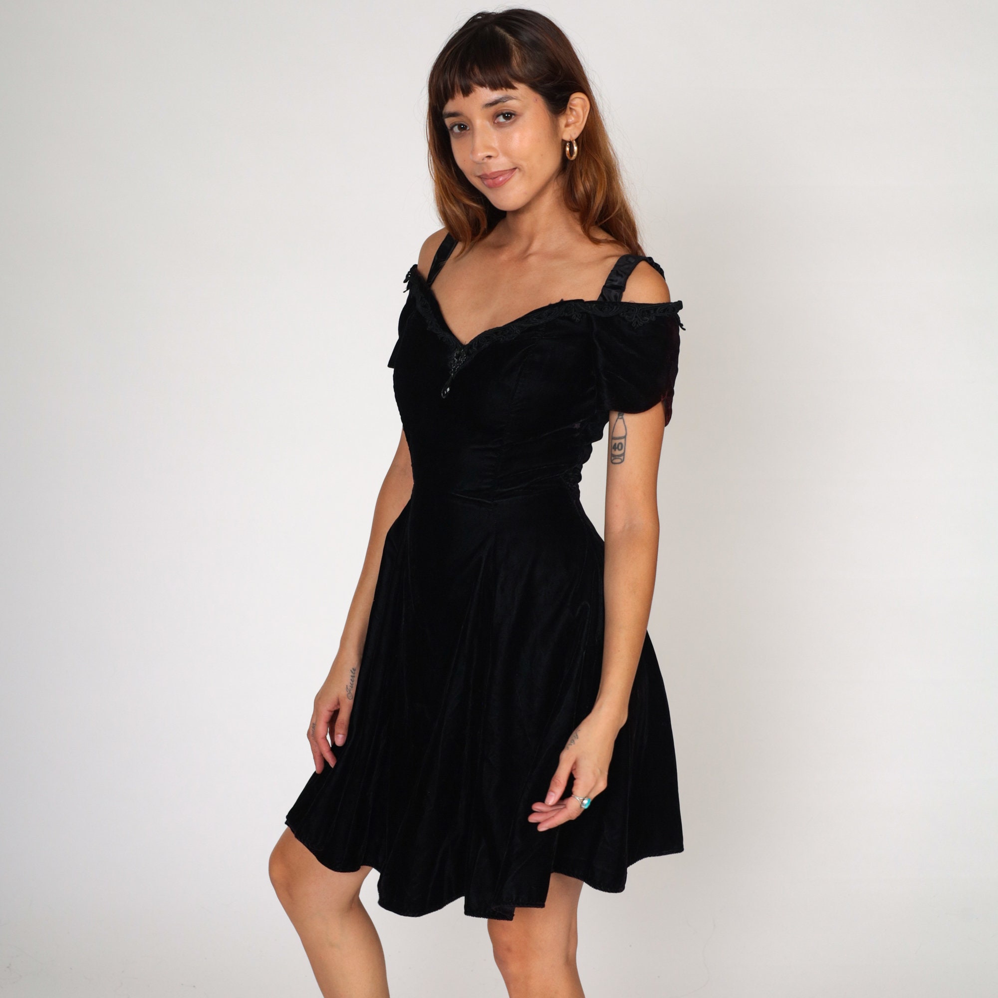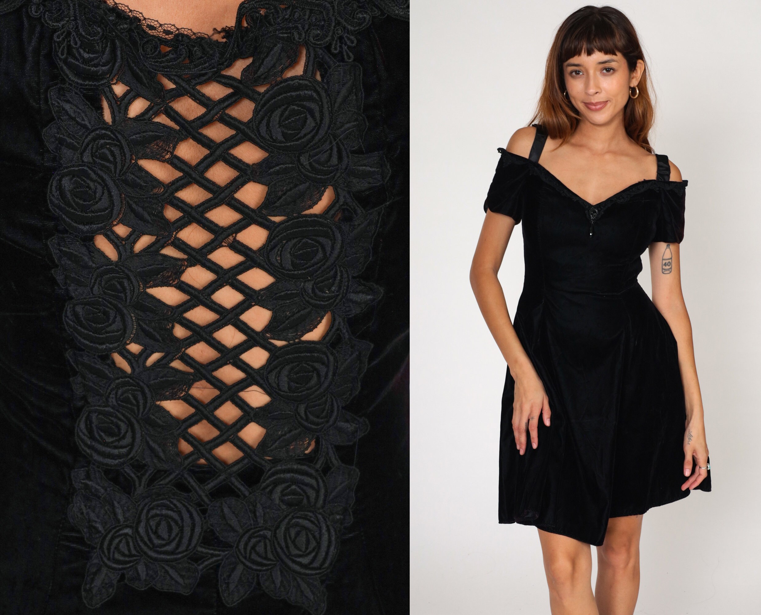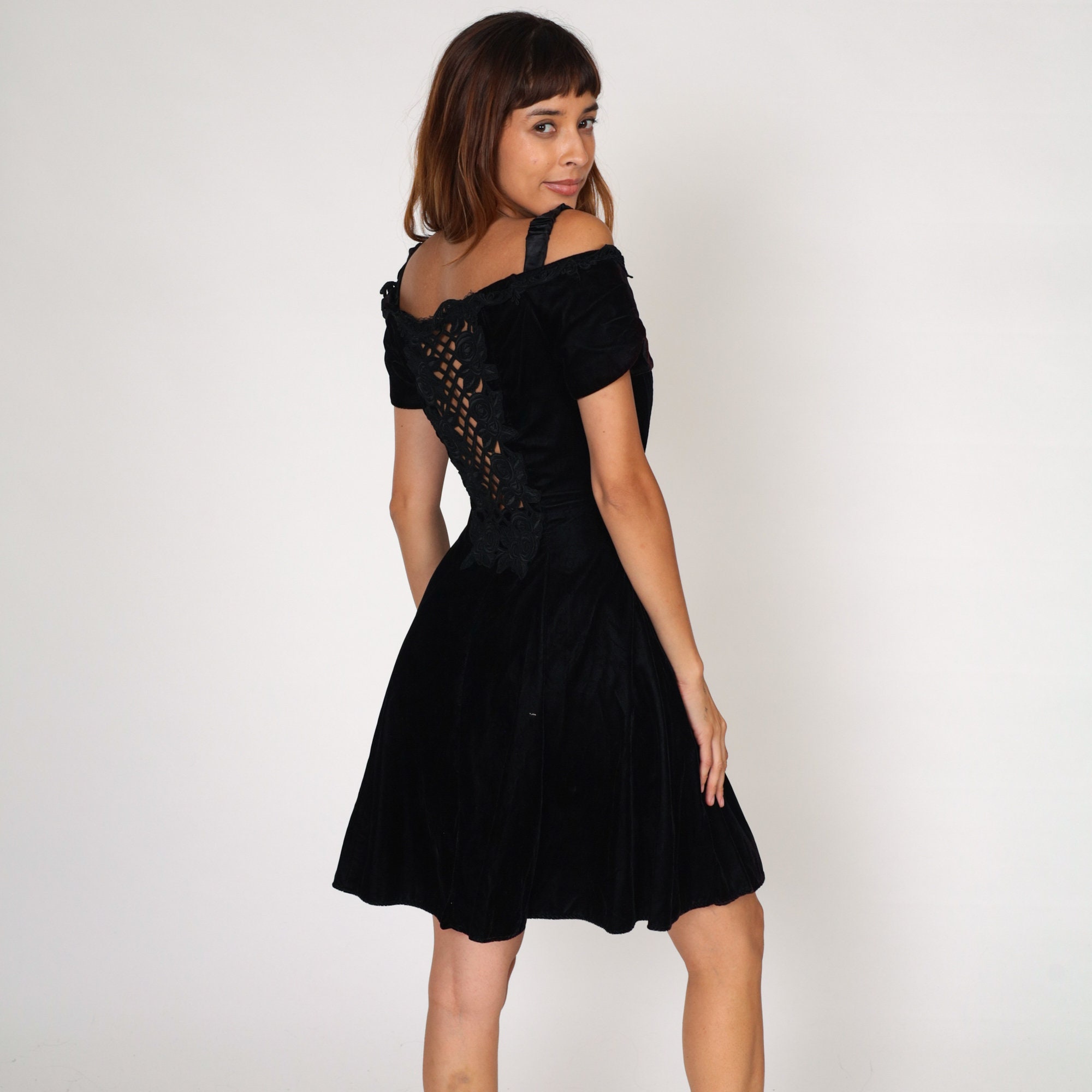 Vintage 80s 90s dress in black velvet with an off-shoulder neckline, lace trim, a cutout back, and a flared skirt.