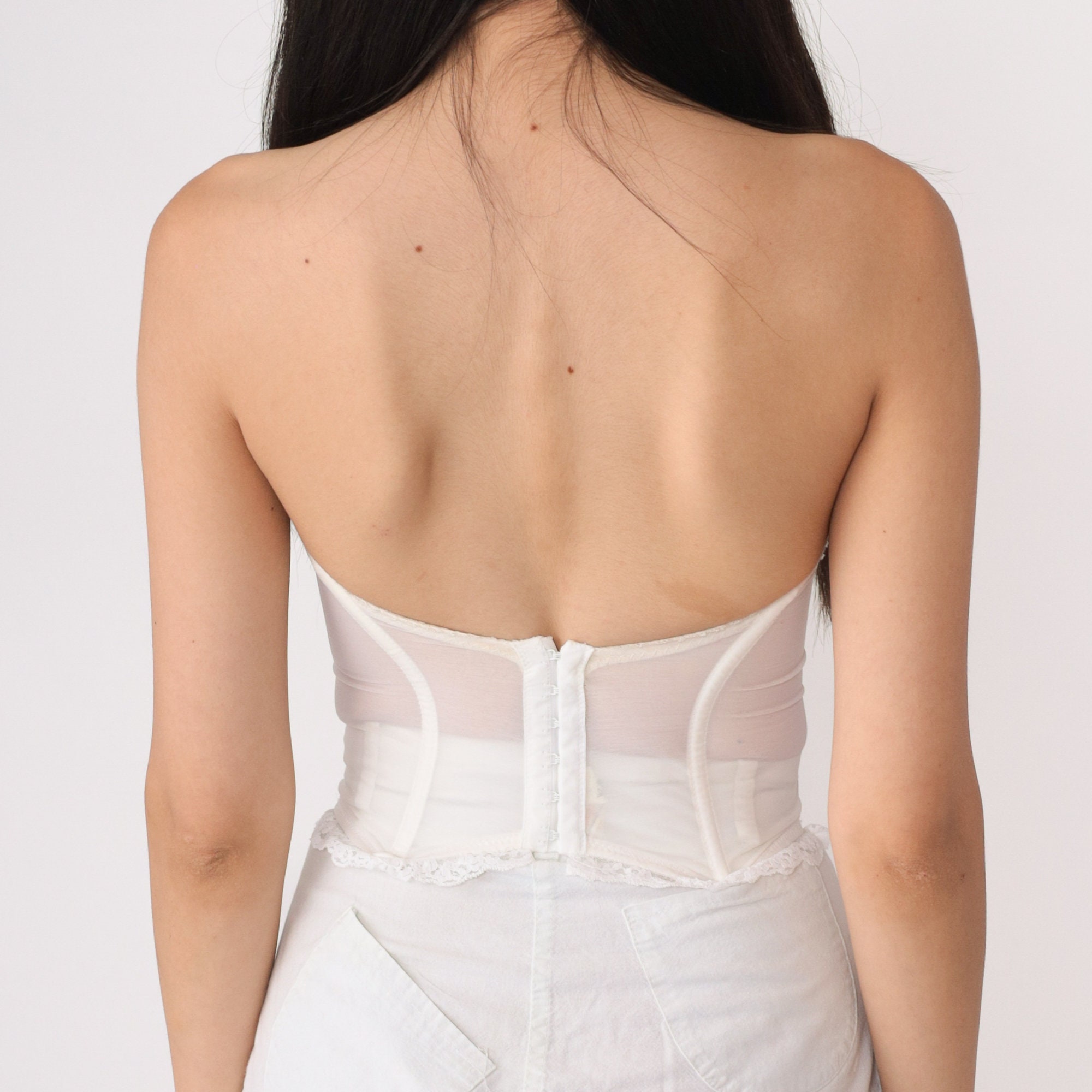 Vintage 80s corset bra top in white floral lace. Boned with a strapless sweetheart cut. Hook and eye closures up the back.