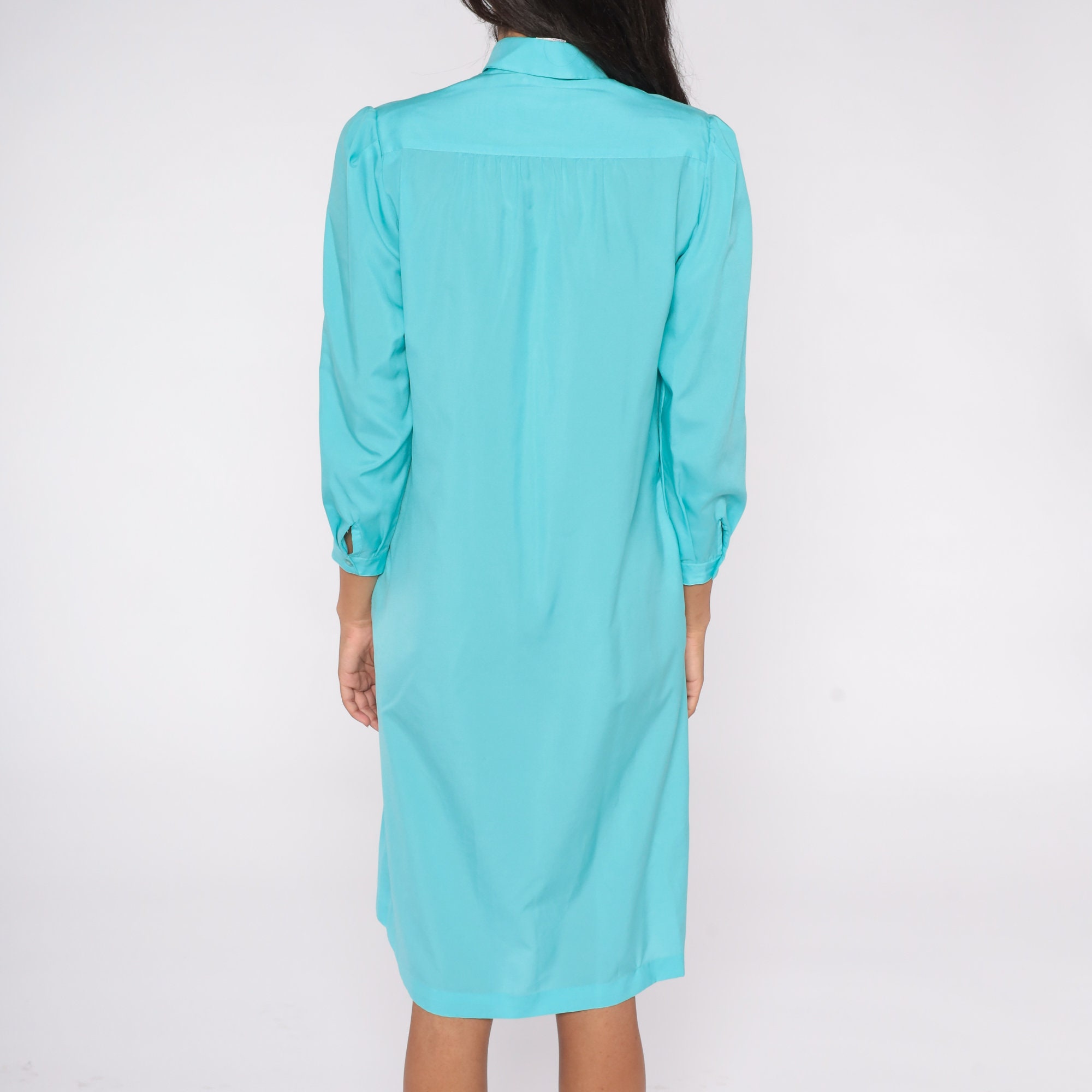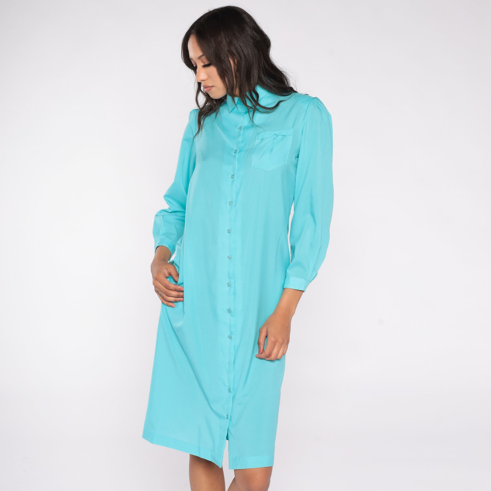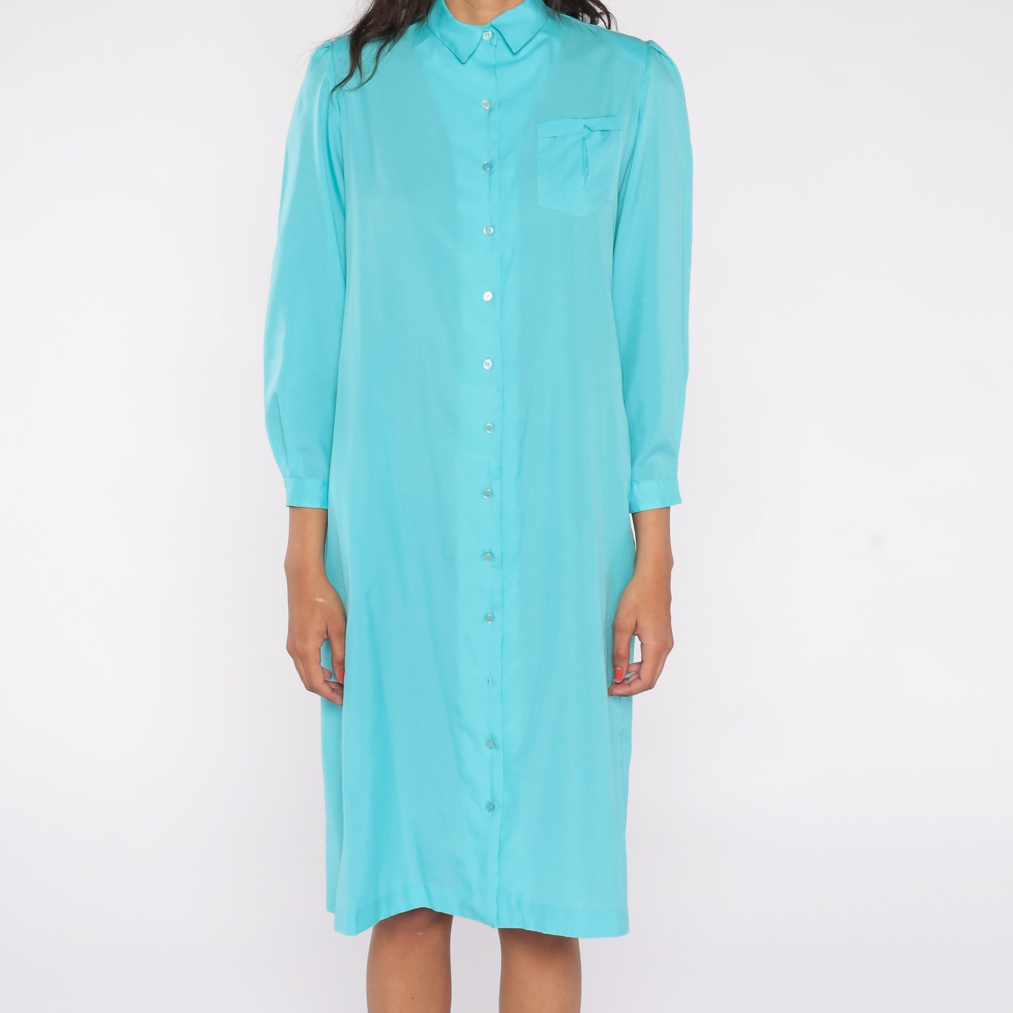 Vintage 80s dress in turquoise blue with puff sleeves, a shift cut and buttons up the front. Midi length.
