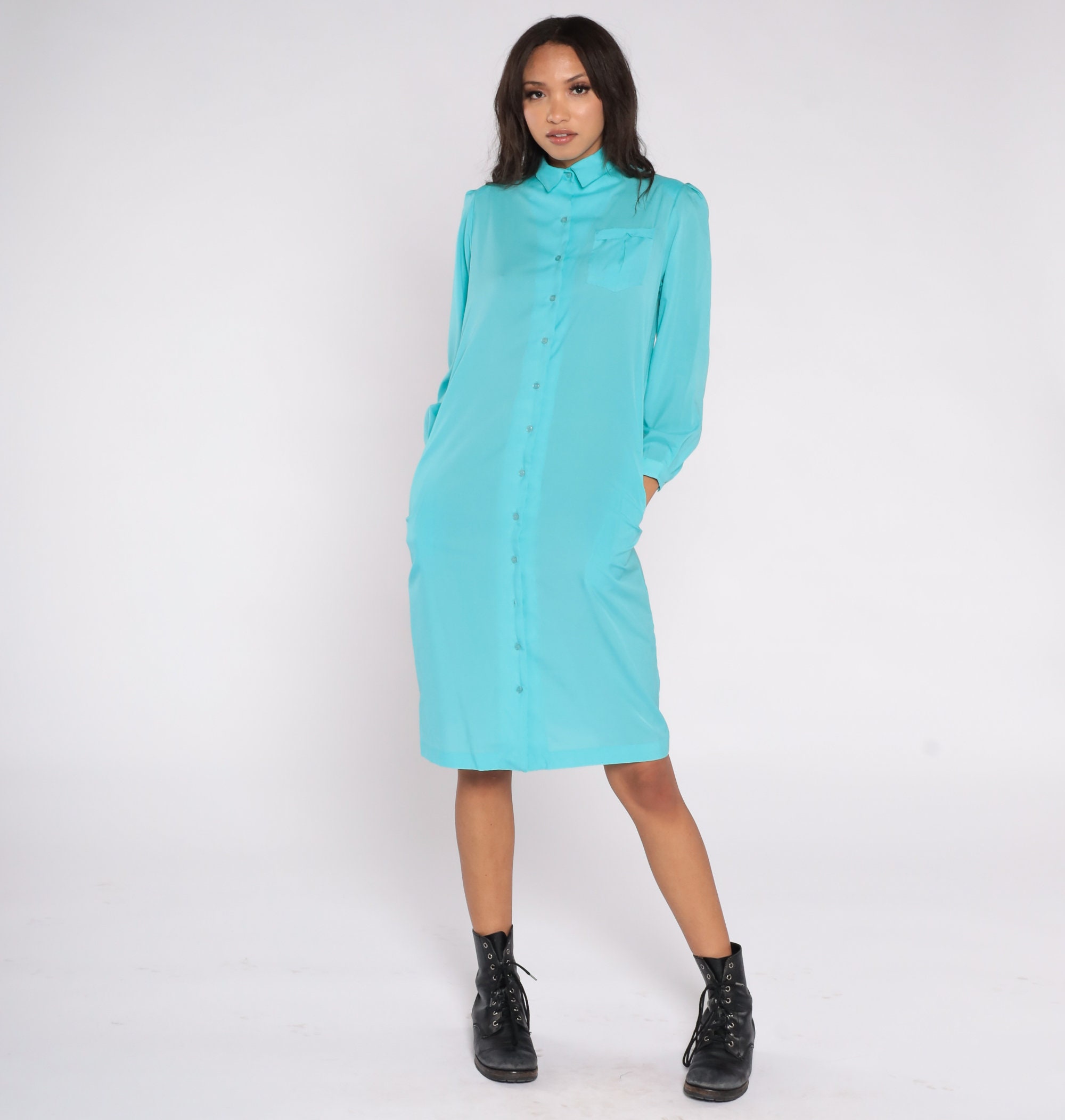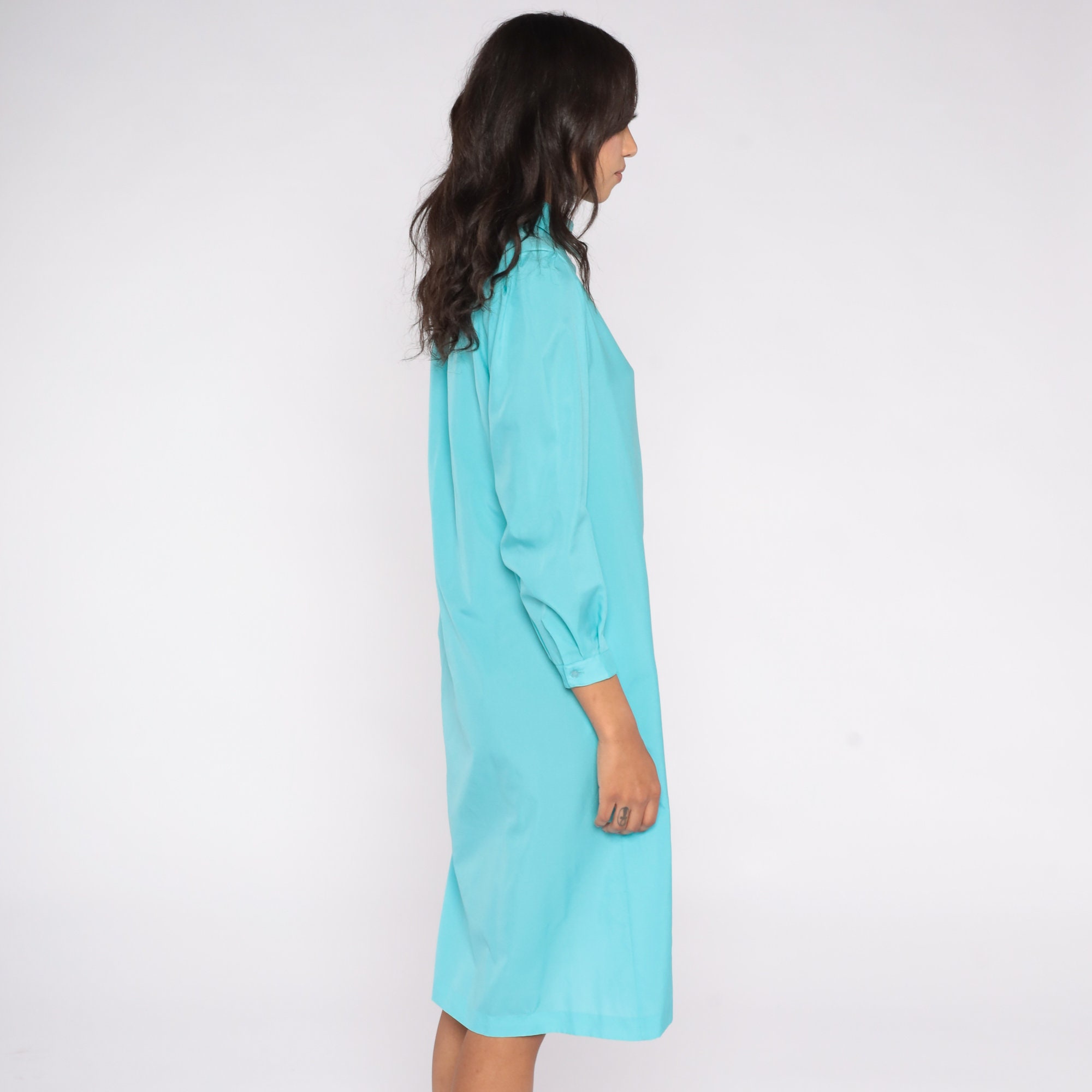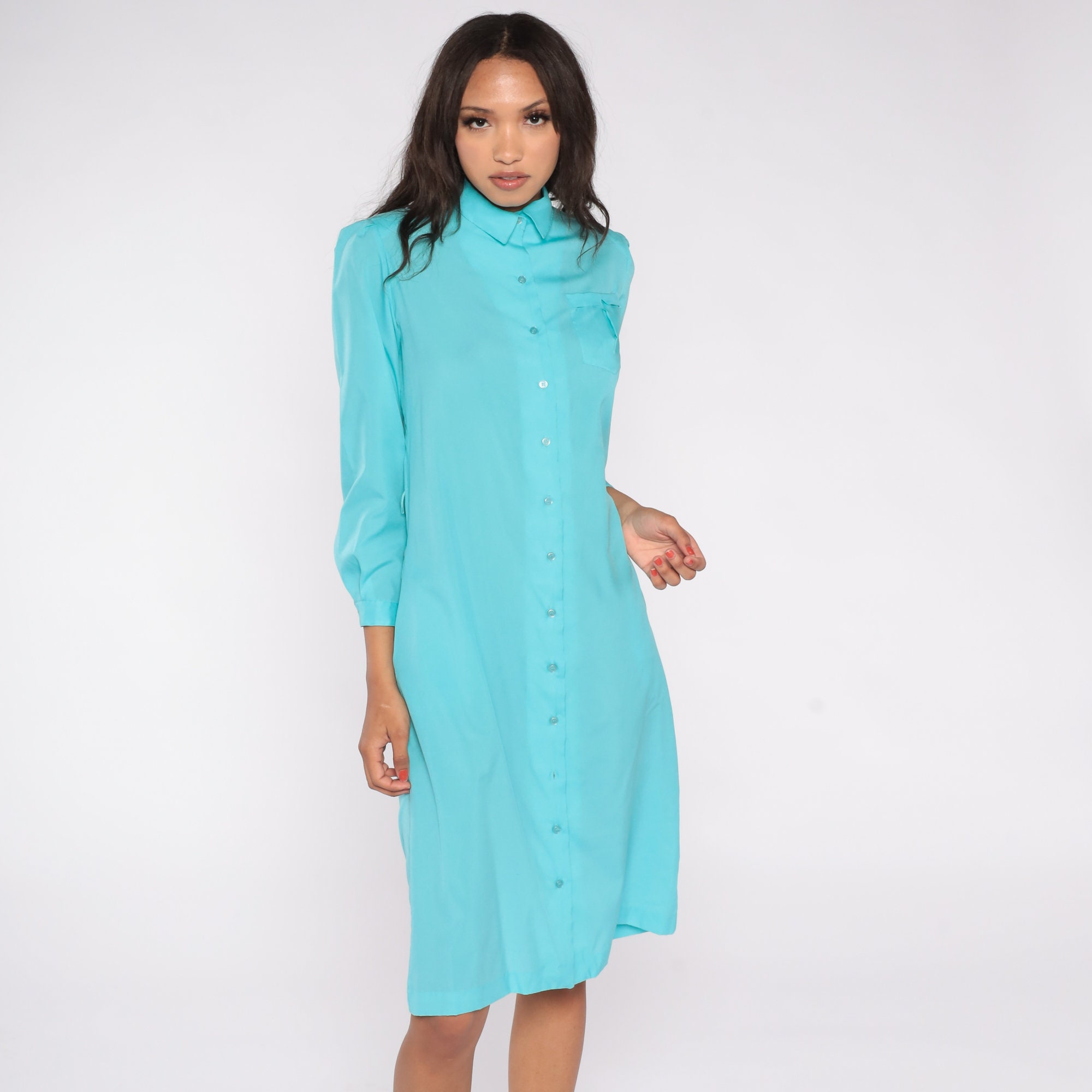 Vintage 80s dress in turquoise blue with puff sleeves, a shift cut and buttons up the front. Midi length.