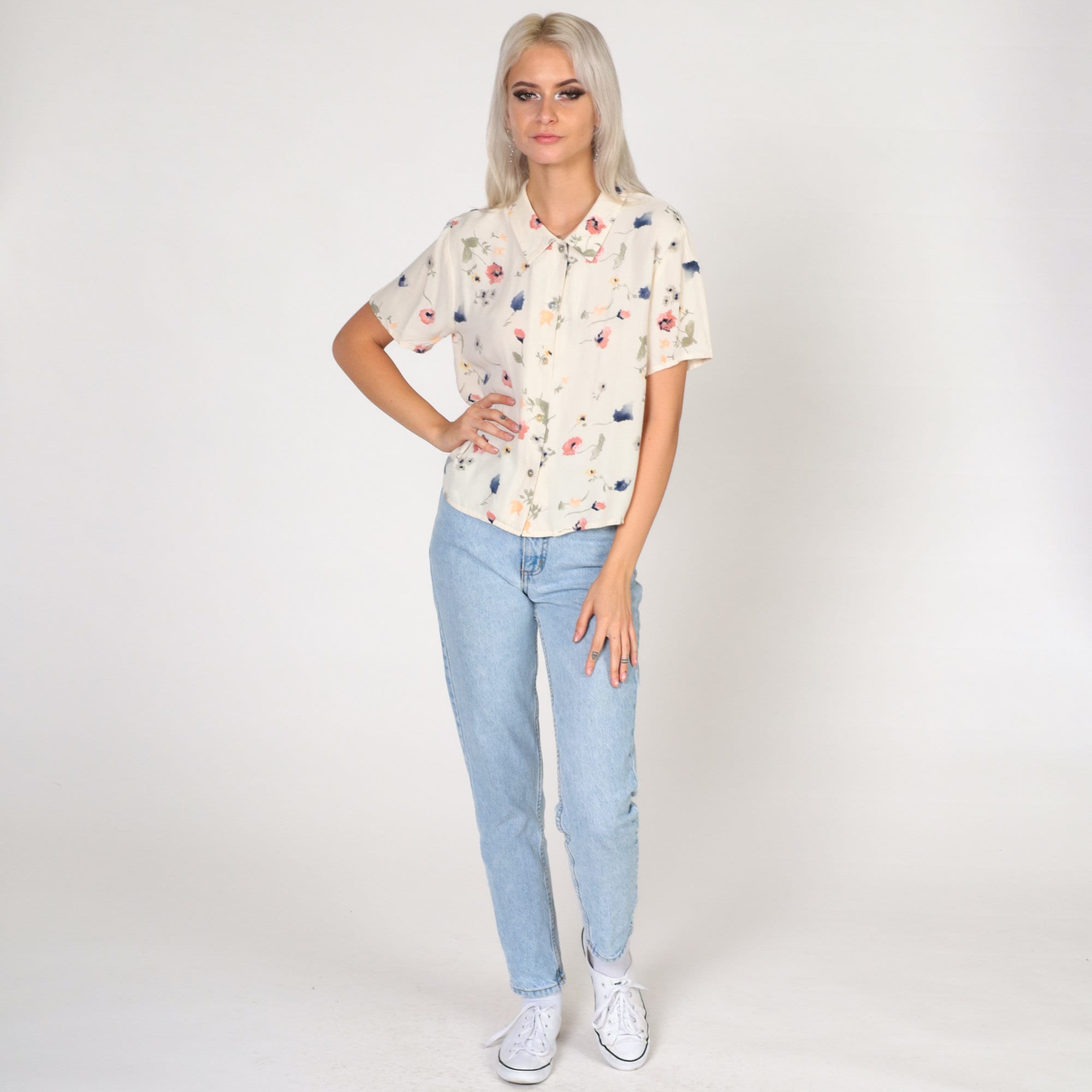 Vintage 90s shirt in cream with a watercolor floral print. It has short sleeves and buttons up the front with a collar.