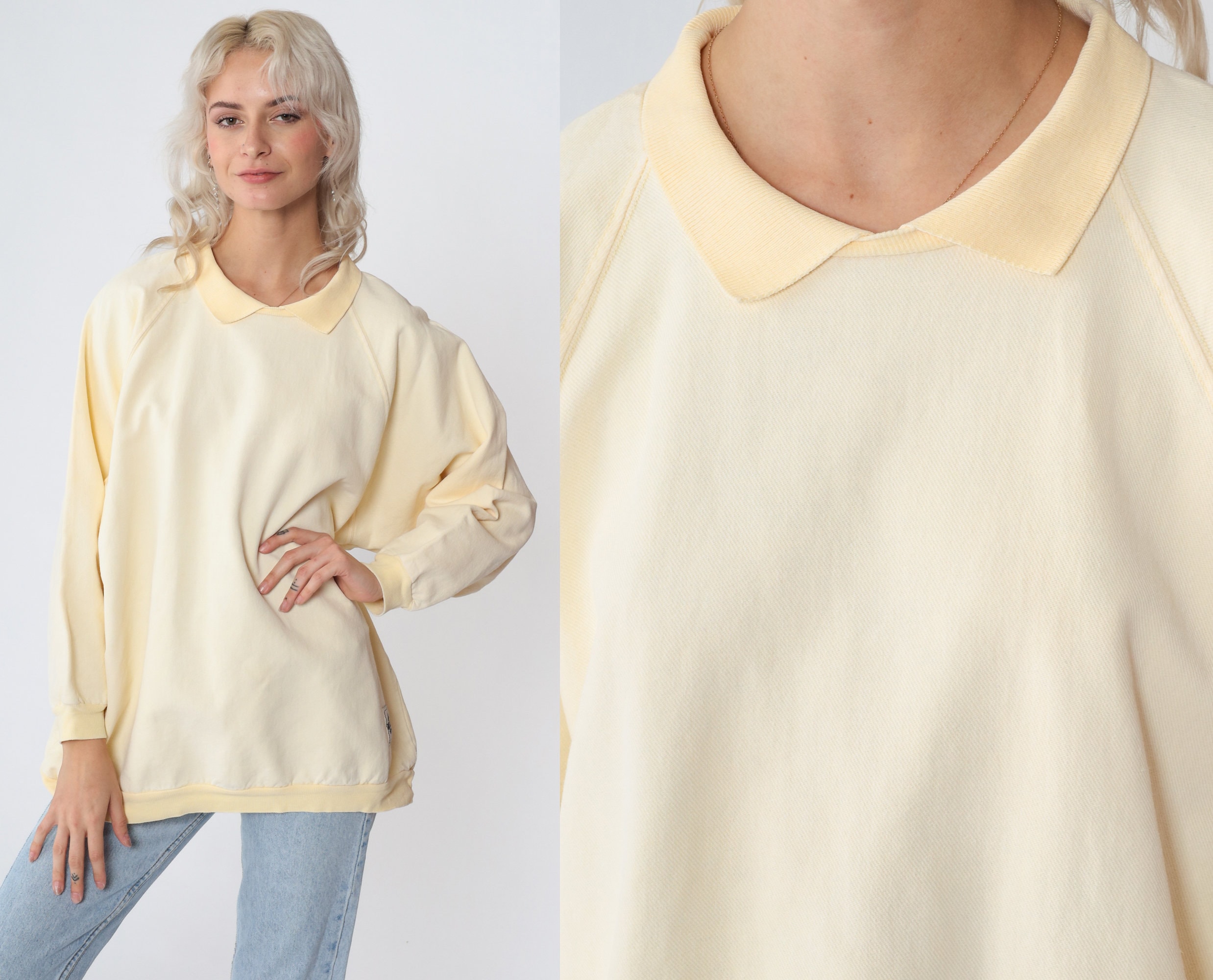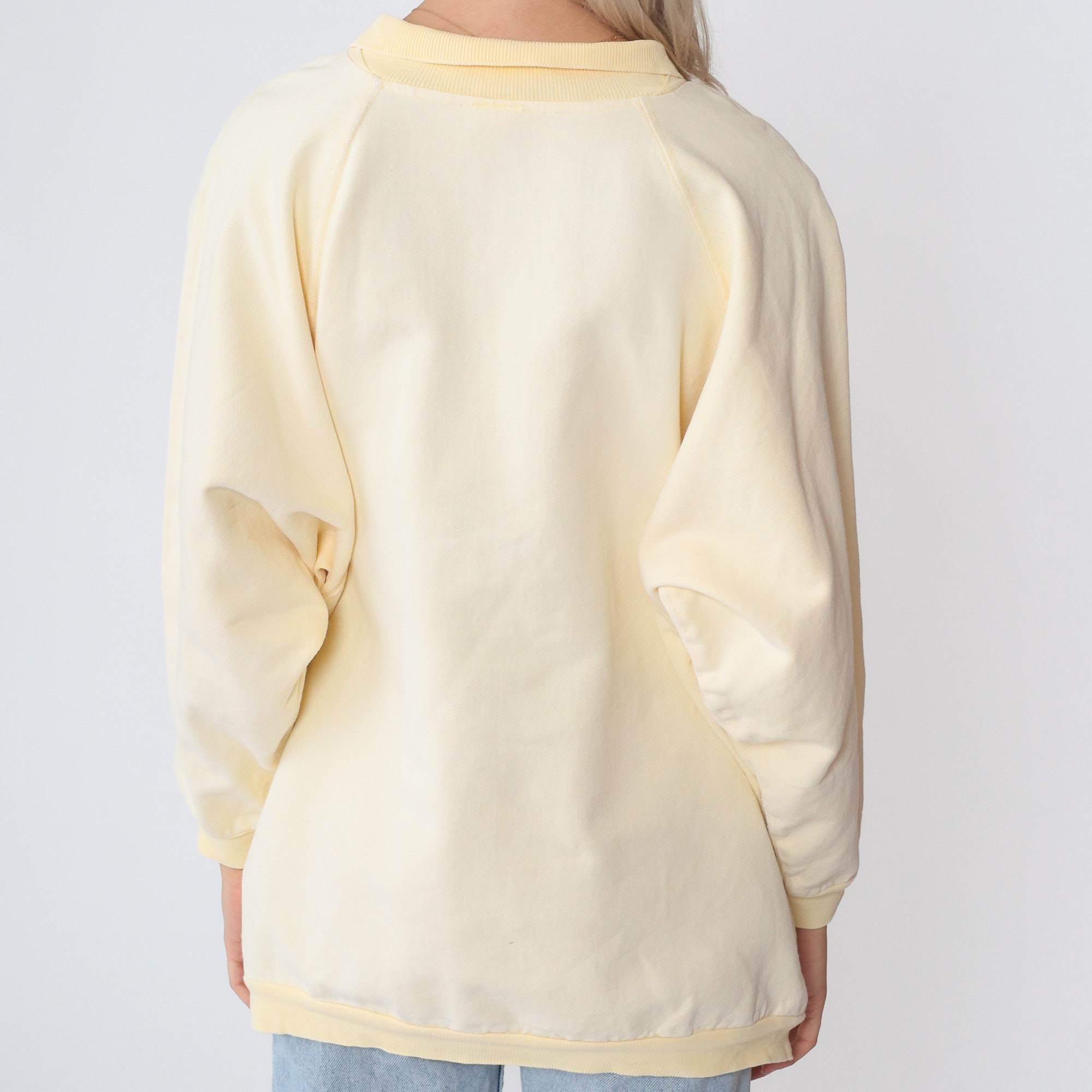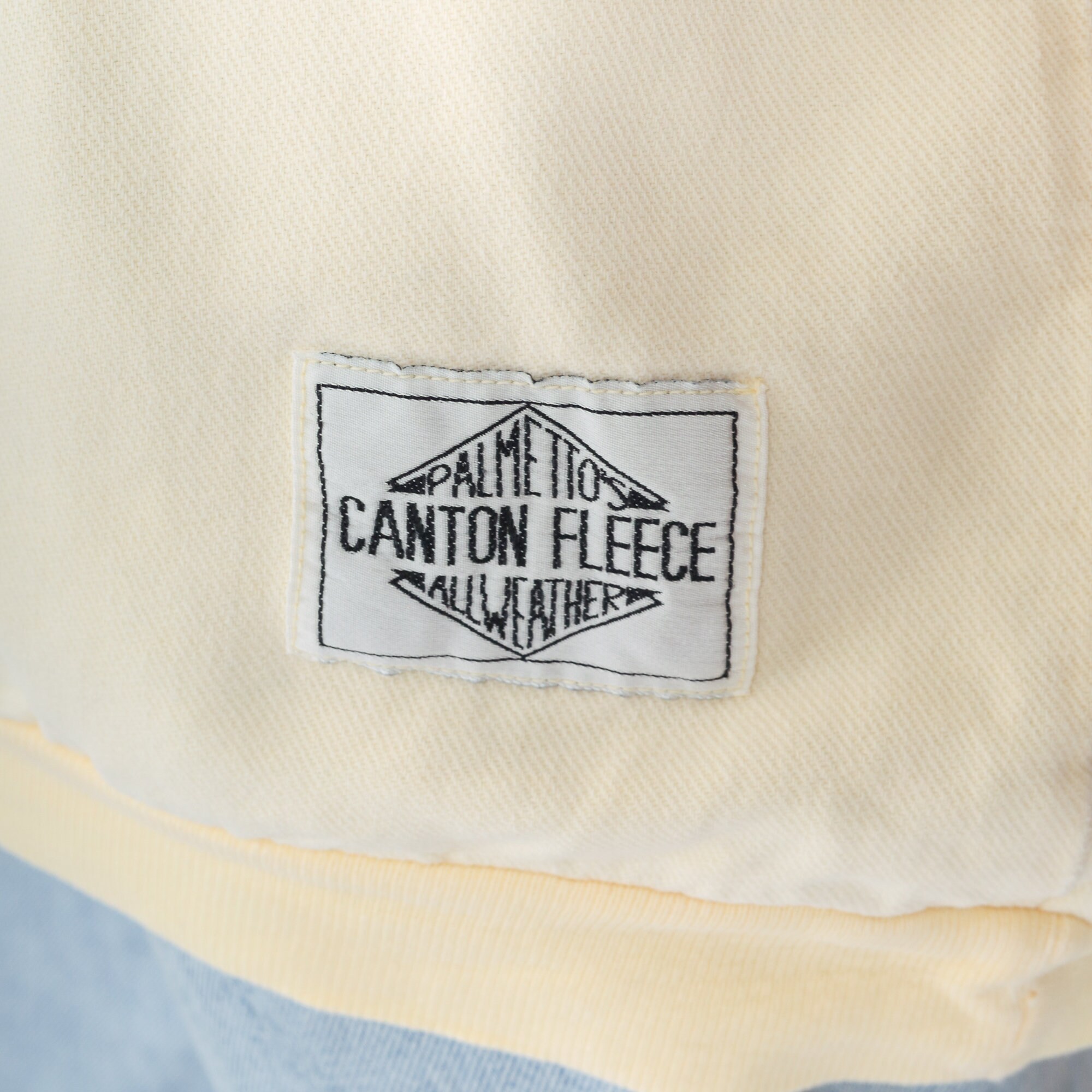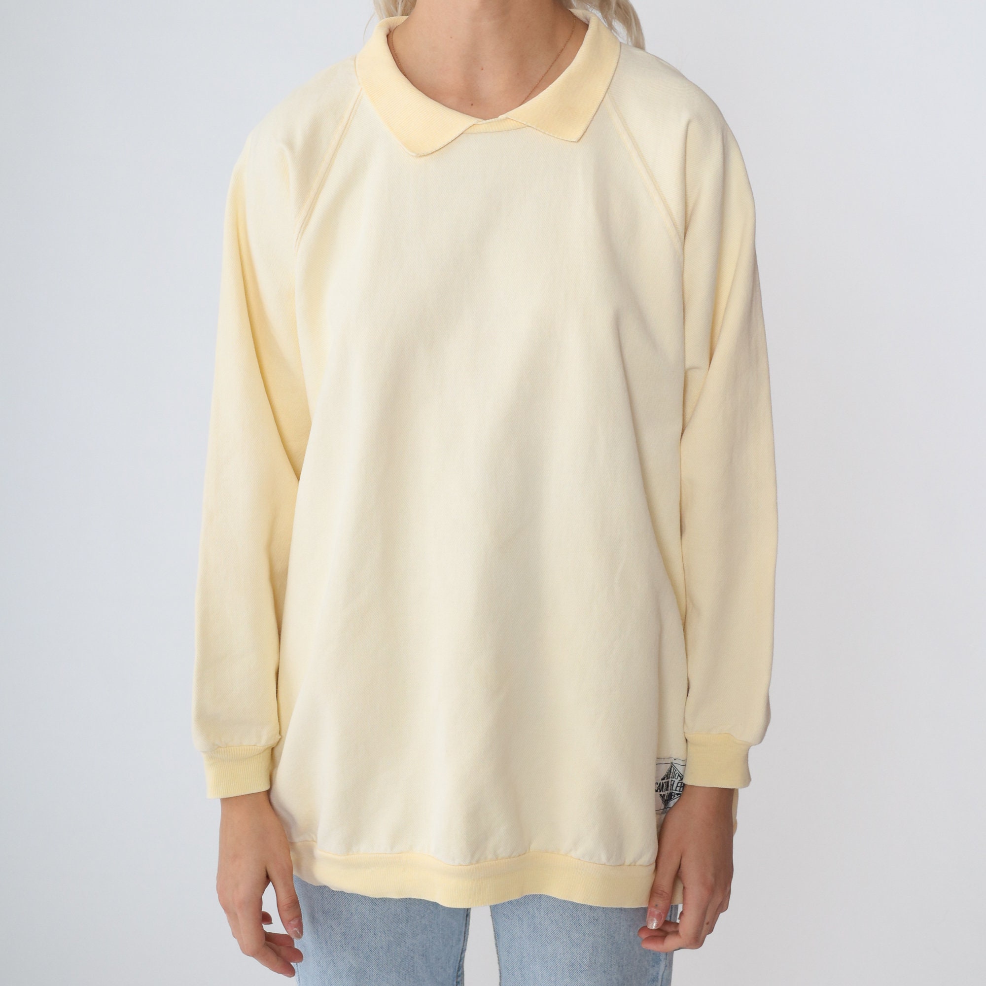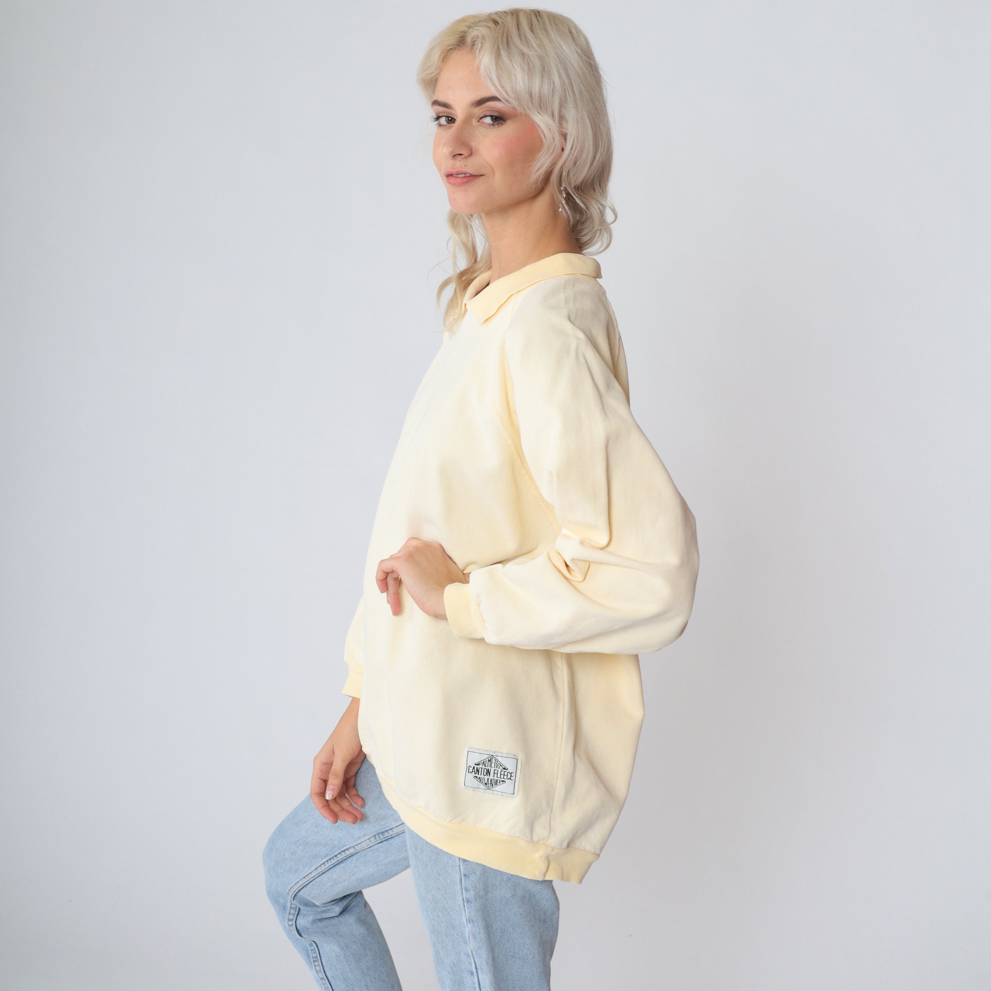 Vintage 90s sweatshirt in cream yellow Canton fleece with a collar, raglan sleeves, and a Palmetto logo tag on the front.