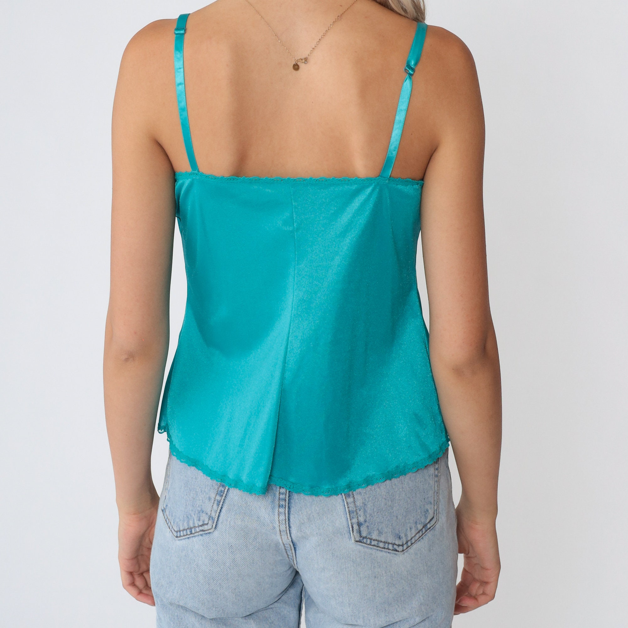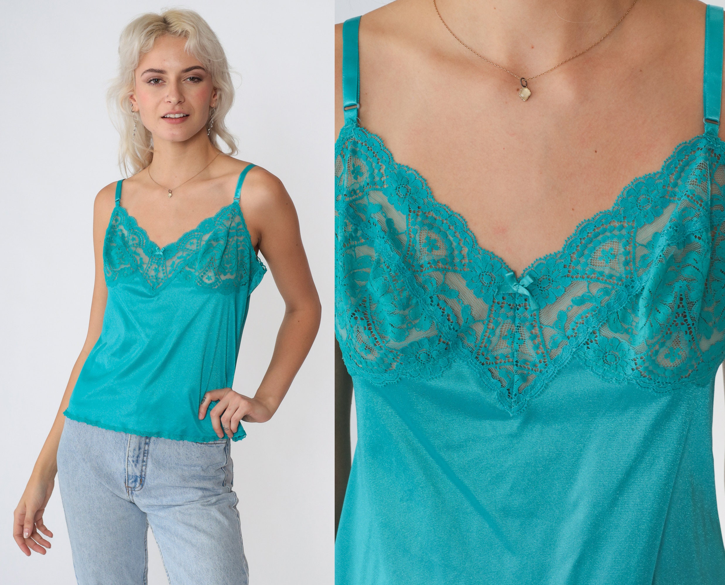Vintage 90s camisole tank top in teal blue with a sheer floral lace chest, a small ribbon bow, and adjustable straps.