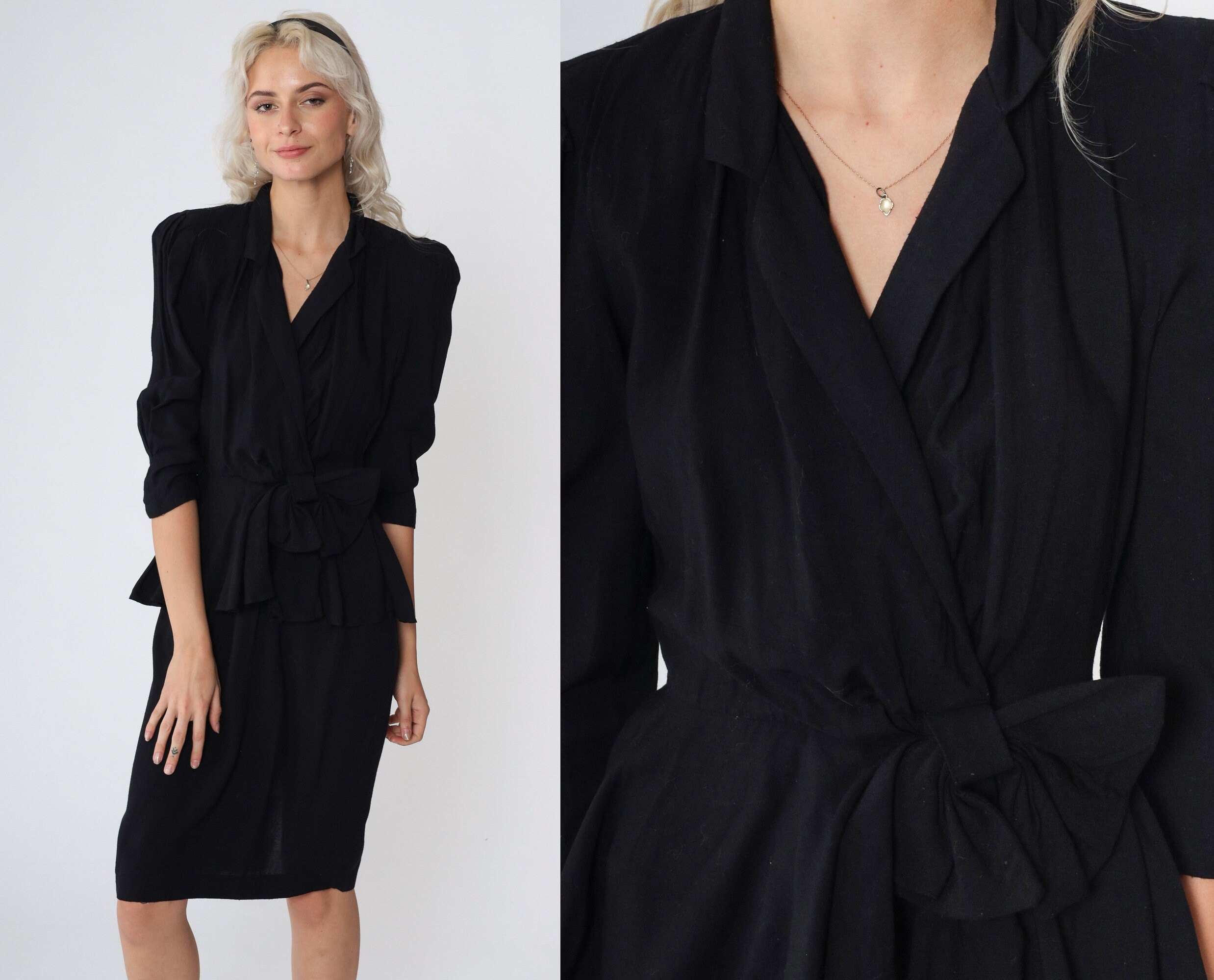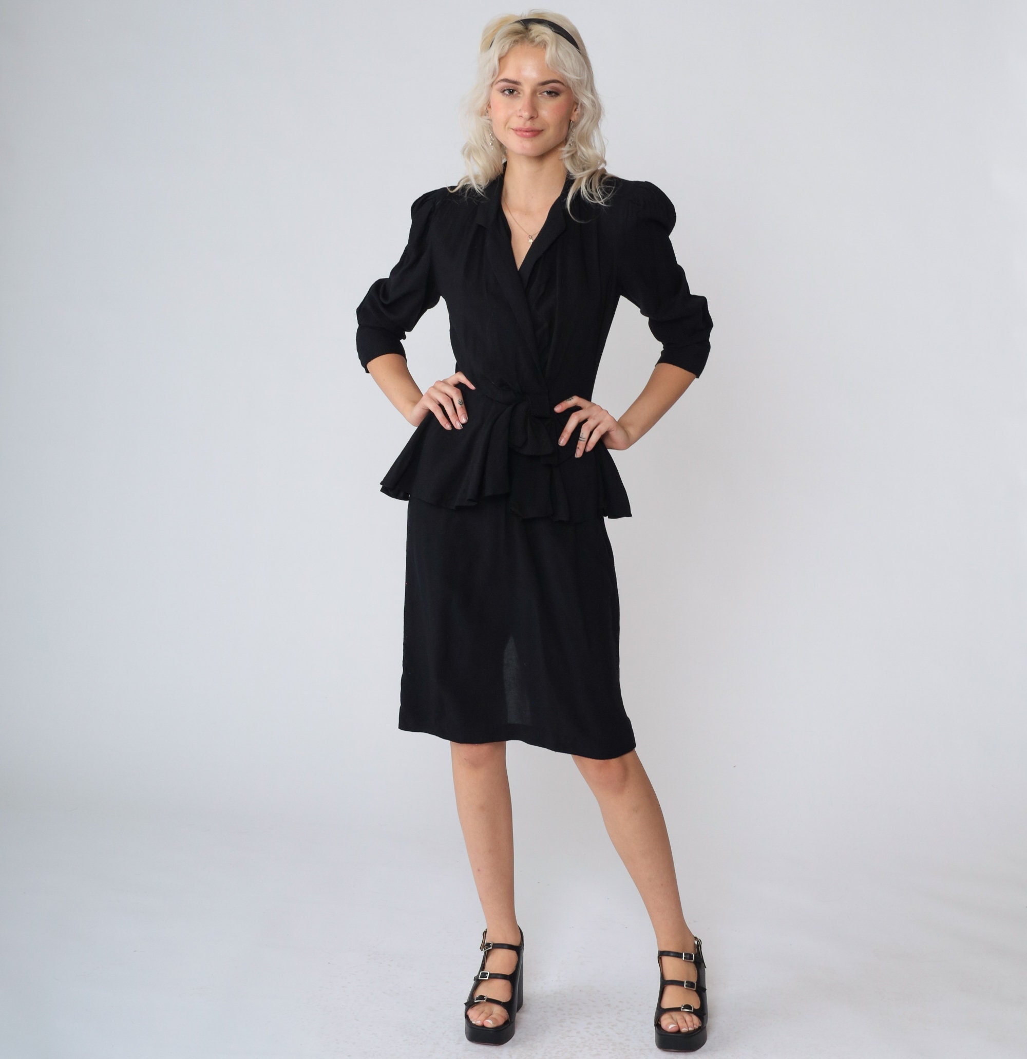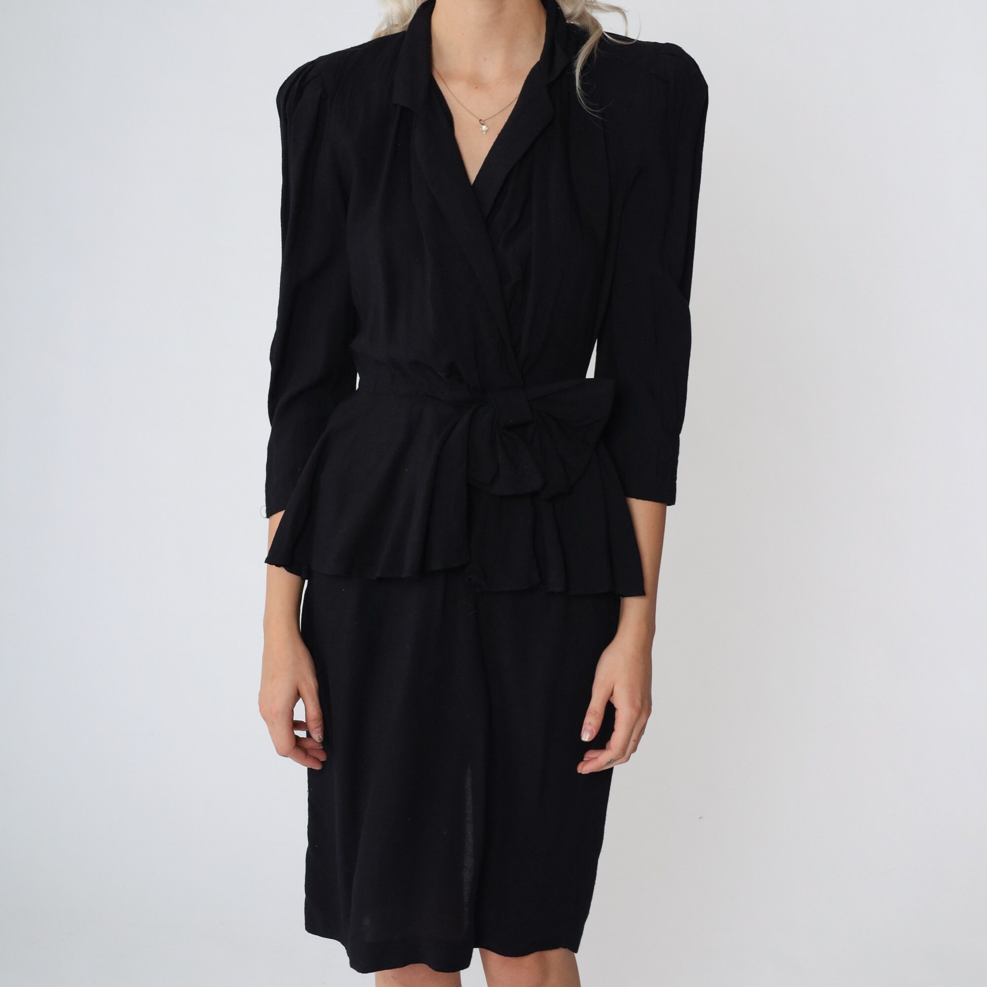 Vintage 80s dress in black with a tie and peplum at the waist. 3/4 puff sleeves and a v neck. Knee length midi with a rear zipper.