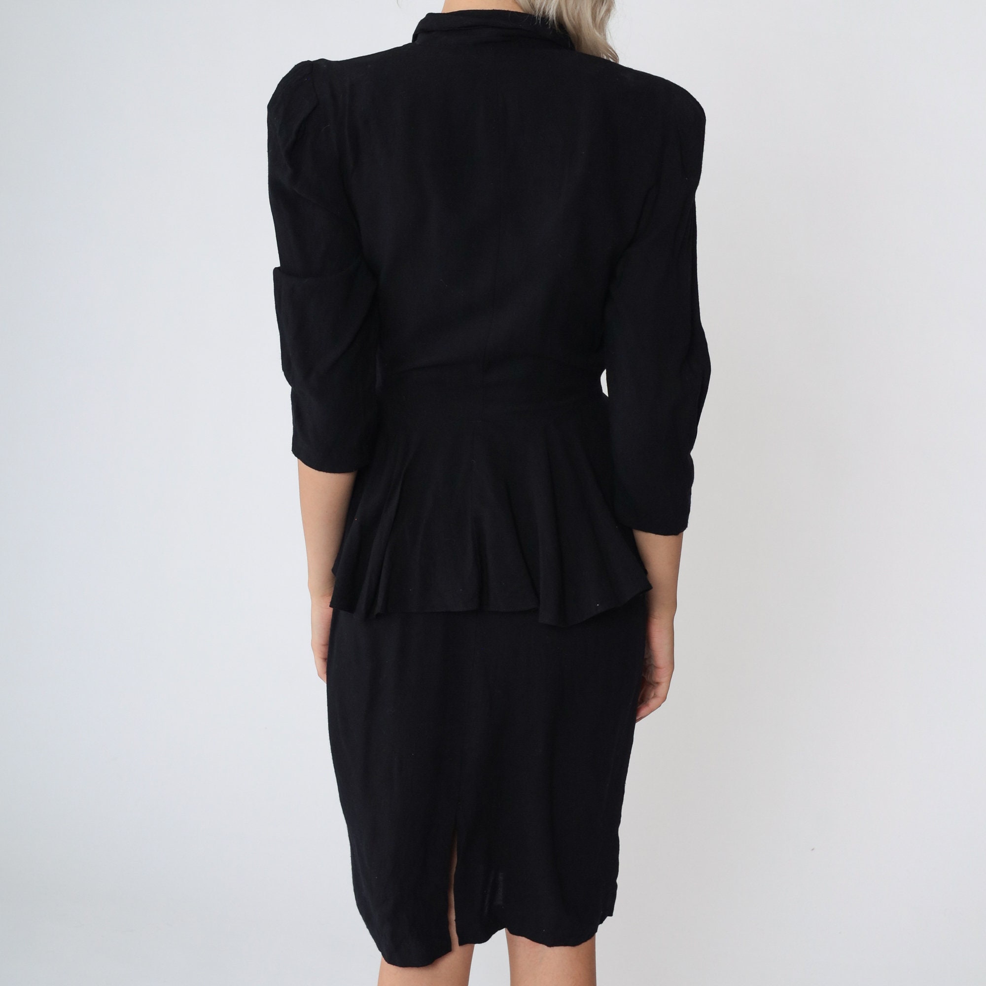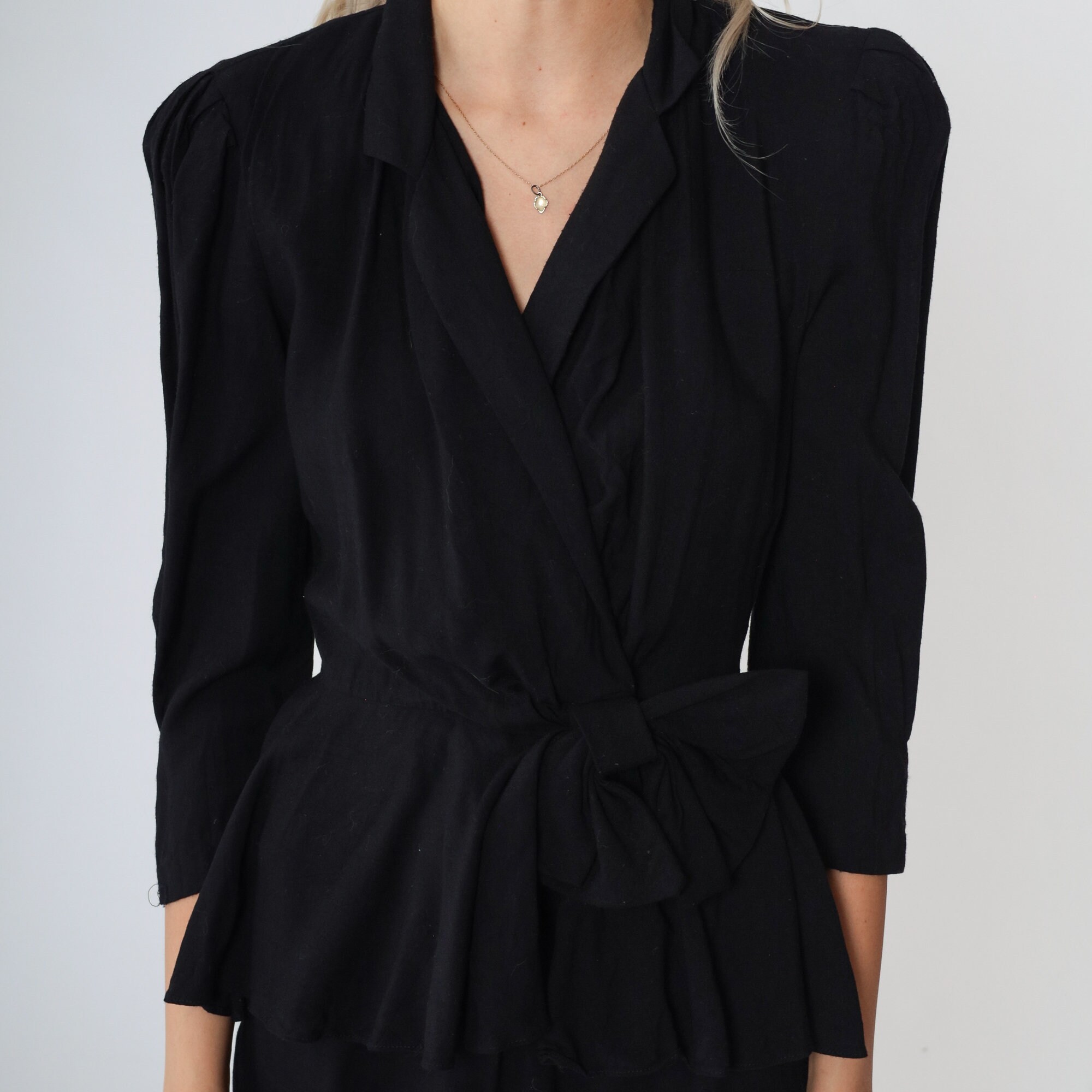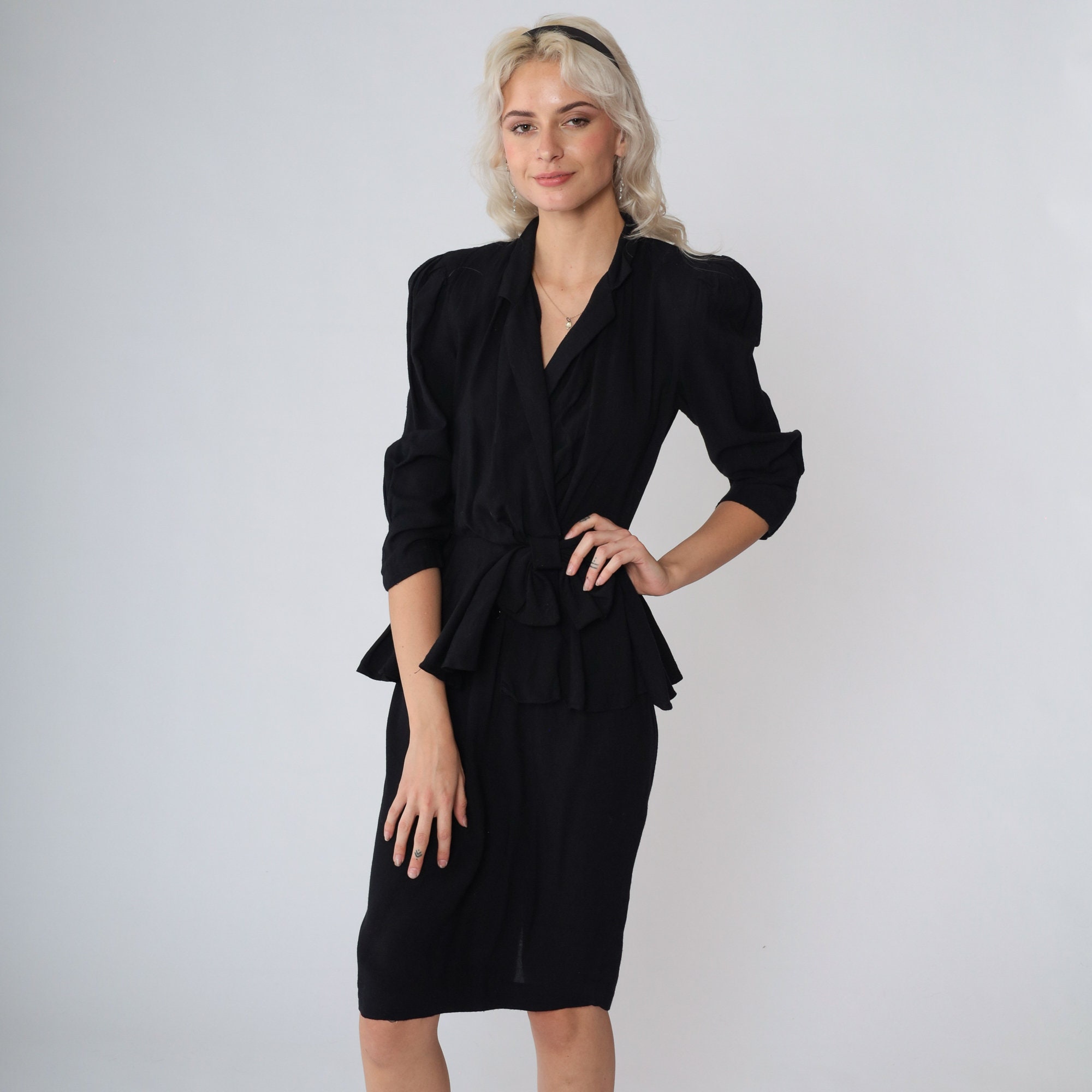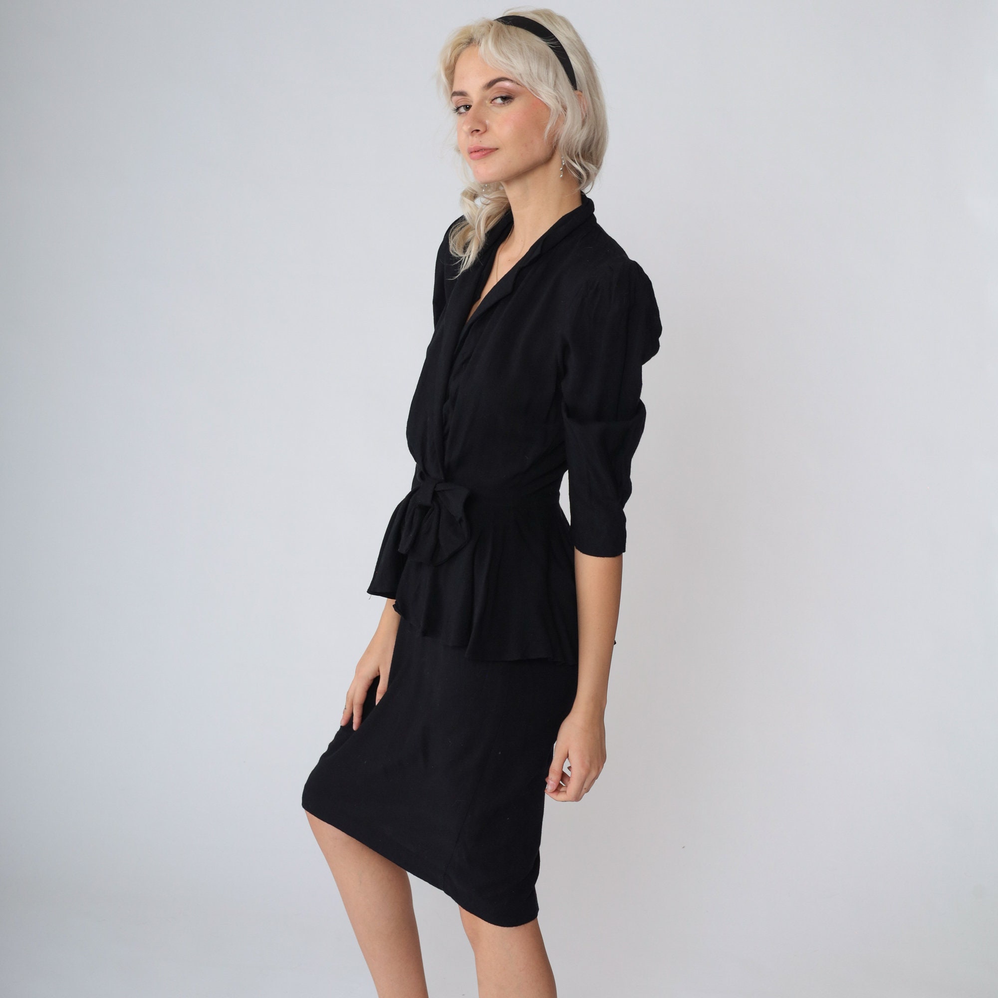 Vintage 80s dress in black with a tie and peplum at the waist. 3/4 puff sleeves and a v neck. Knee length midi with a rear zipper.