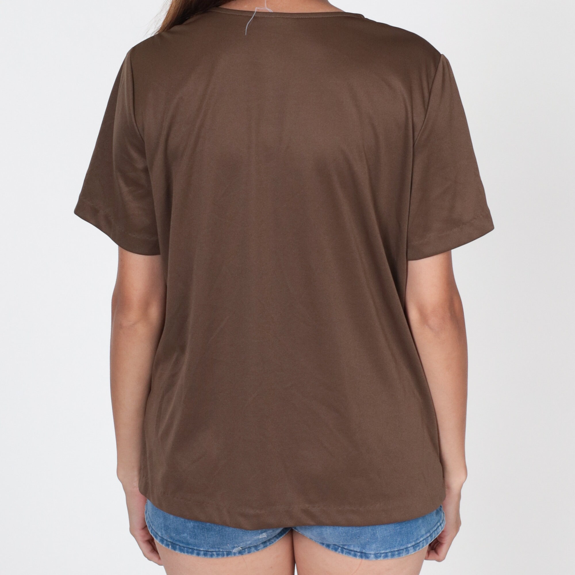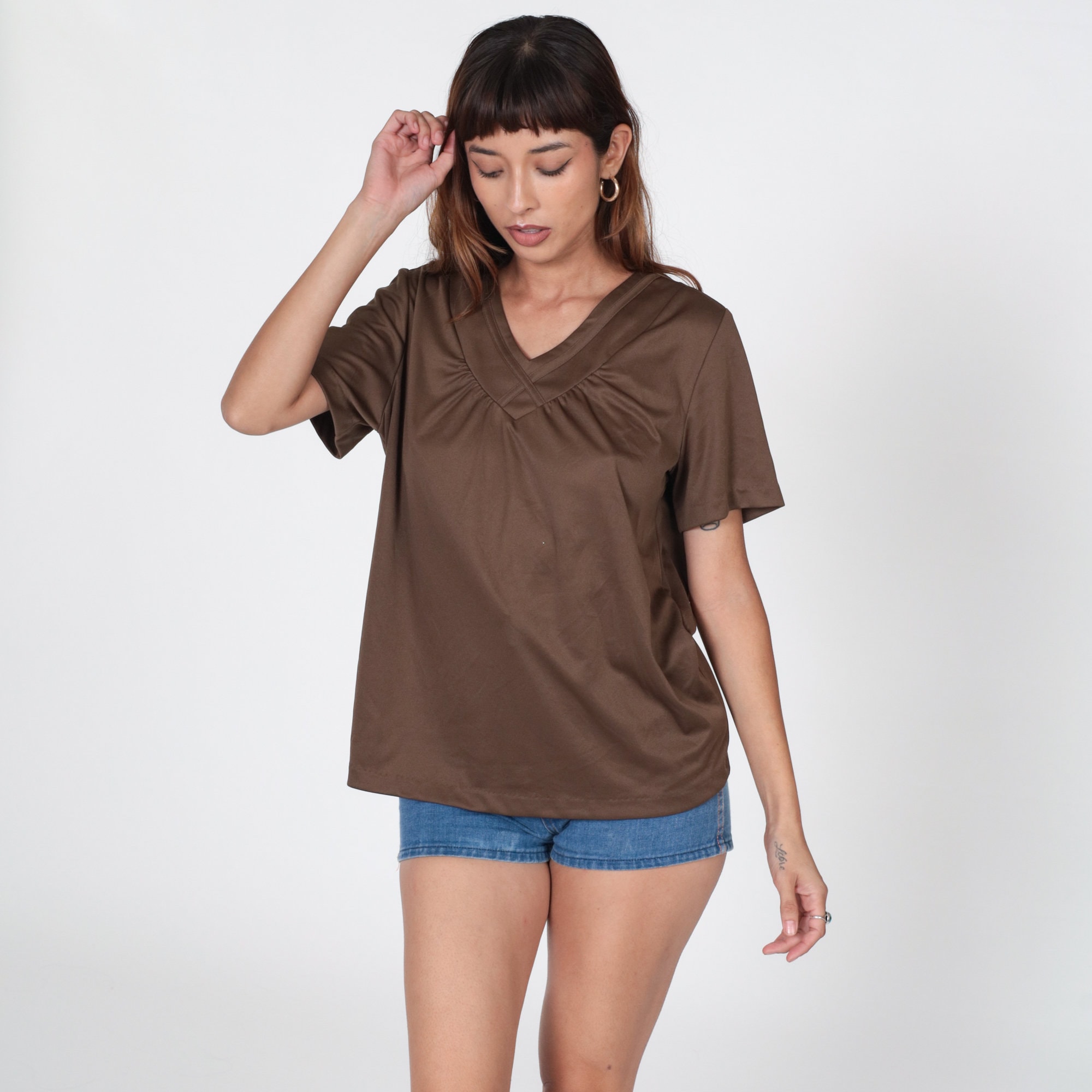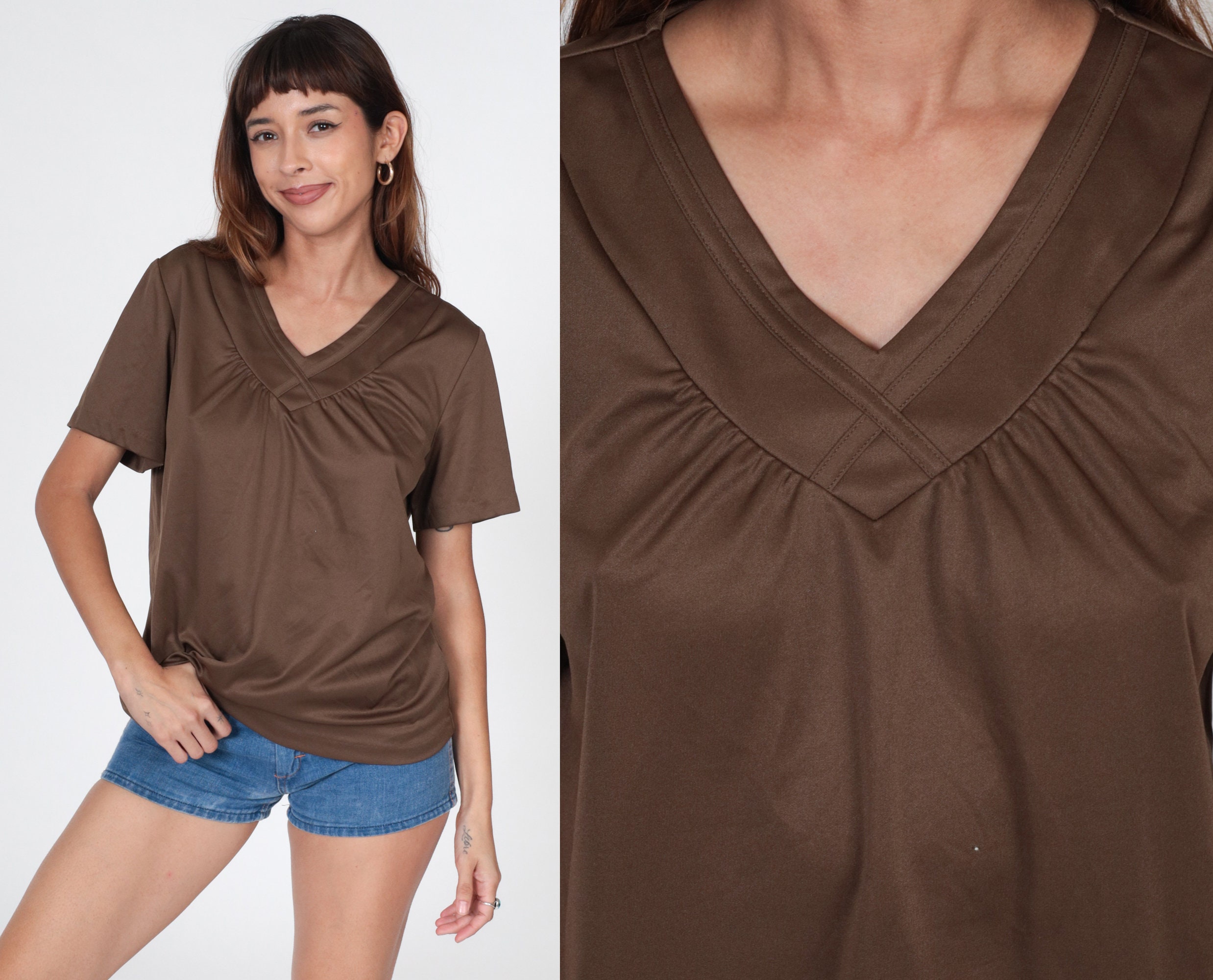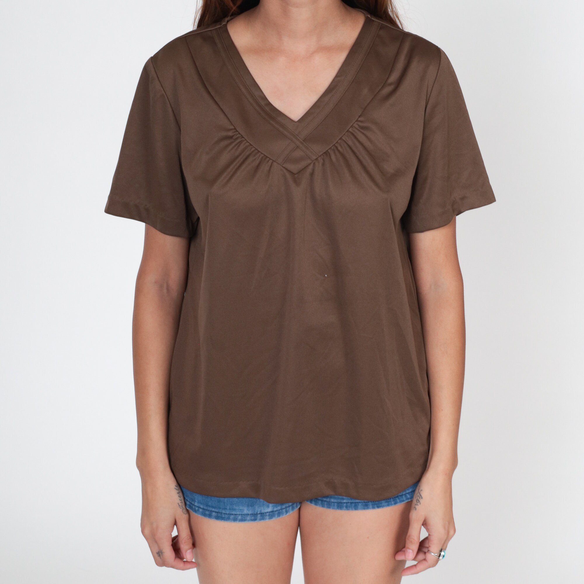 Vintage 70s blouse in brown with gathering at the neckline, short sleeves, and a v neck.