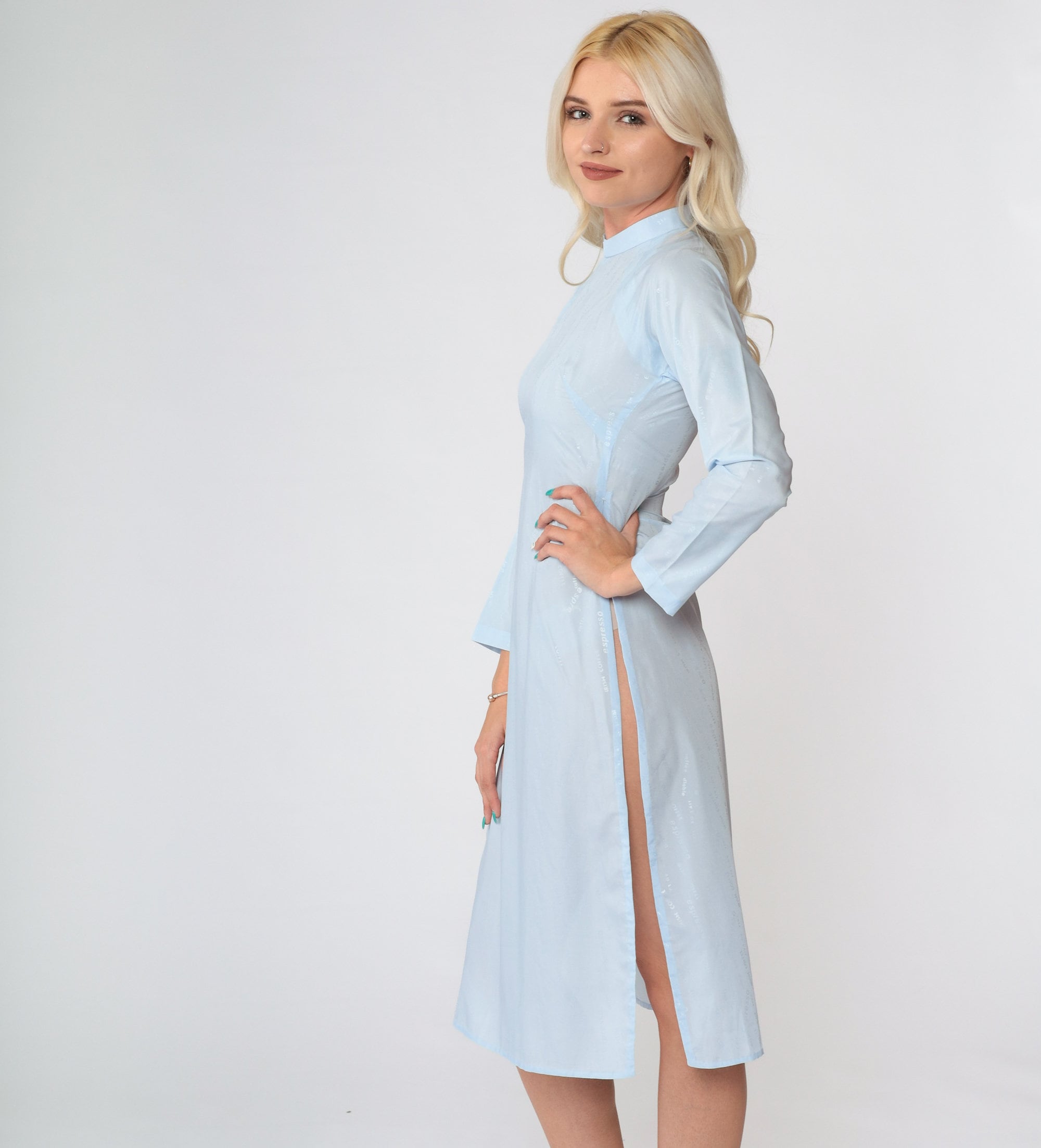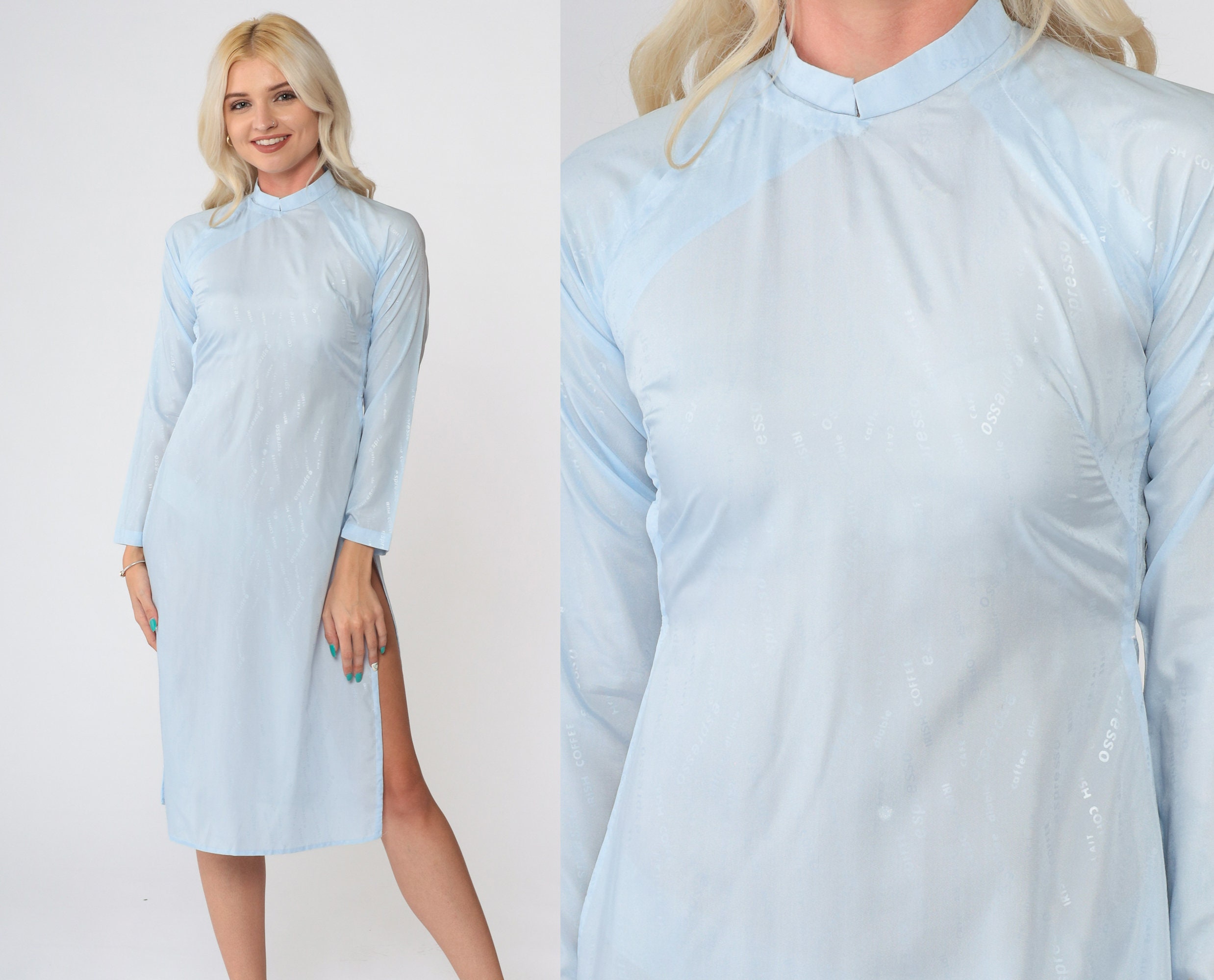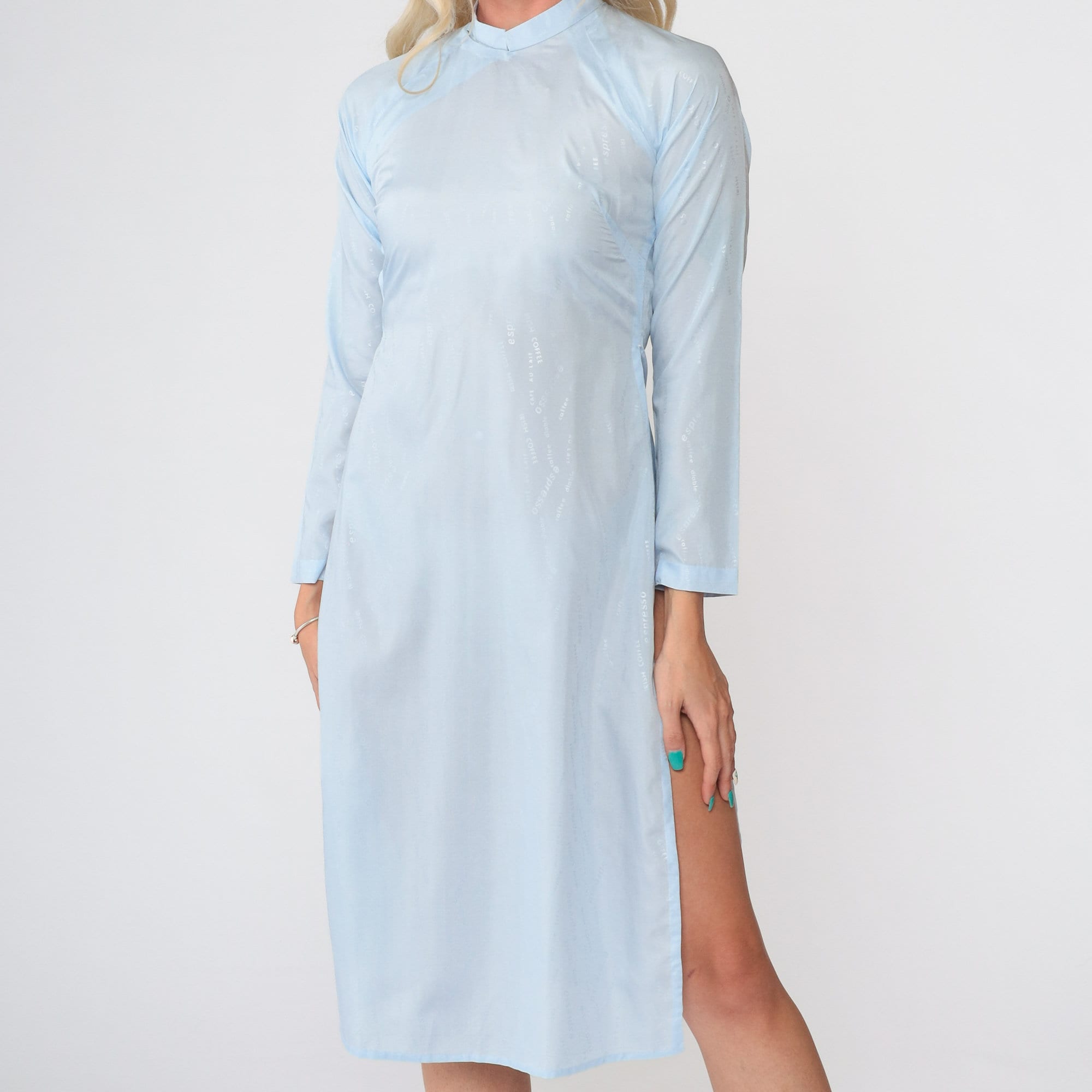 Vintage 90s ao dai dress in baby blue, embossed with words like espresso, cafe au lait, and Irish coffee. It has long sleeves, a mandarin collar, and high side slits. Midi length.