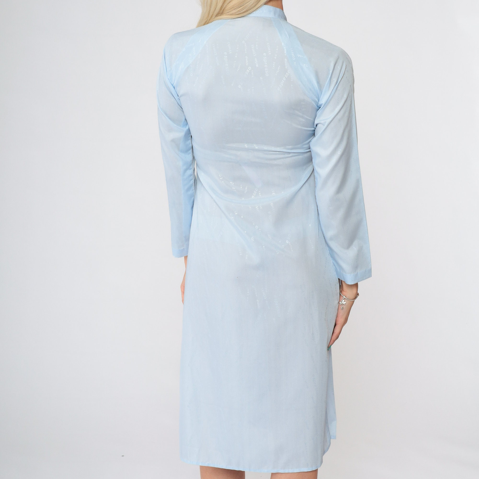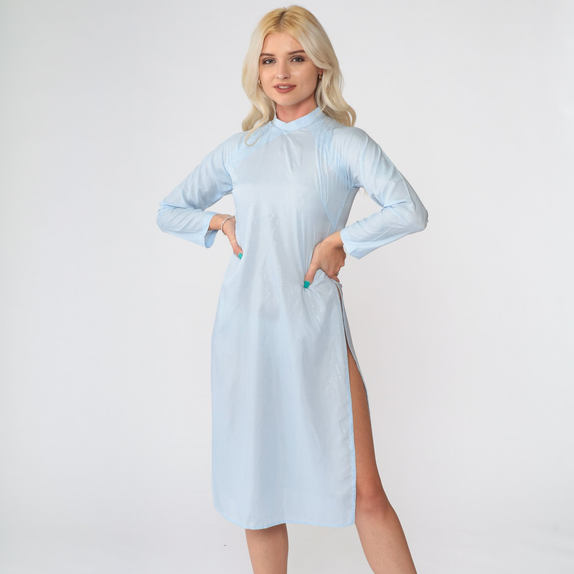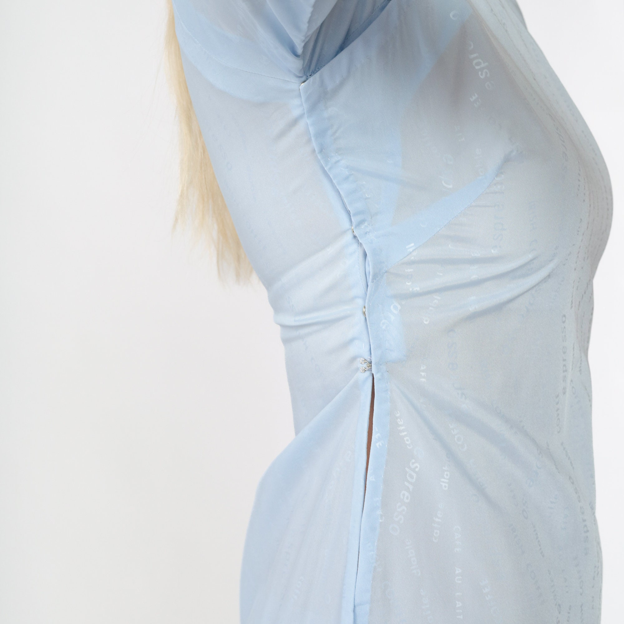 Vintage 90s ao dai dress in baby blue, embossed with words like espresso, cafe au lait, and Irish coffee. It has long sleeves, a mandarin collar, and high side slits. Midi length.