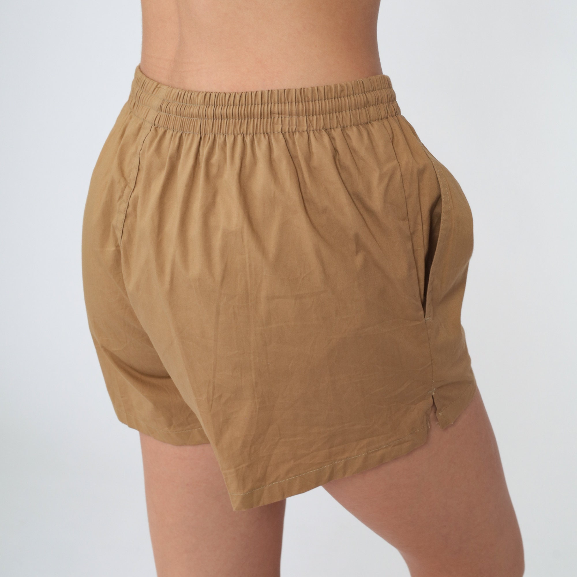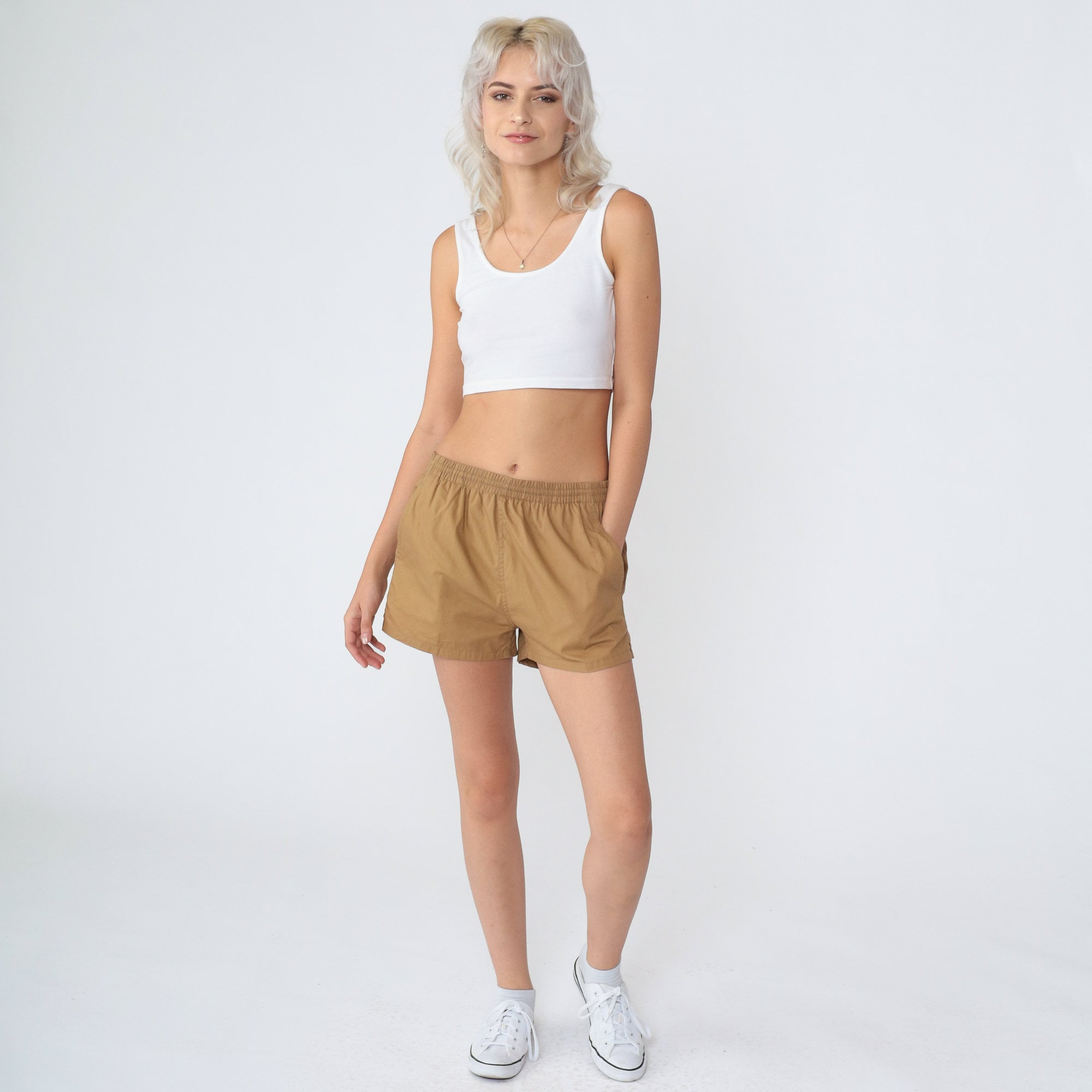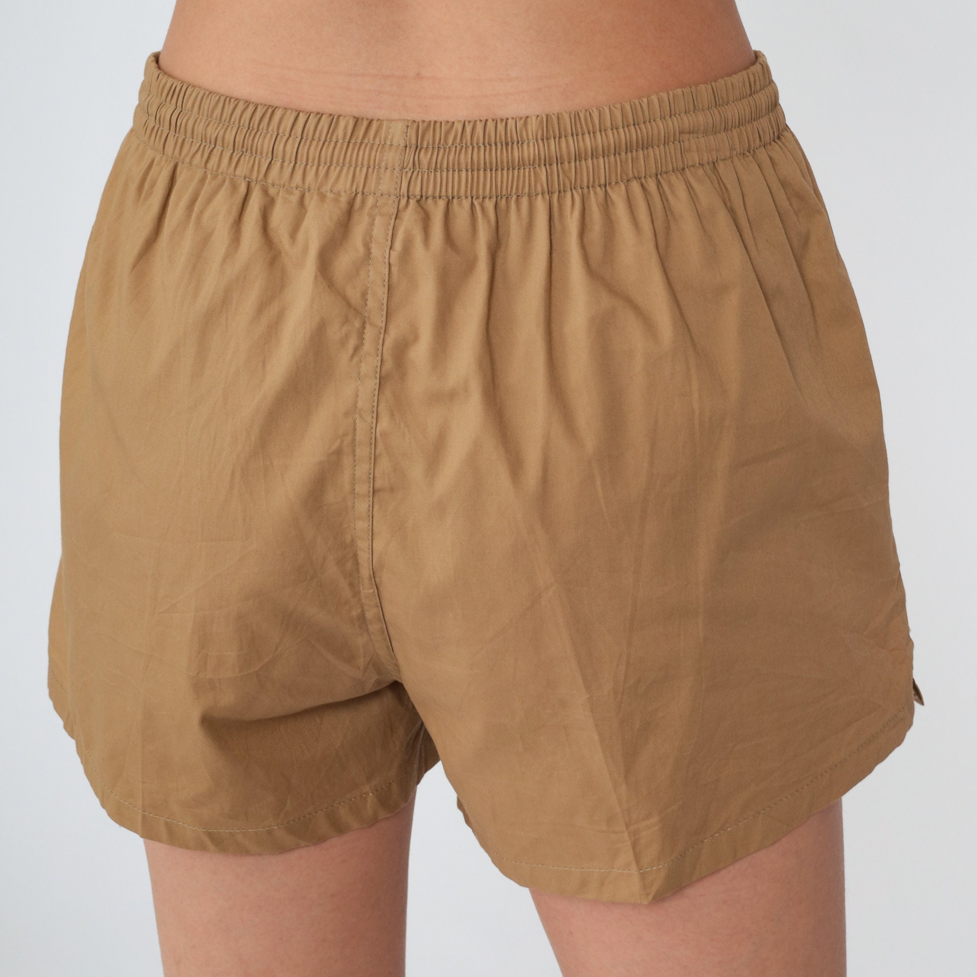 Vintage 80s swim shorts in tan with an elastic waist and a swim lining.