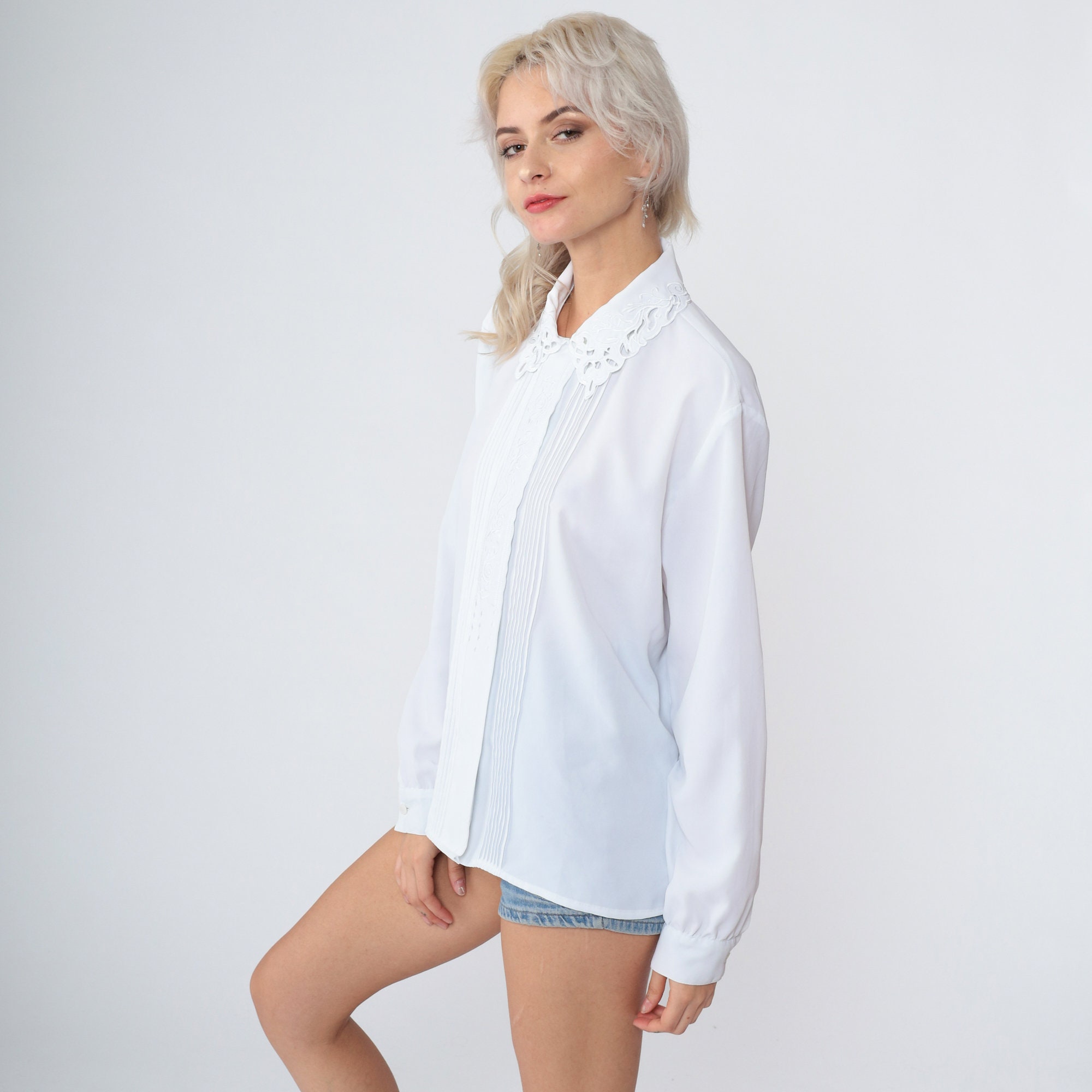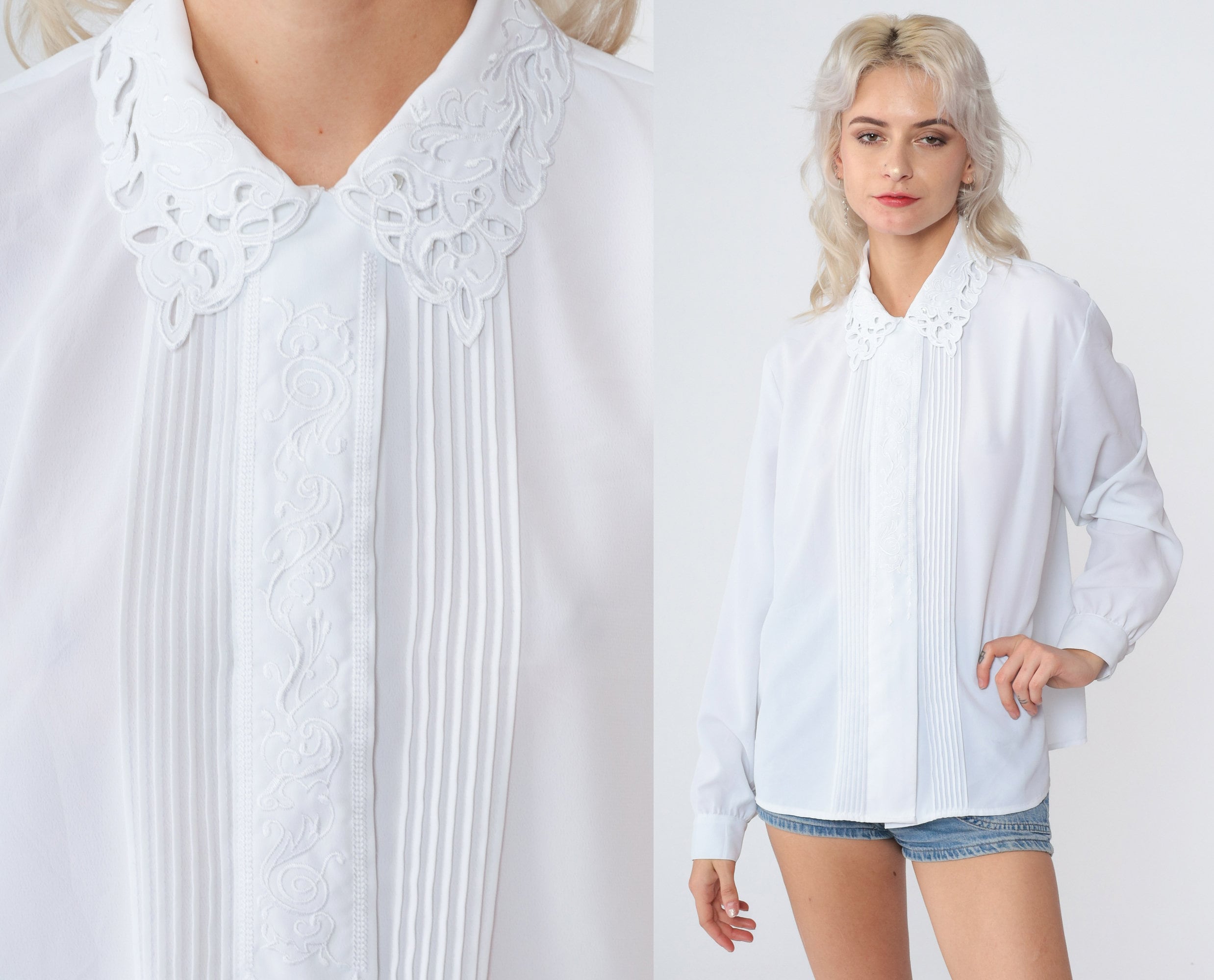 Vintage 90s shirt in Semi-Sheer white with floral embroidery. It has long sleeves, pleats, and hidden buttons up the front.