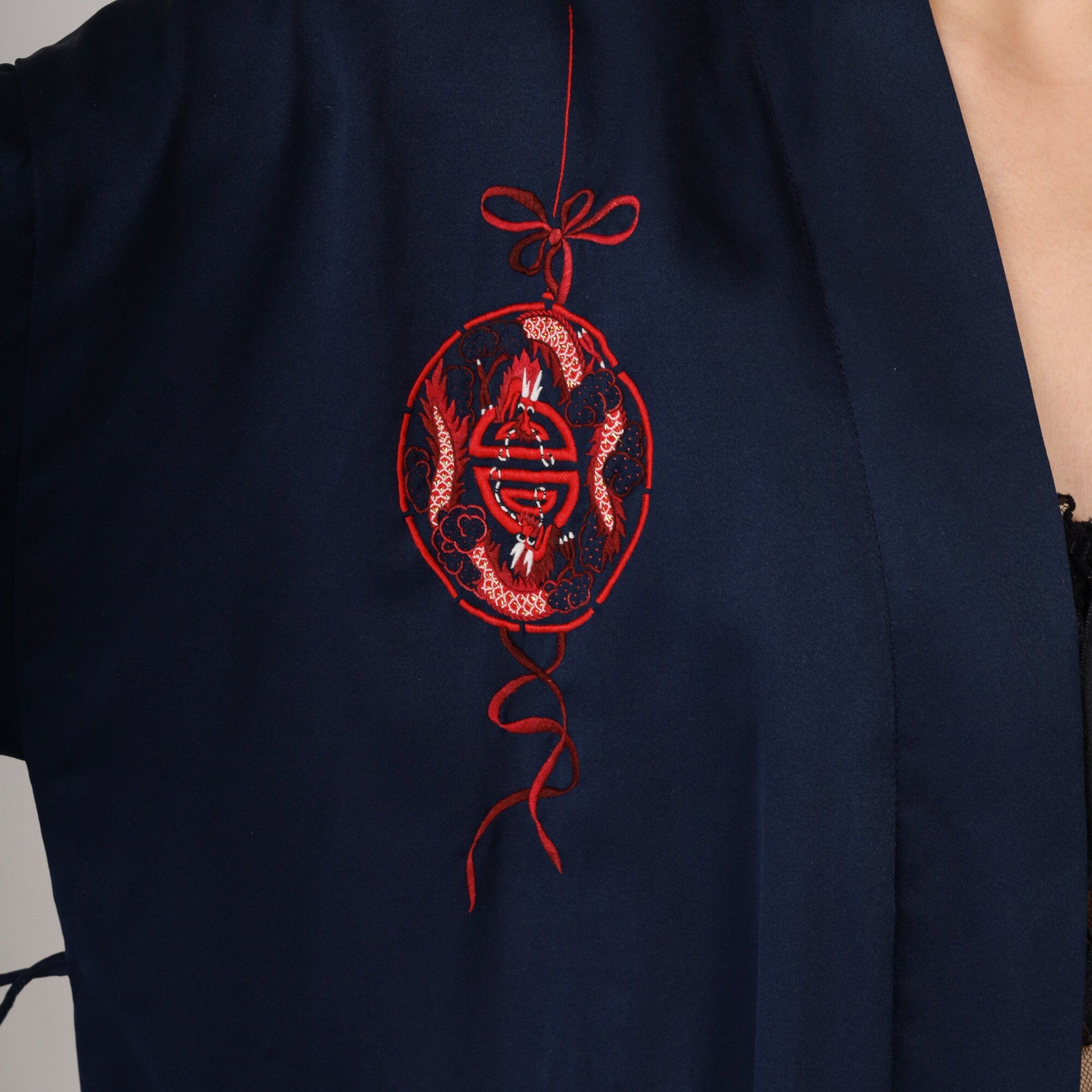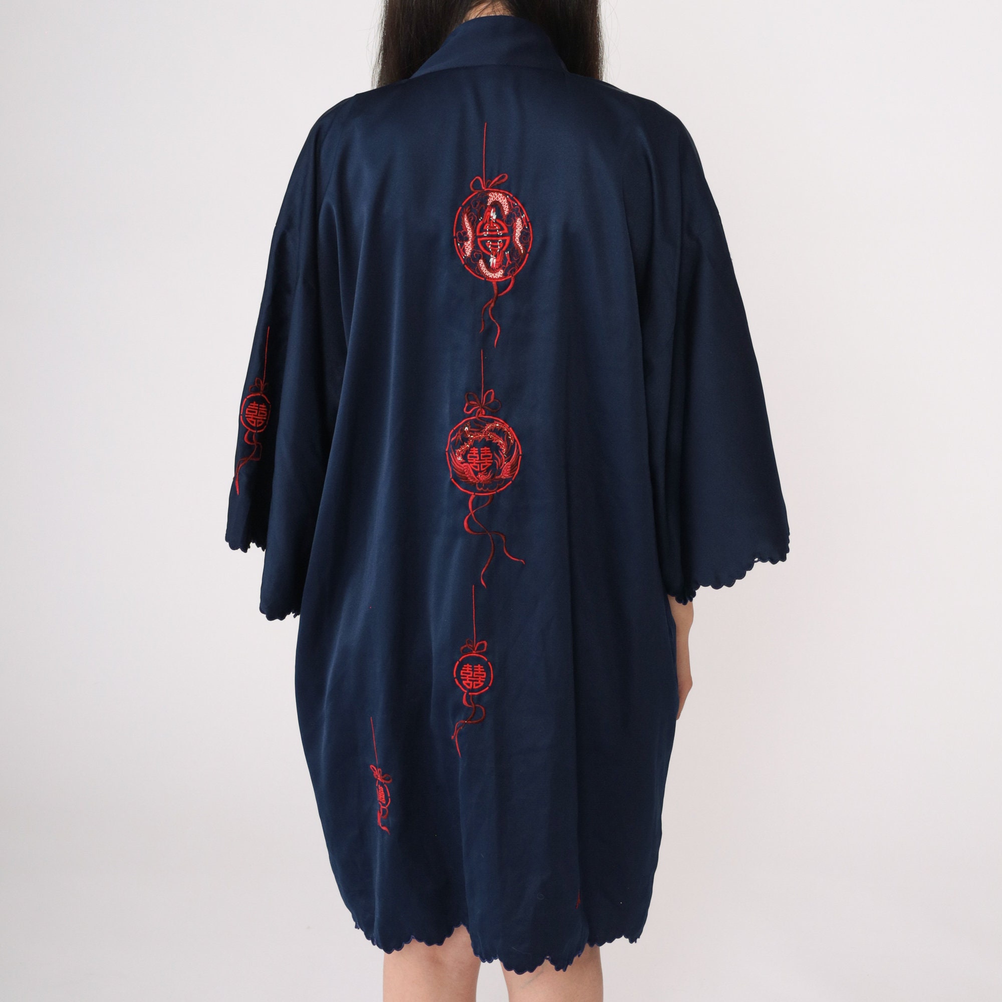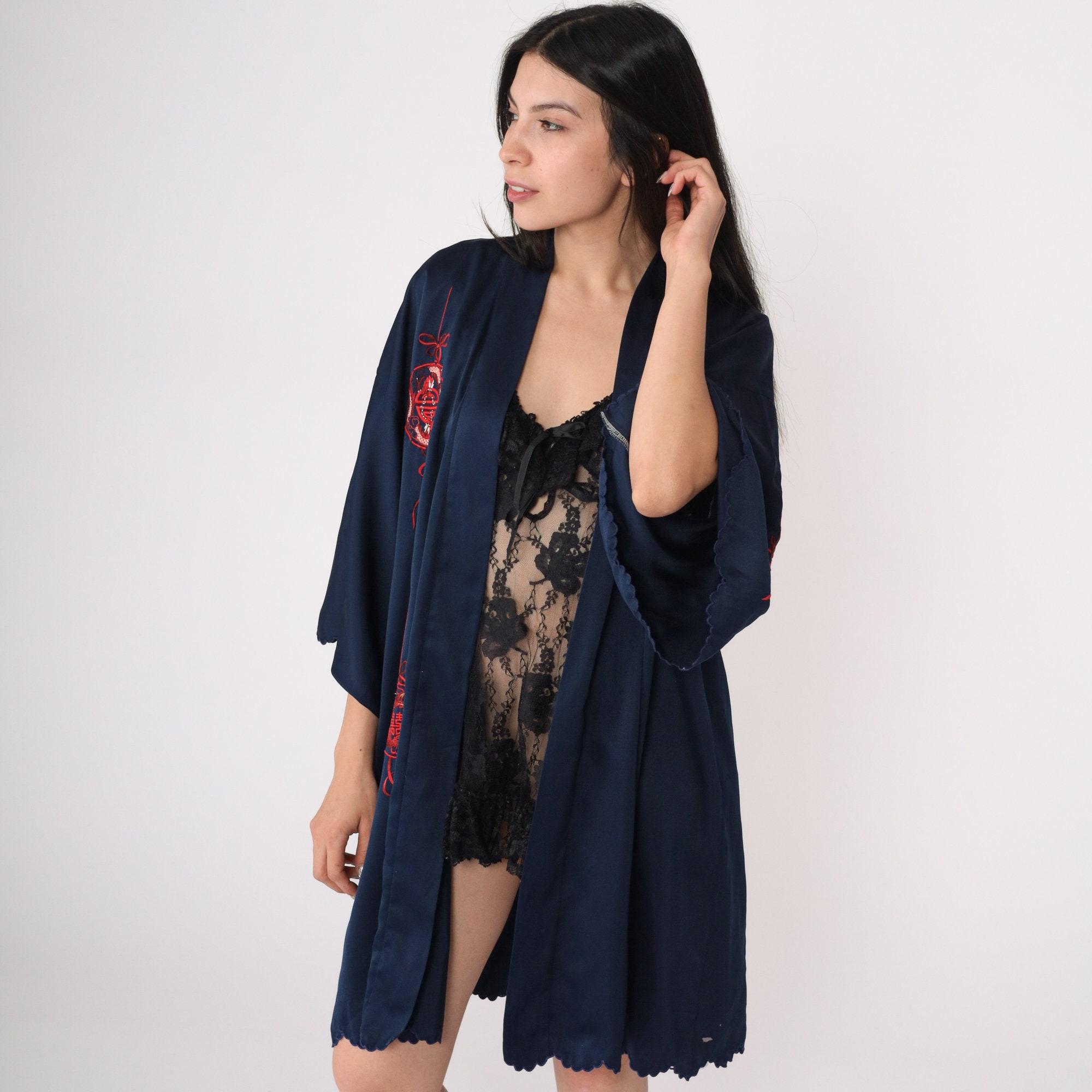 Vintage 80s kimono robe in dark blue with embroidered fish, dragons and peacocks.
