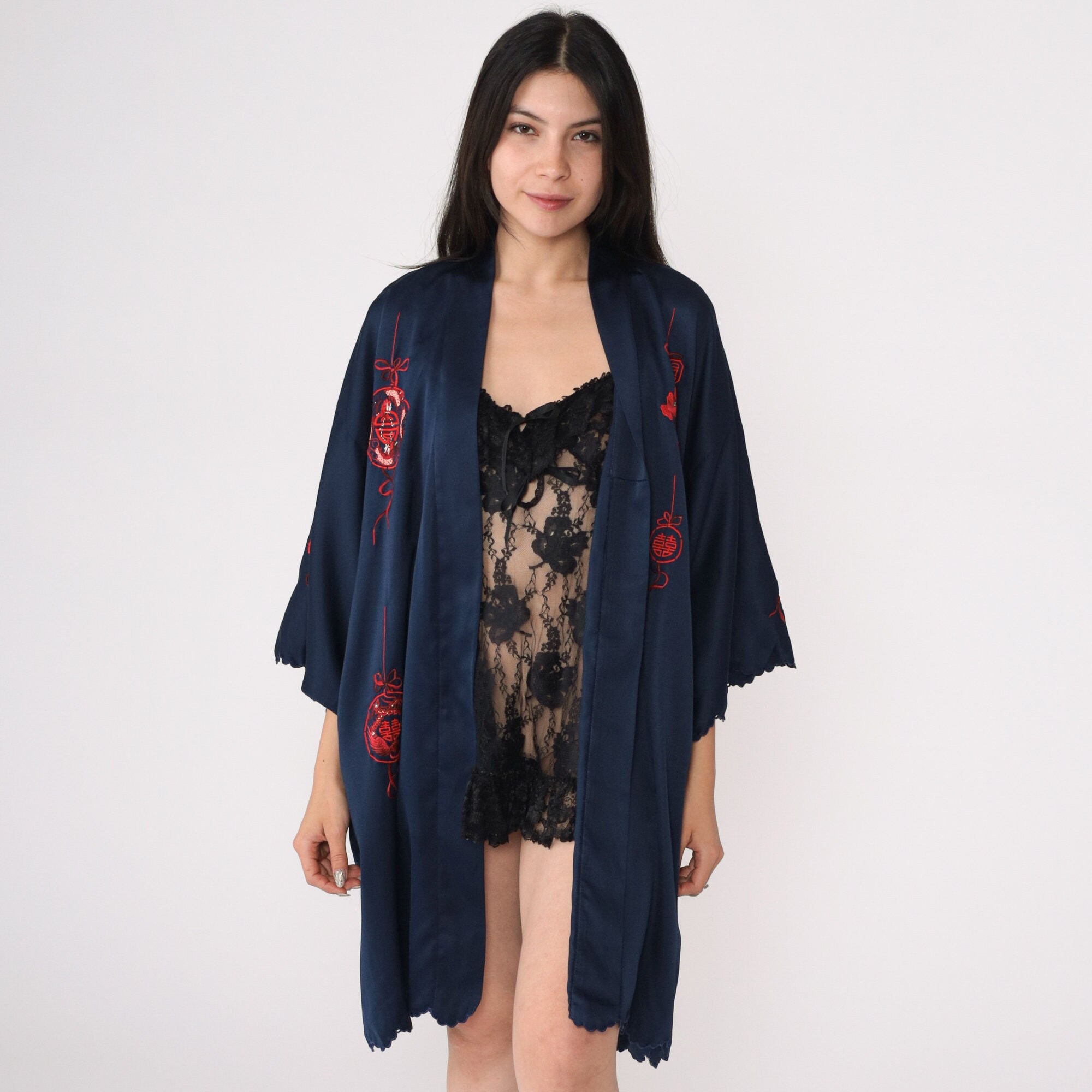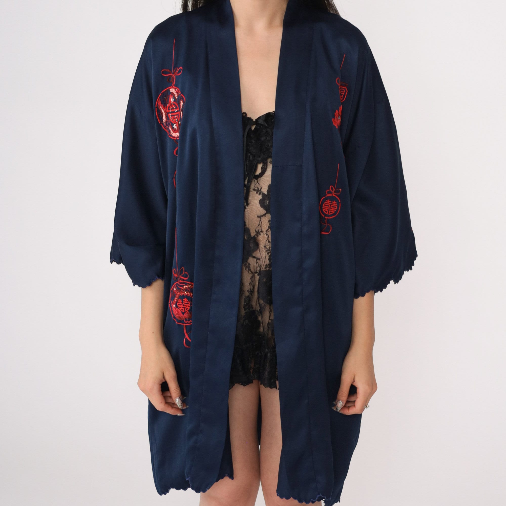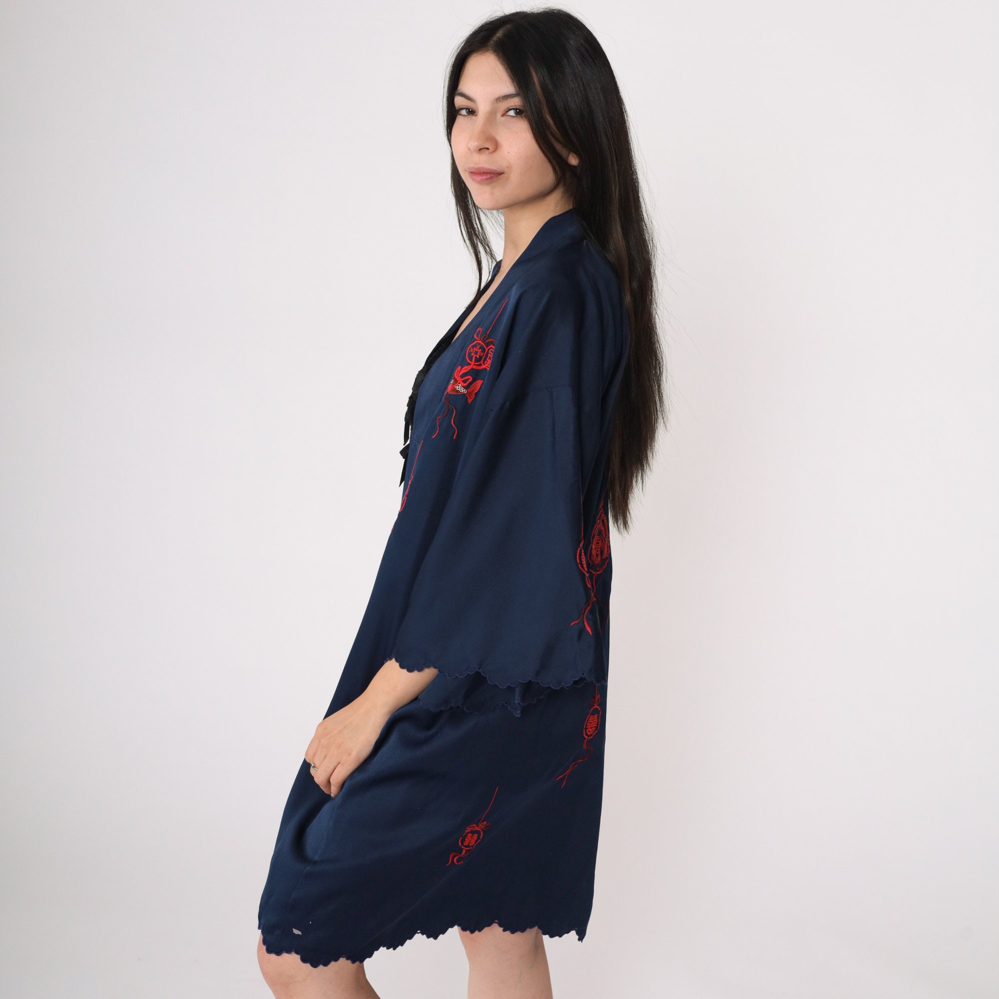 Vintage 80s kimono robe in dark blue with embroidered fish, dragons and peacocks.