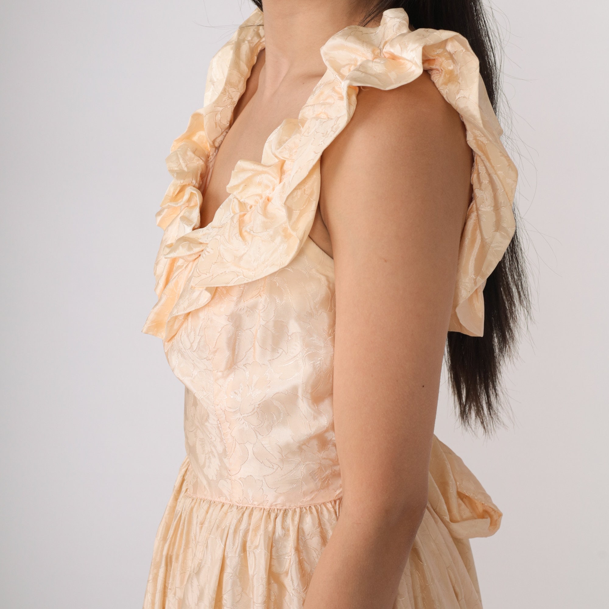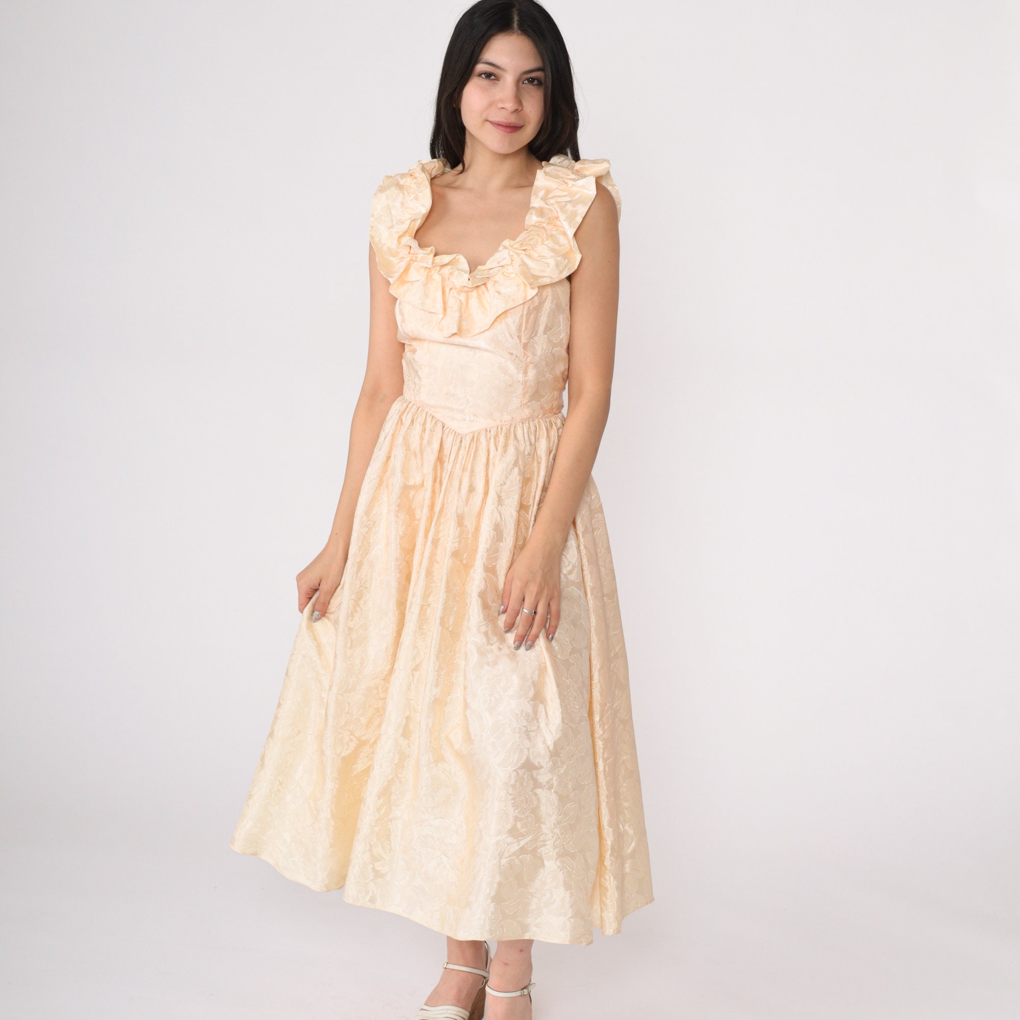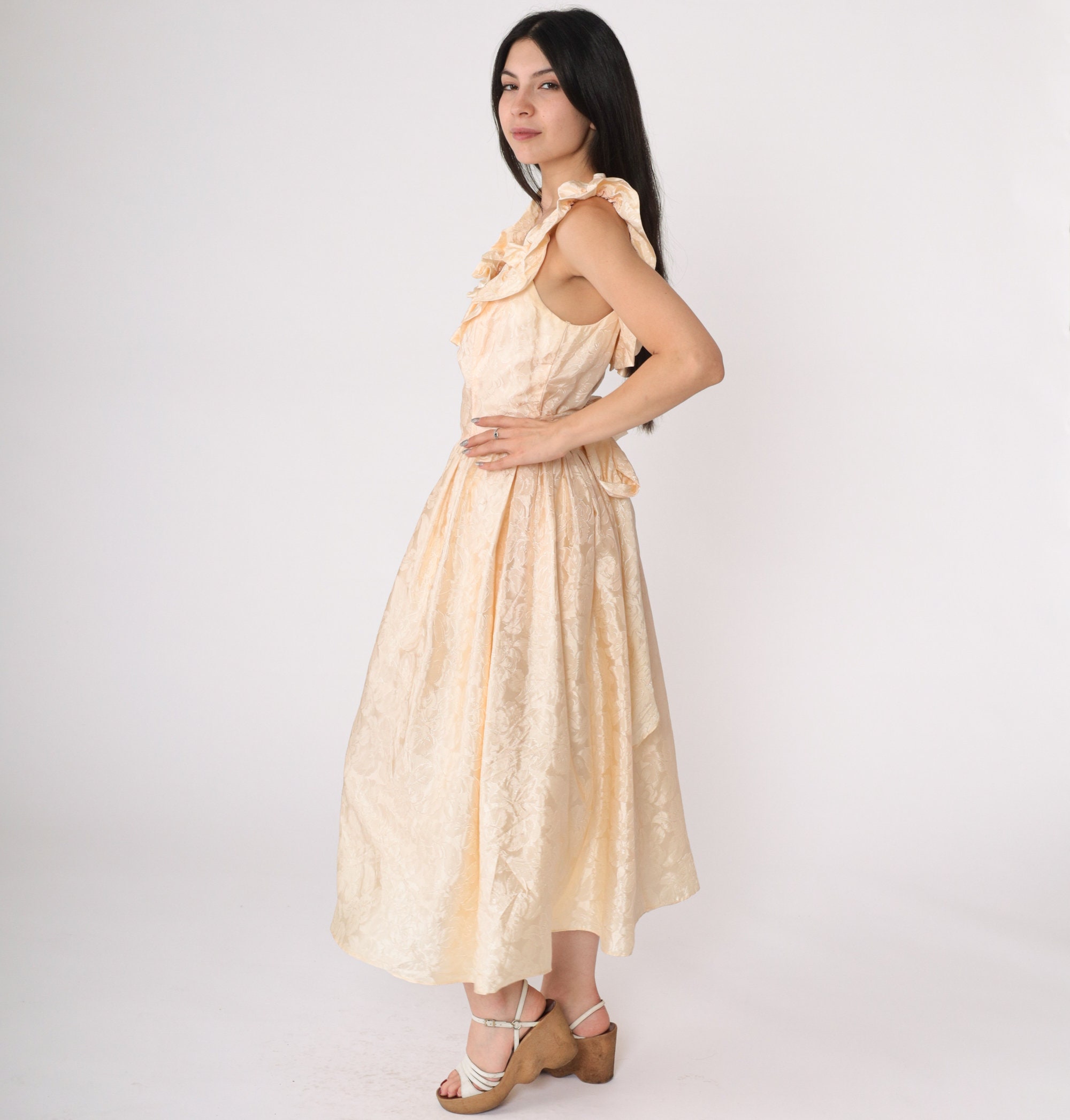Vintage 80s dress in floral embossed peach with a basque waist, a ruffled neckline and a full skirt. Midi length with a rear zipper.