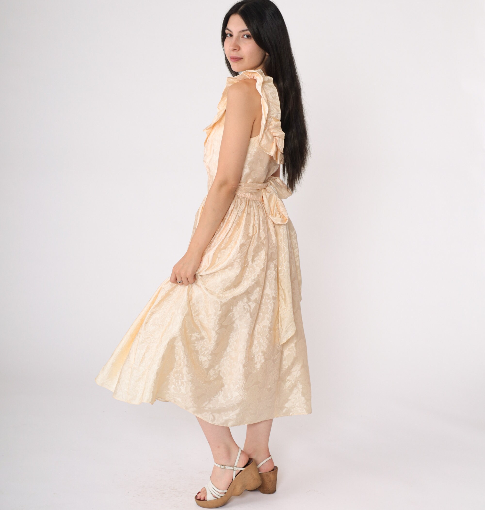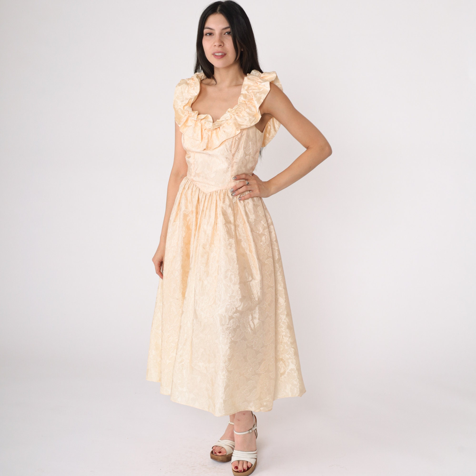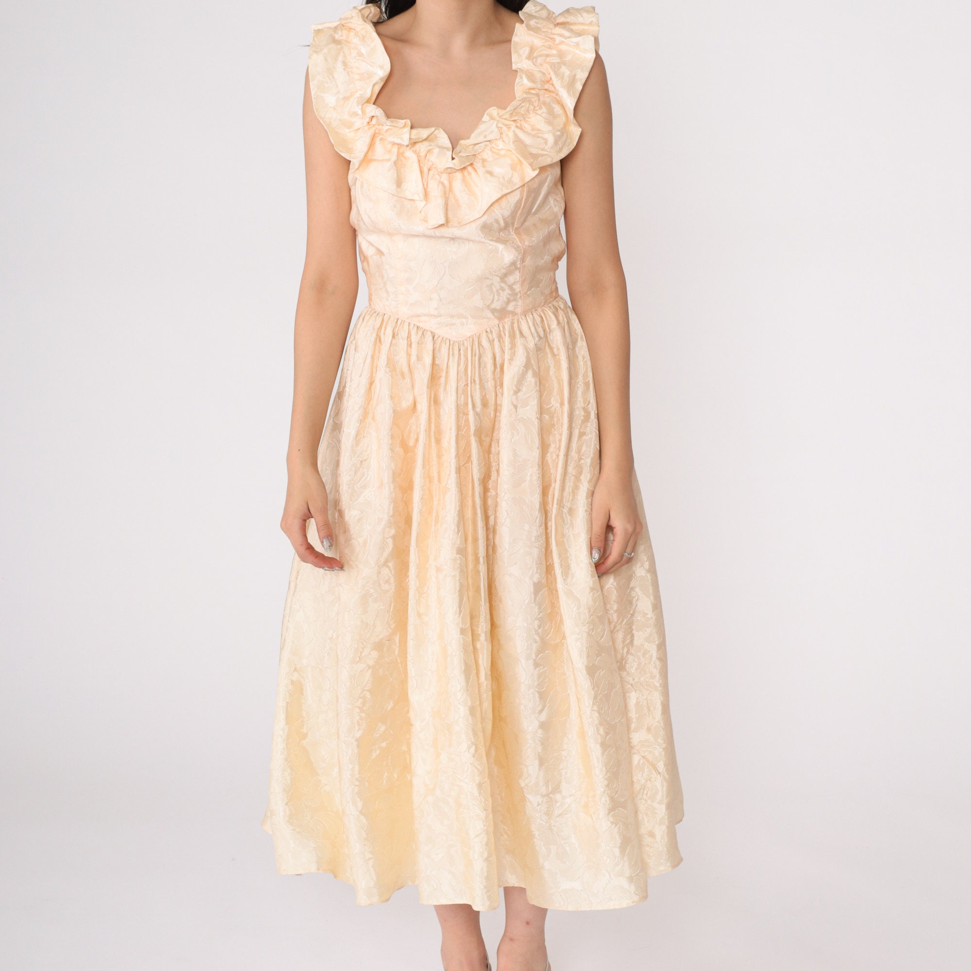 Vintage 80s dress in floral embossed peach with a basque waist, a ruffled neckline and a full skirt. Midi length with a rear zipper.