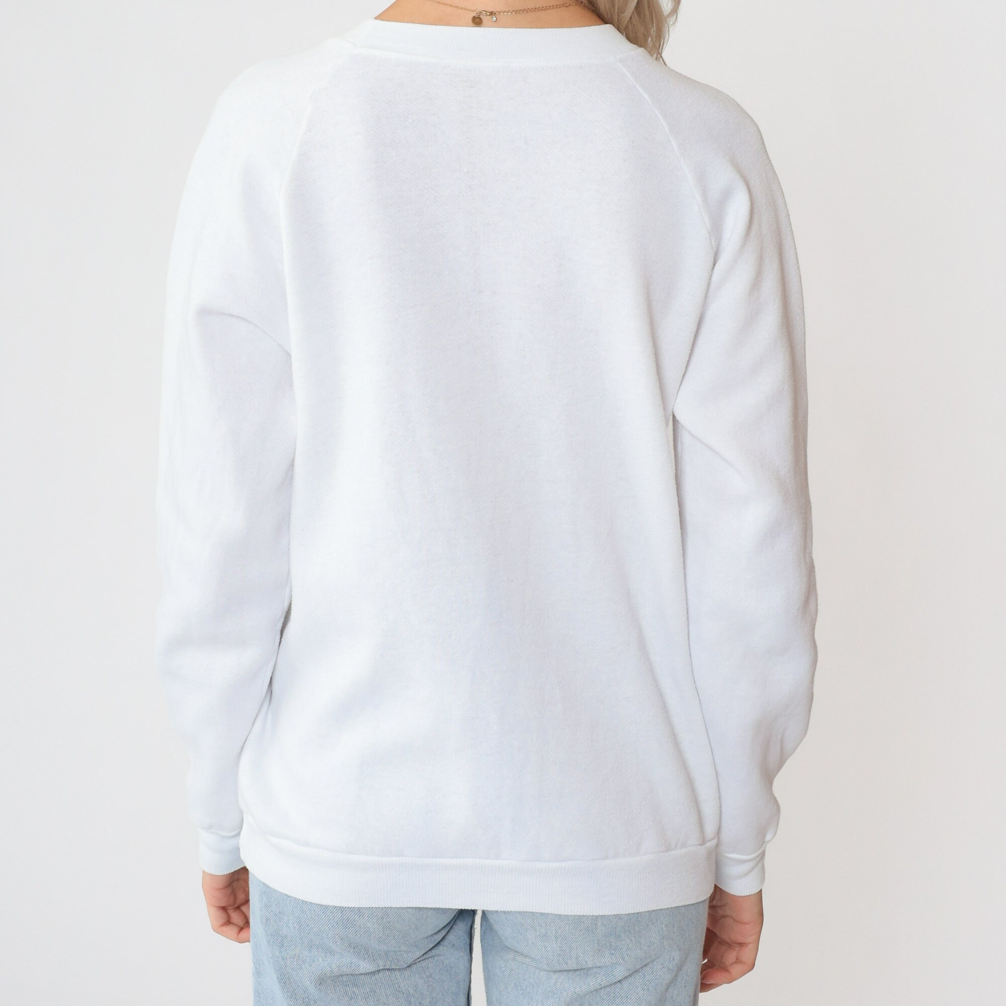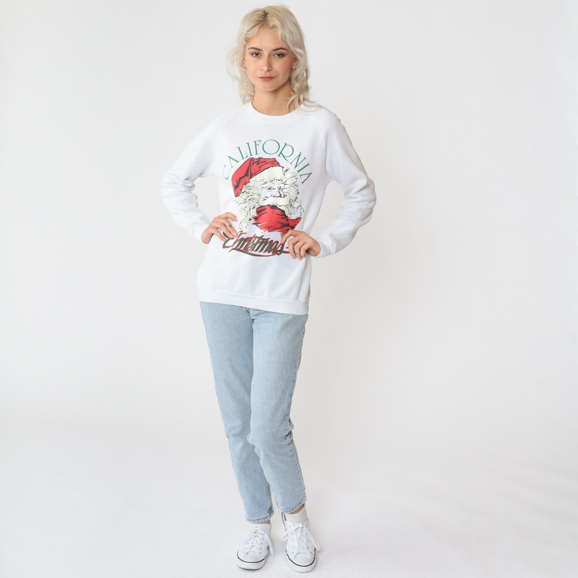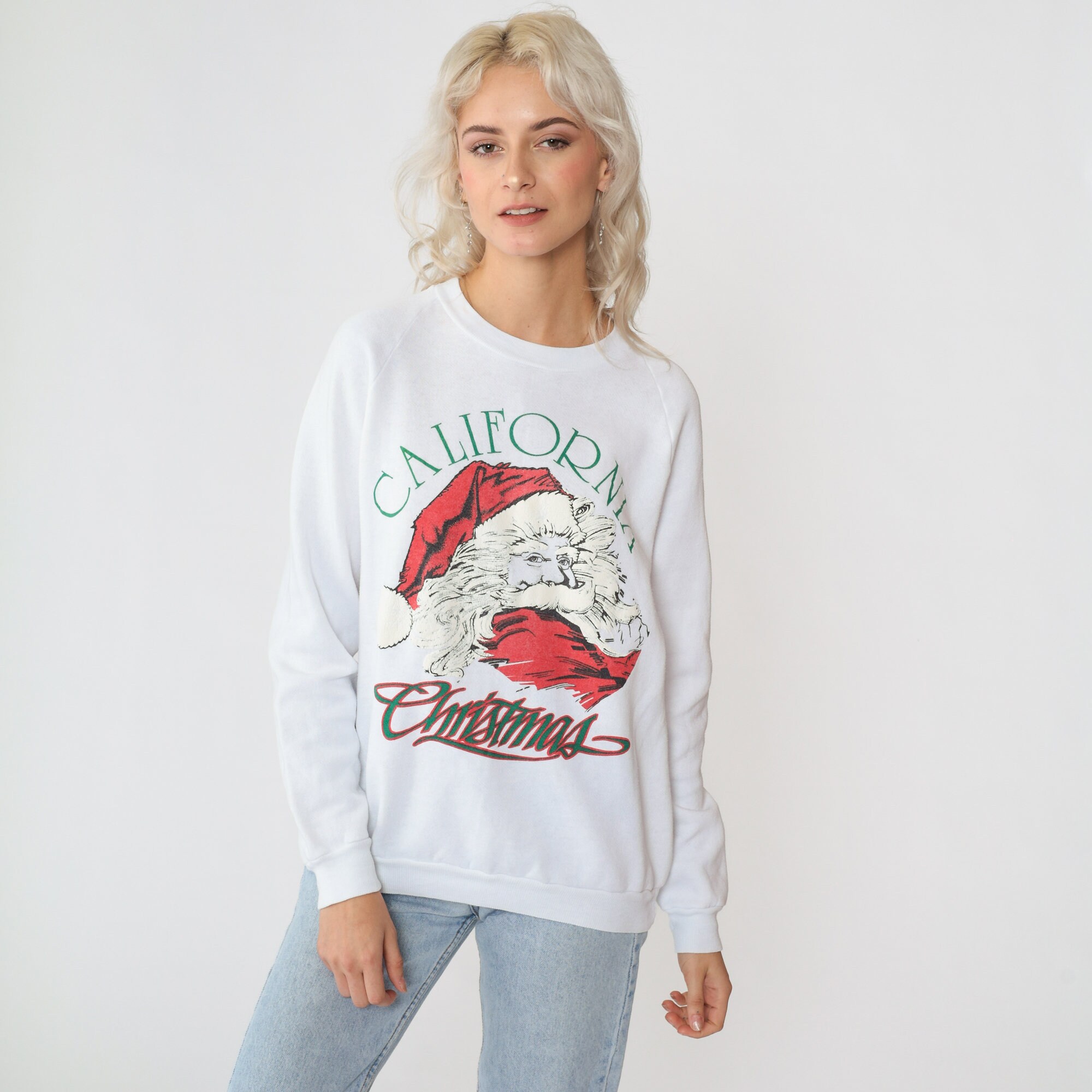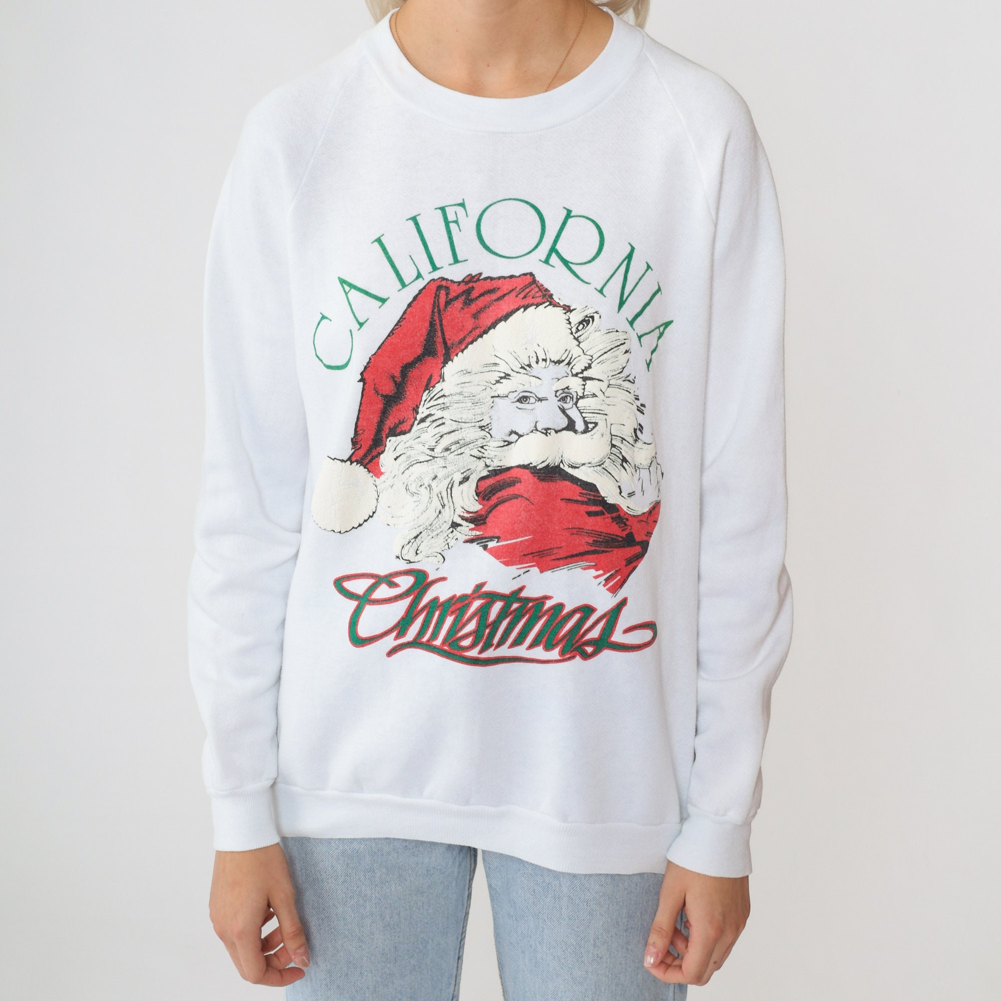 Vintage 90s sweatshirt in white with Santa and "California Christmas" on the front. Pullover style with raglan sleeves.