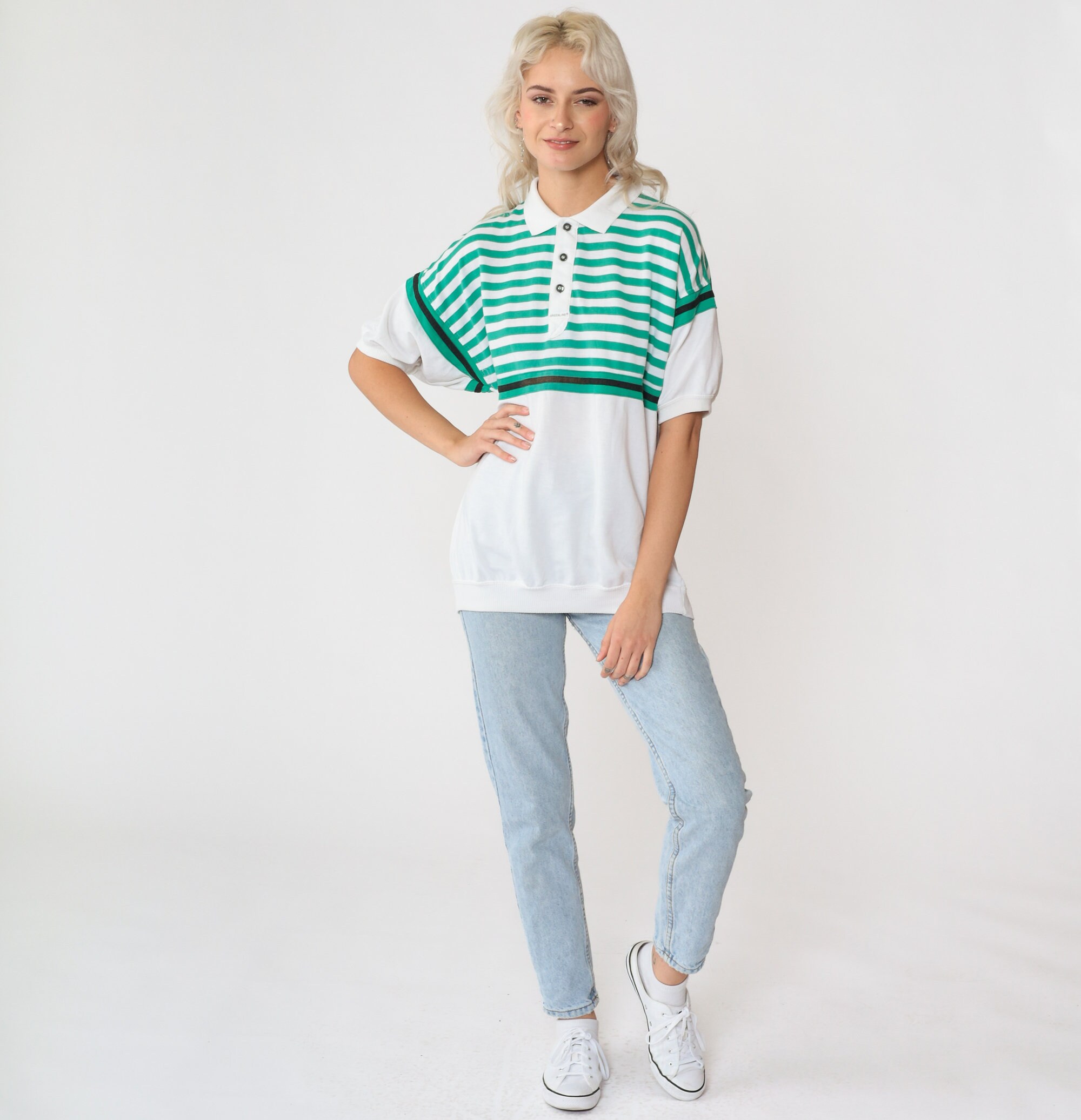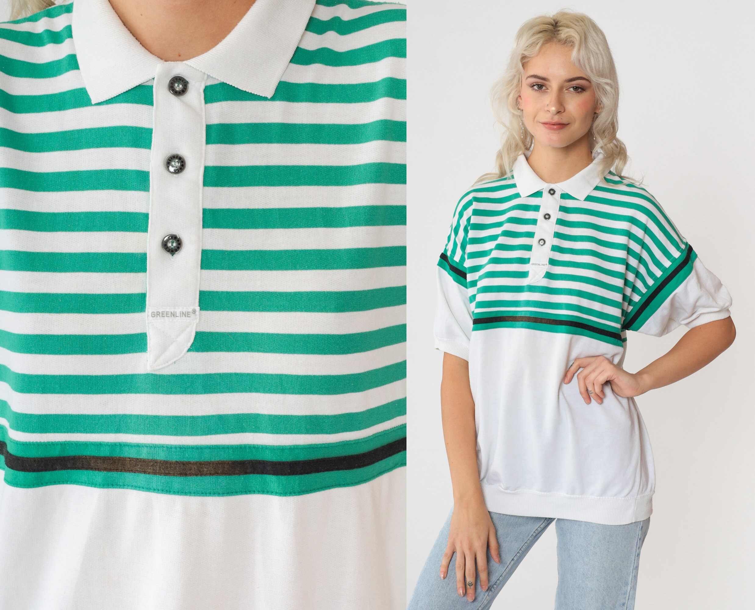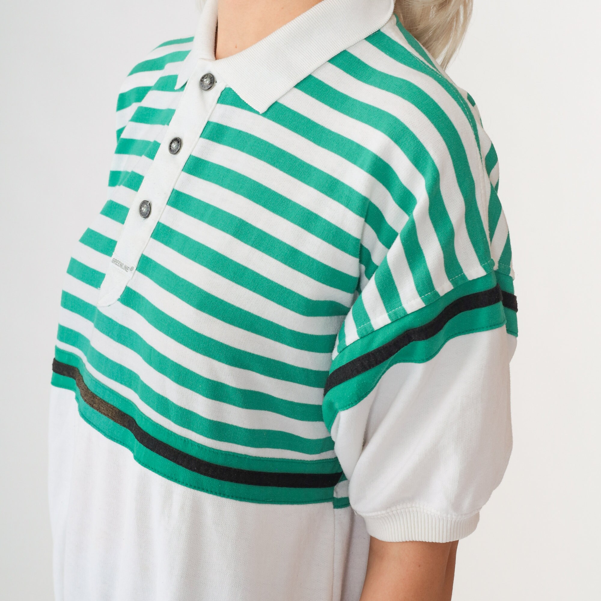Vintage 90s shirt in white with green stripes with a collar and a banded hem.