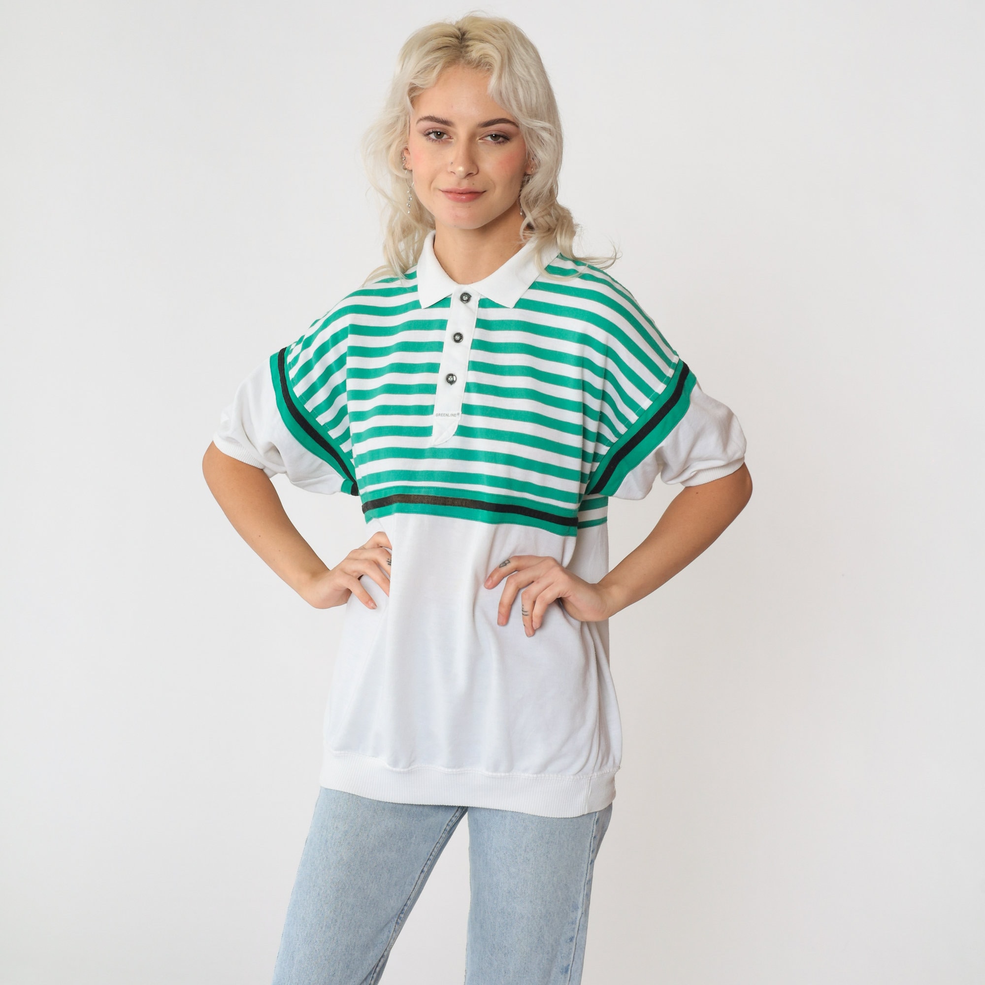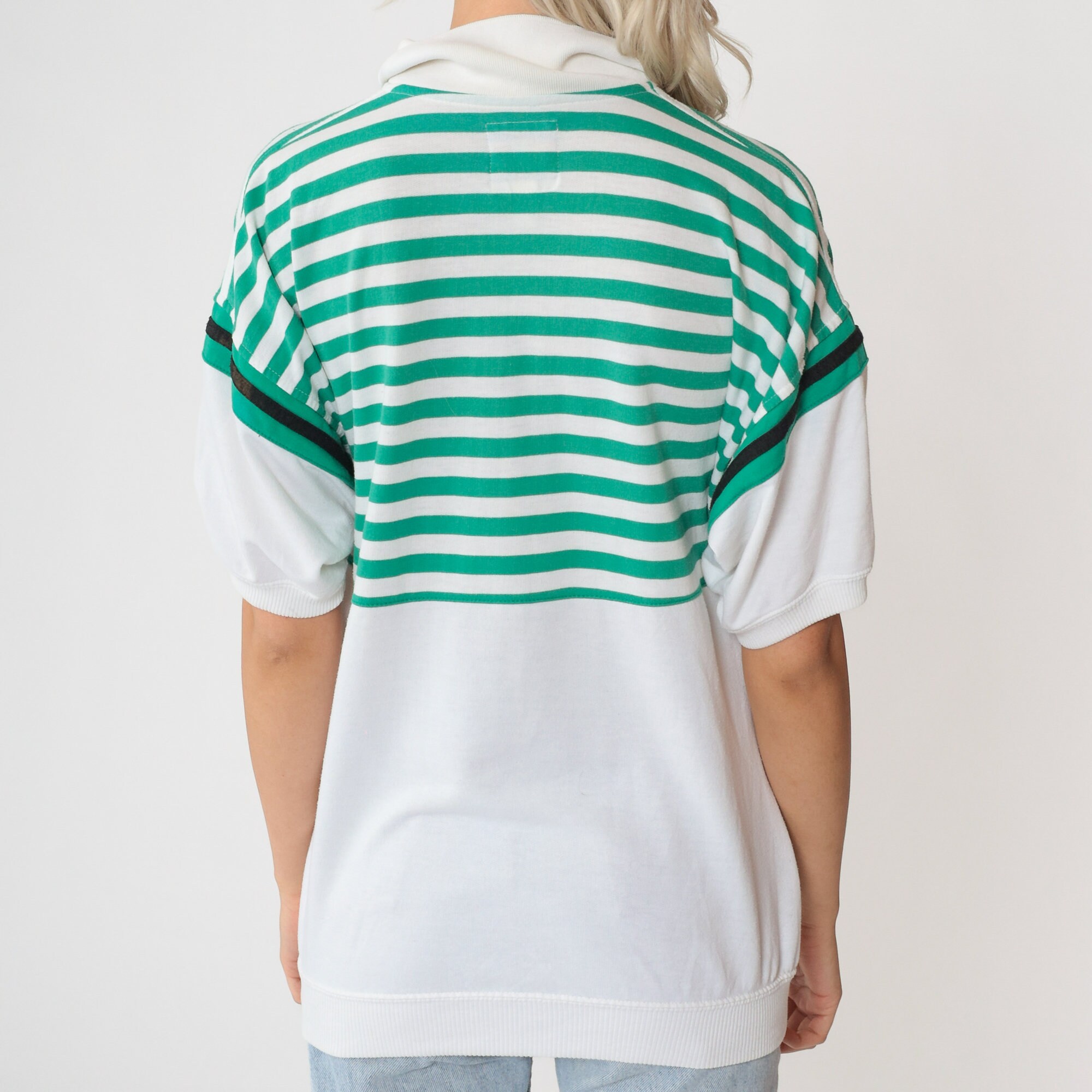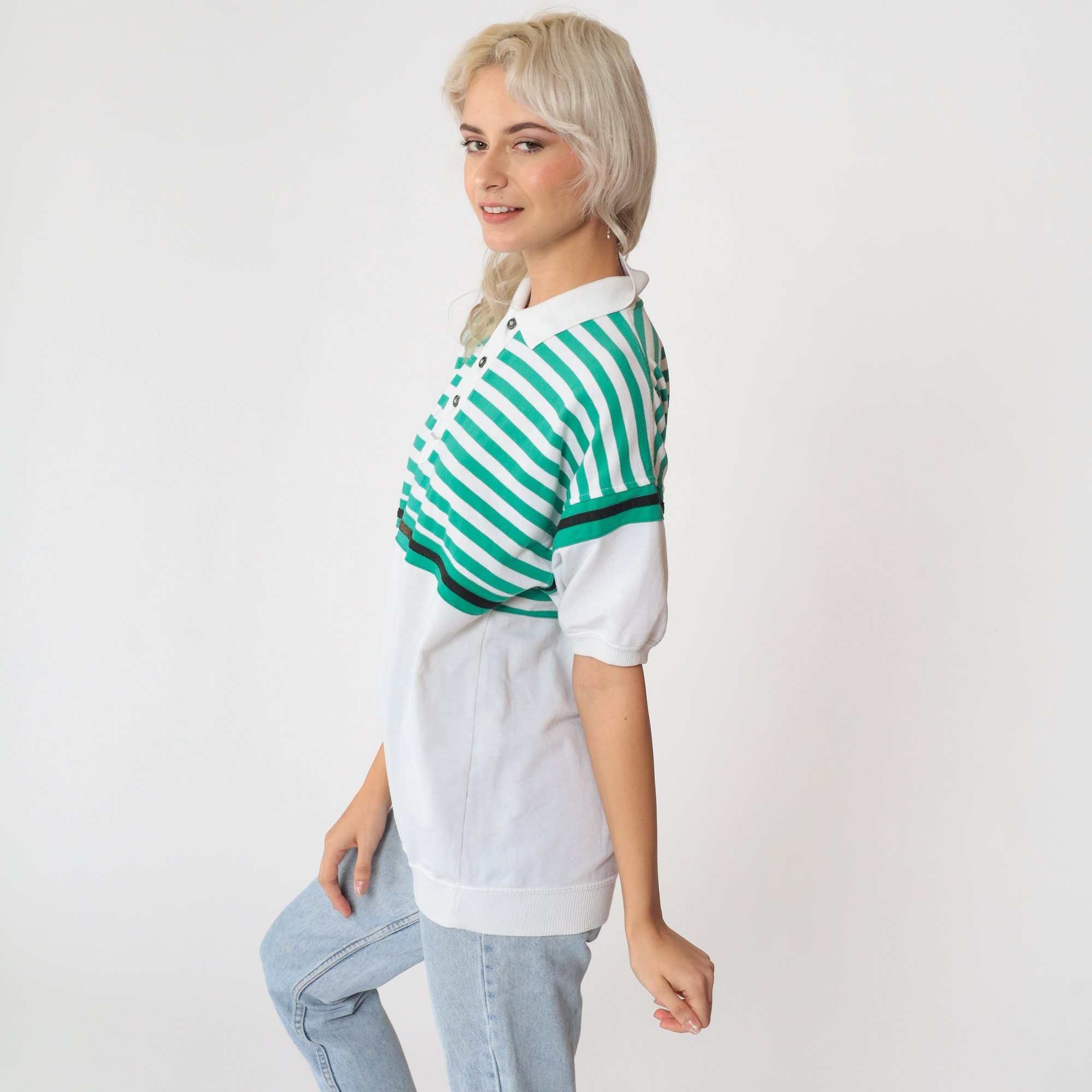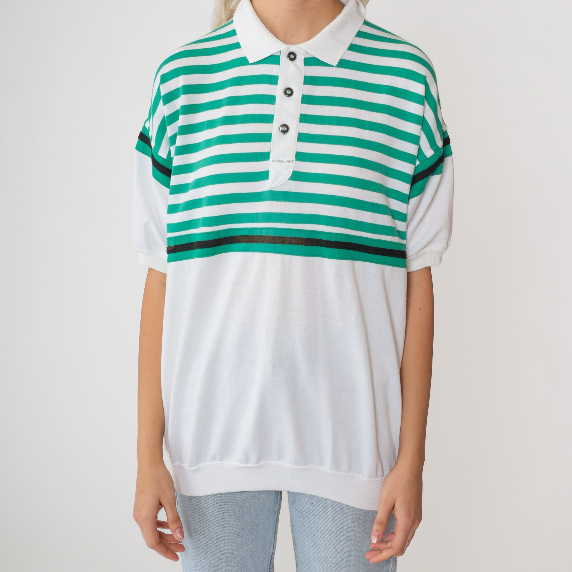 Vintage 90s shirt in white with green stripes with a collar and a banded hem.