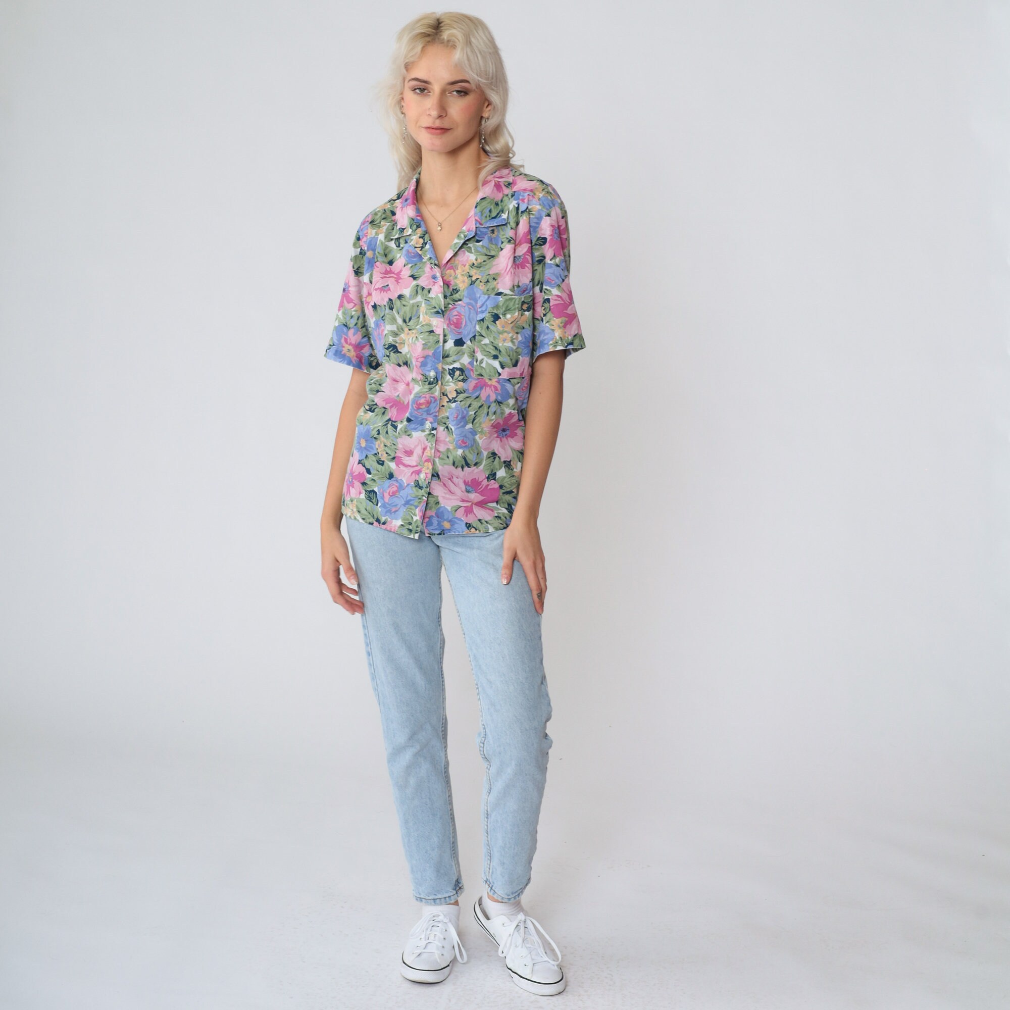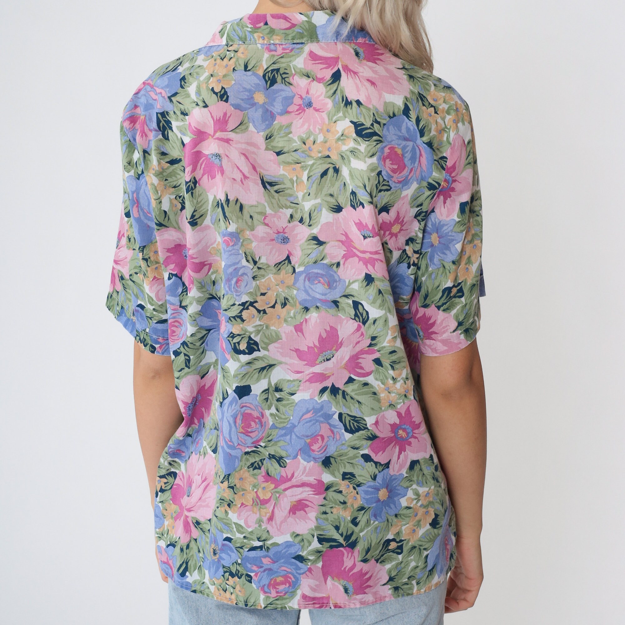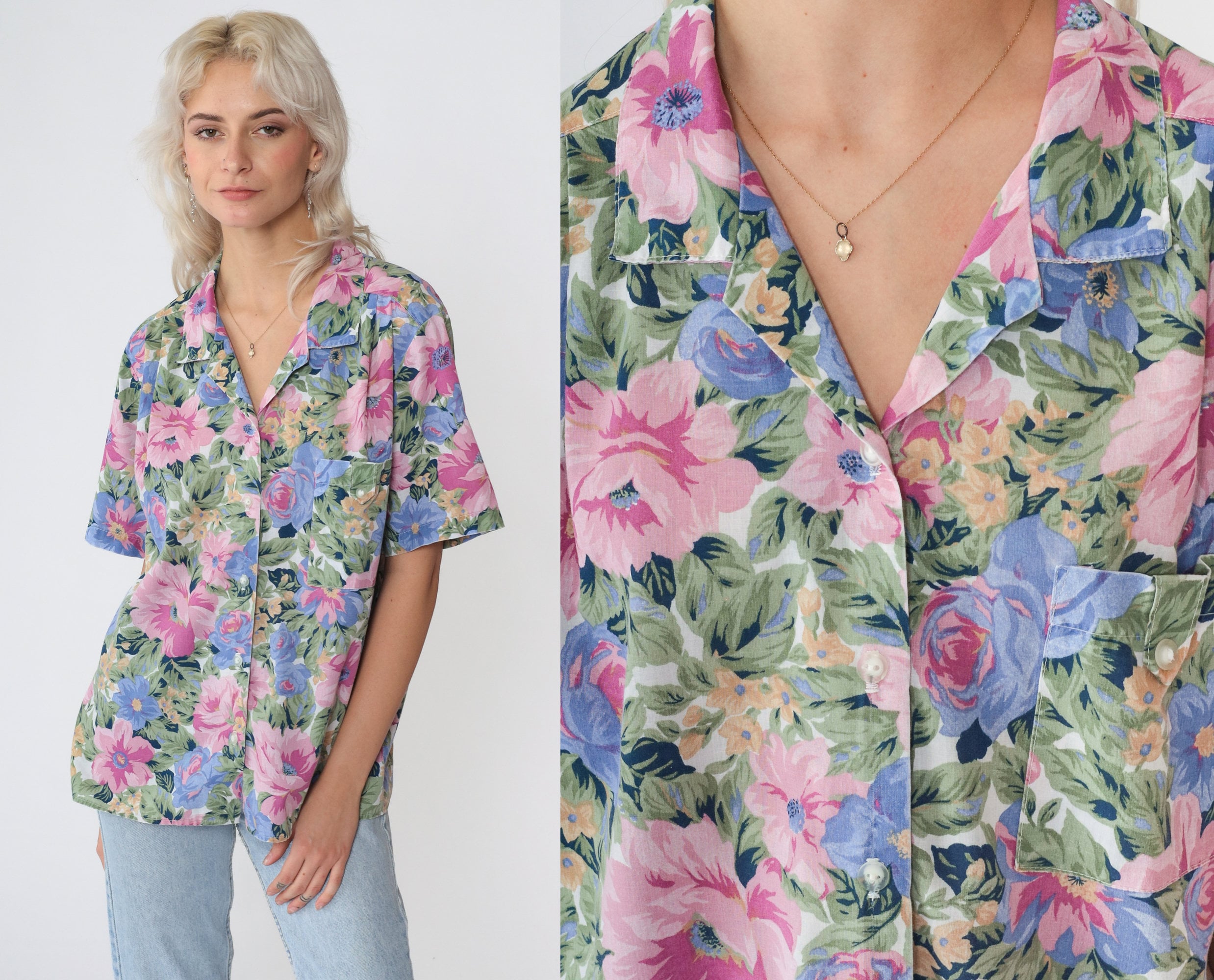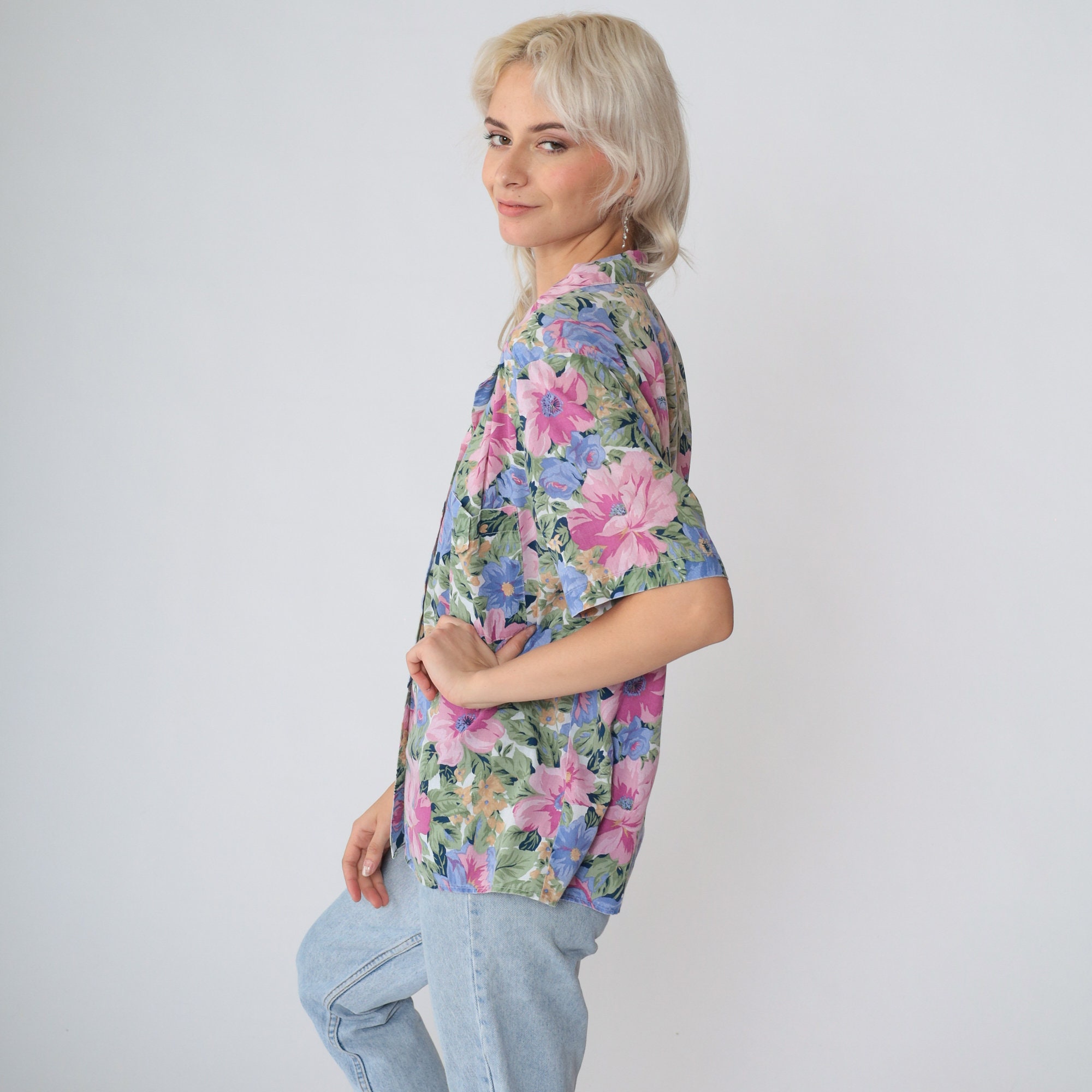 Vintage 90s shirt in a floral print. Buttons up the front with short sleeves and a collar.