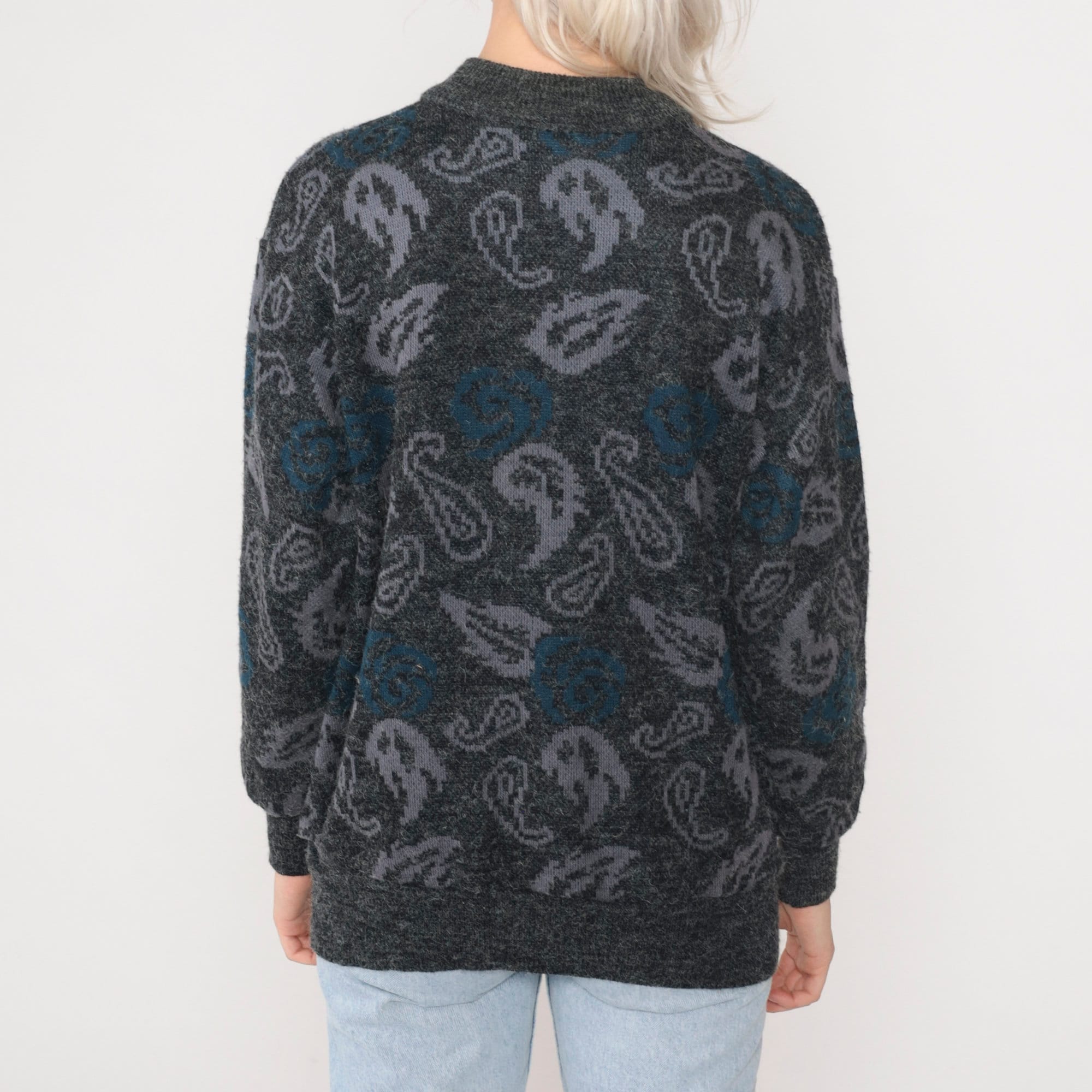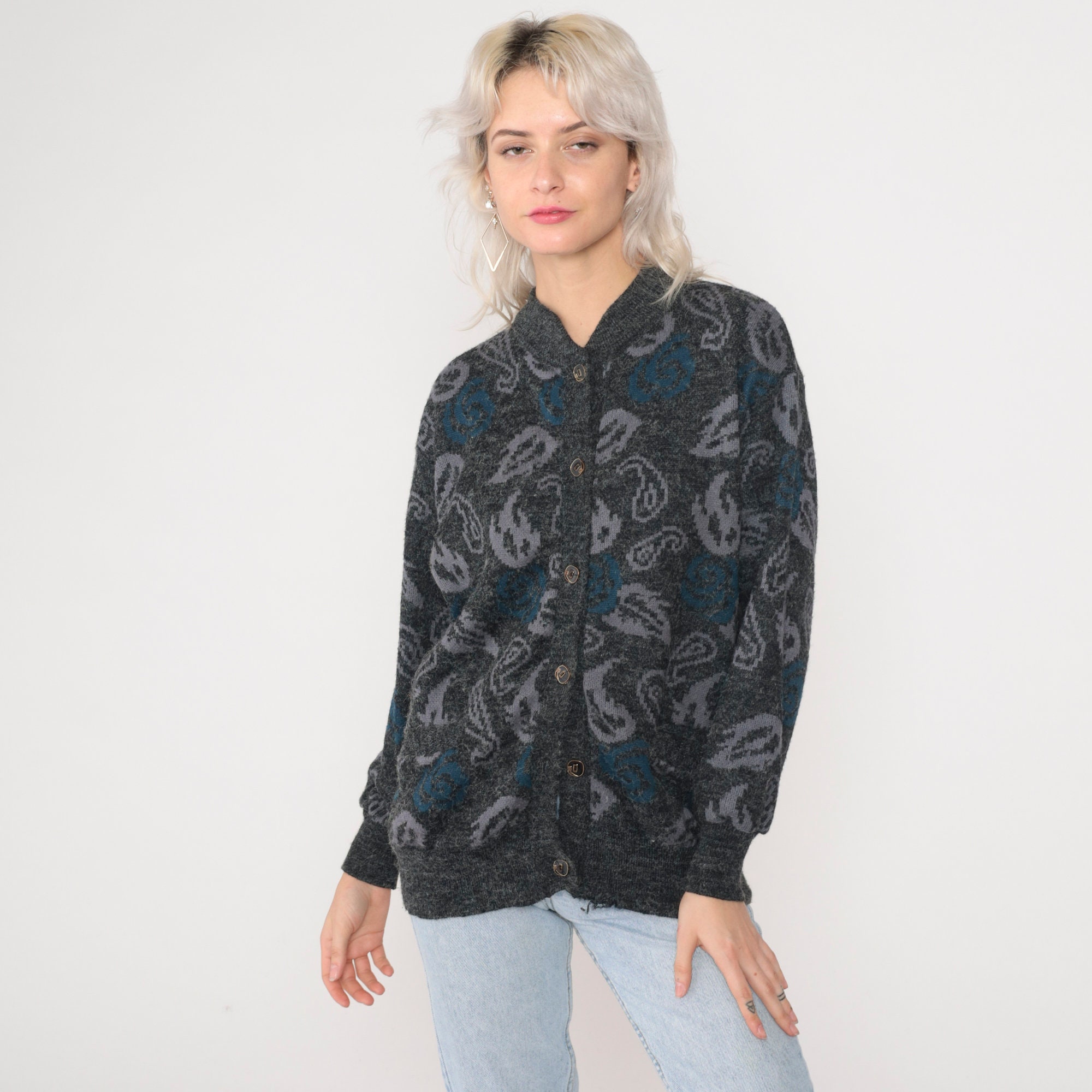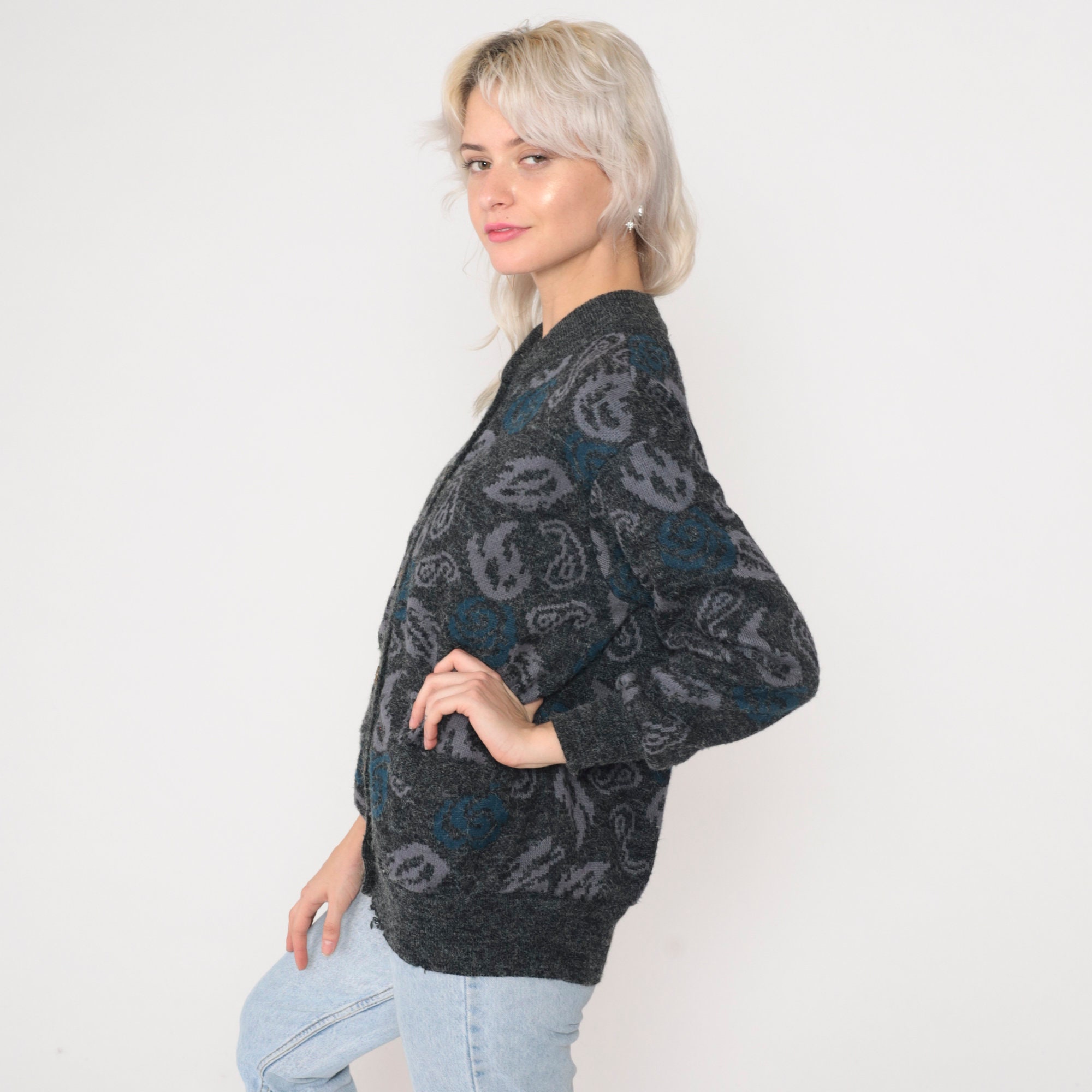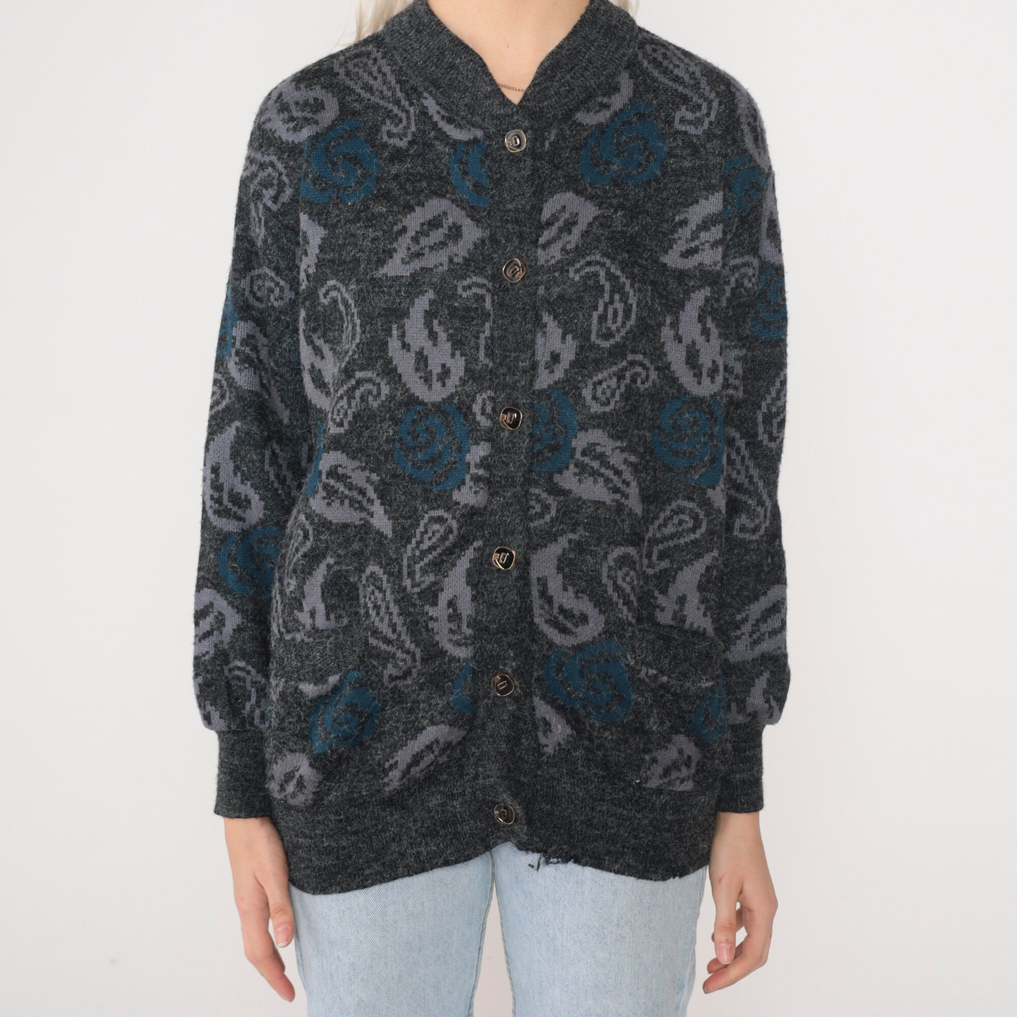 Vintage 90s cardigan in grey knit with a paisley floral print and buttons up the front.