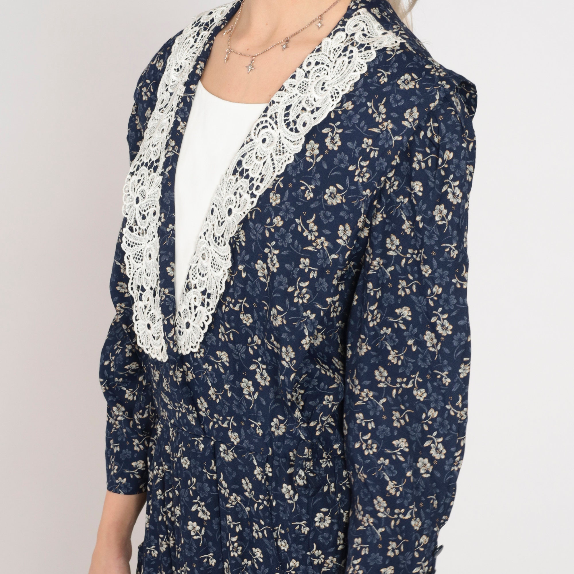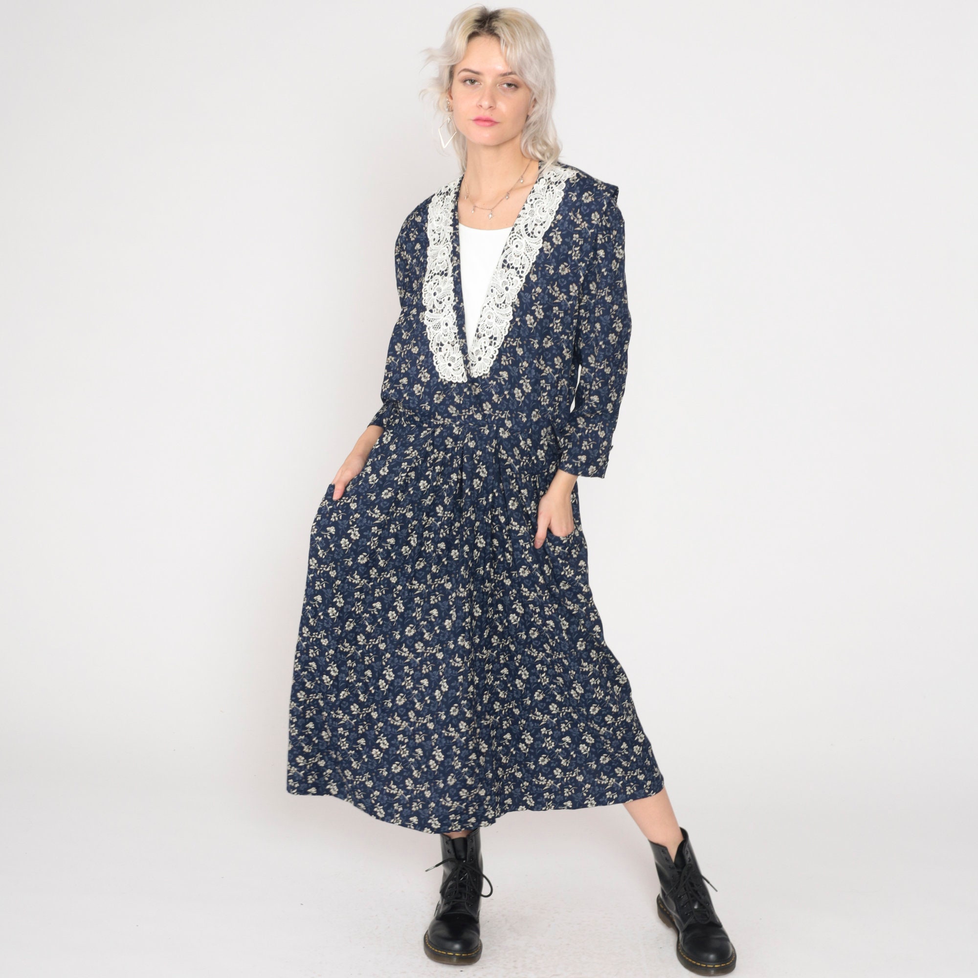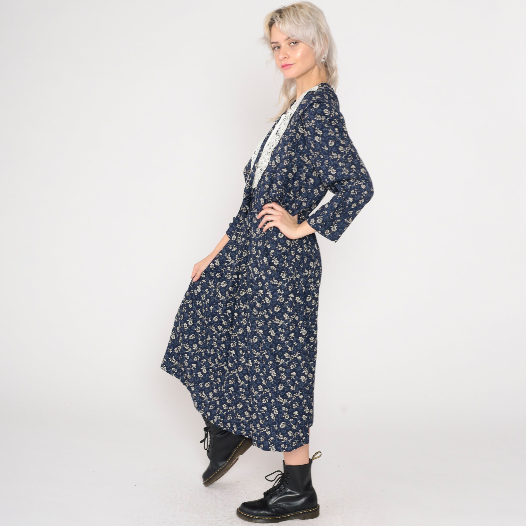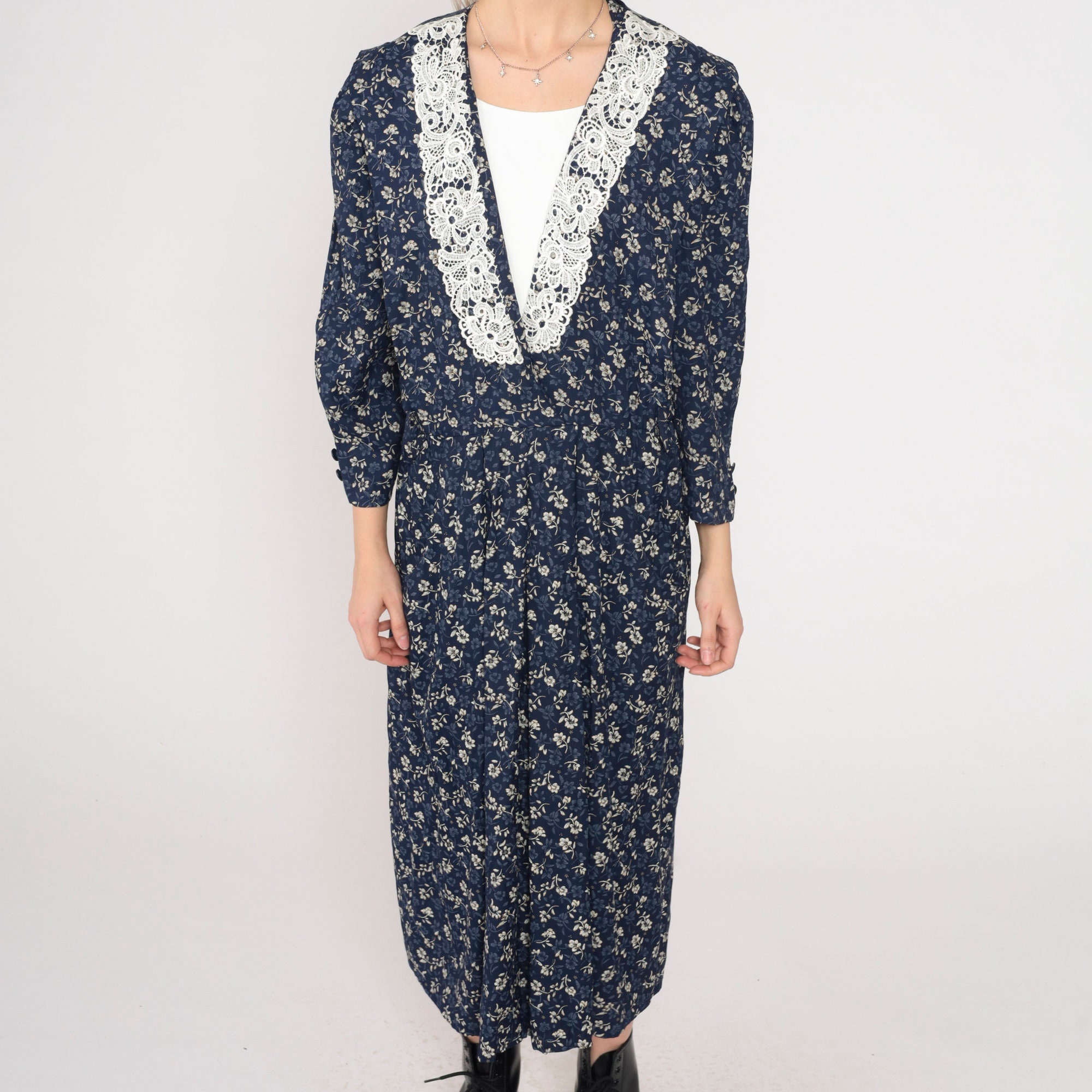 Vintage 90s dress in a navy blue floral print. 3/4 puff sleeves and a v neck with a white inset and a floral lace applique. Midi length.