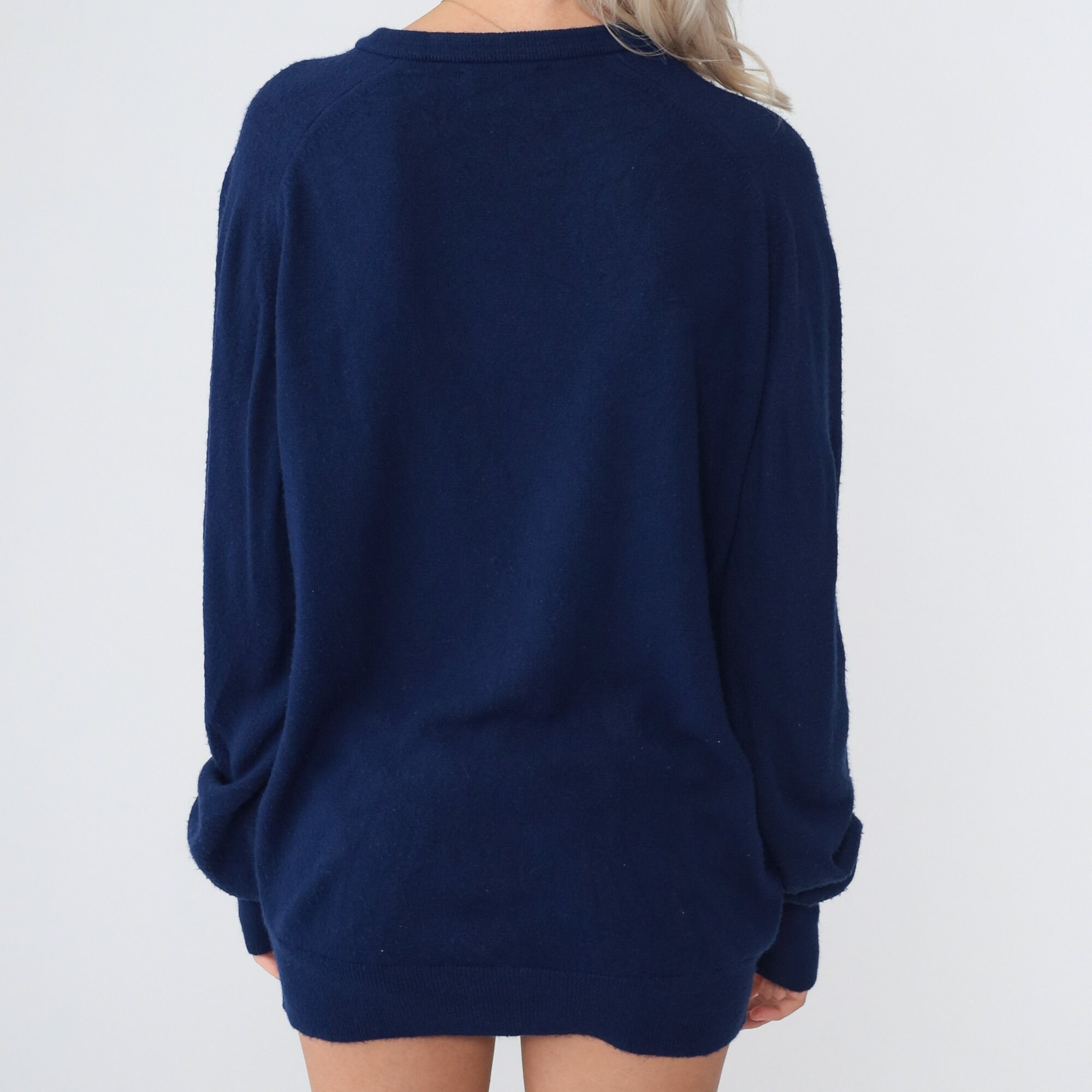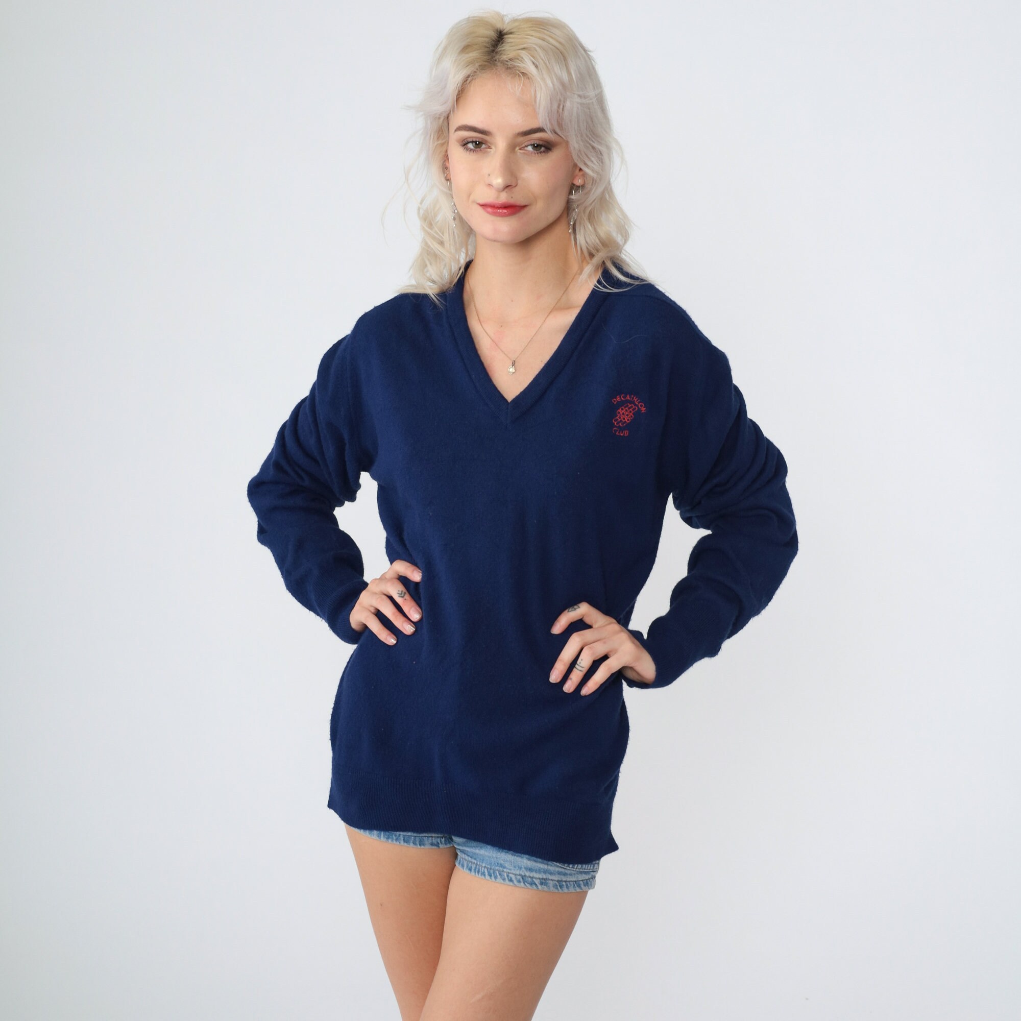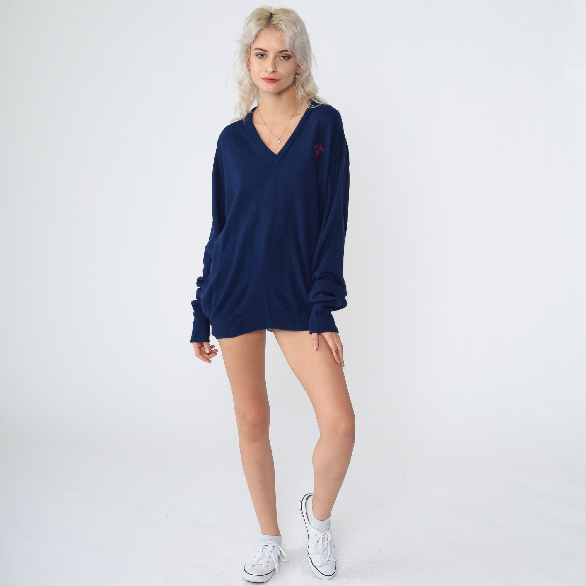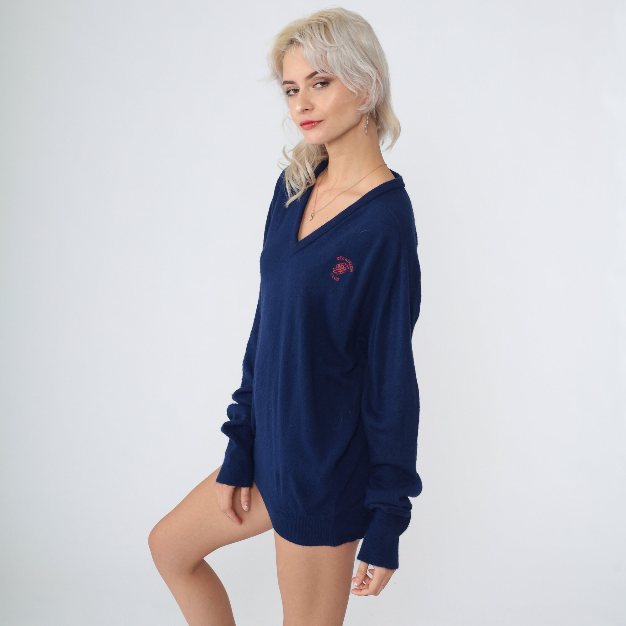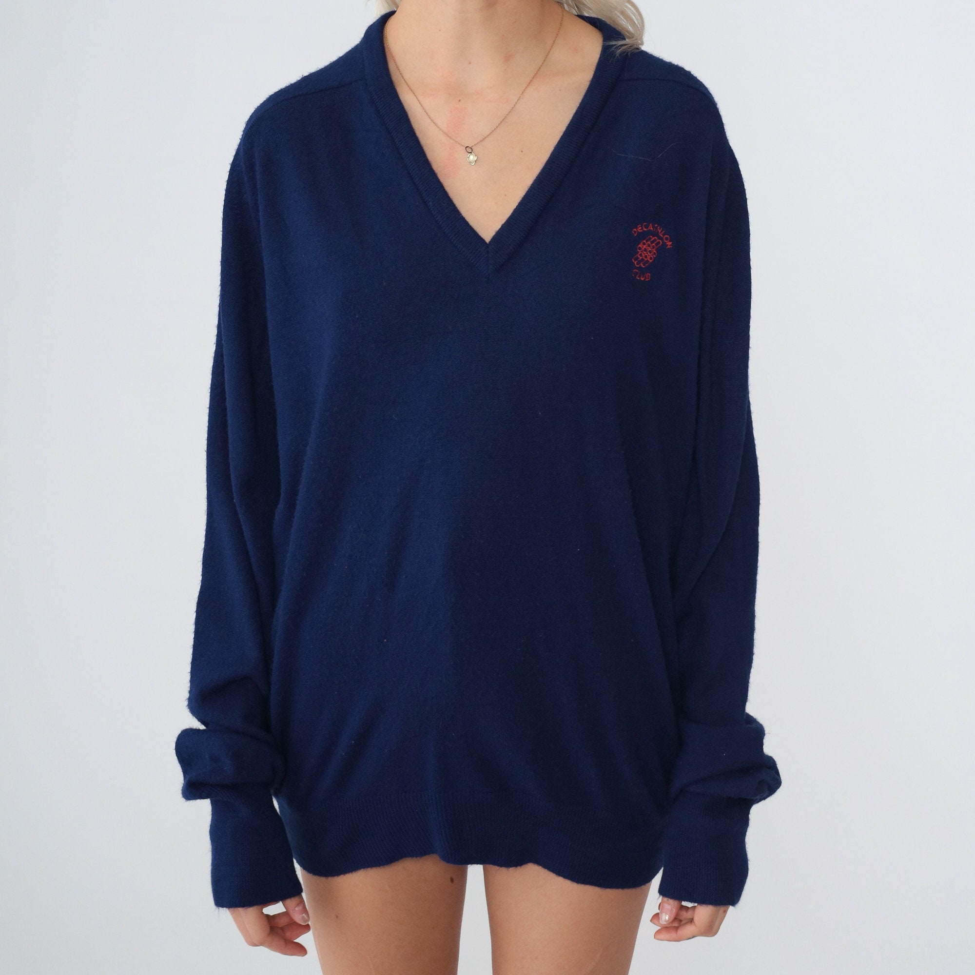 Vintage 80s sweater in blue knit with a v neck and a "Decathlon Club" logo embroidered on the chest.