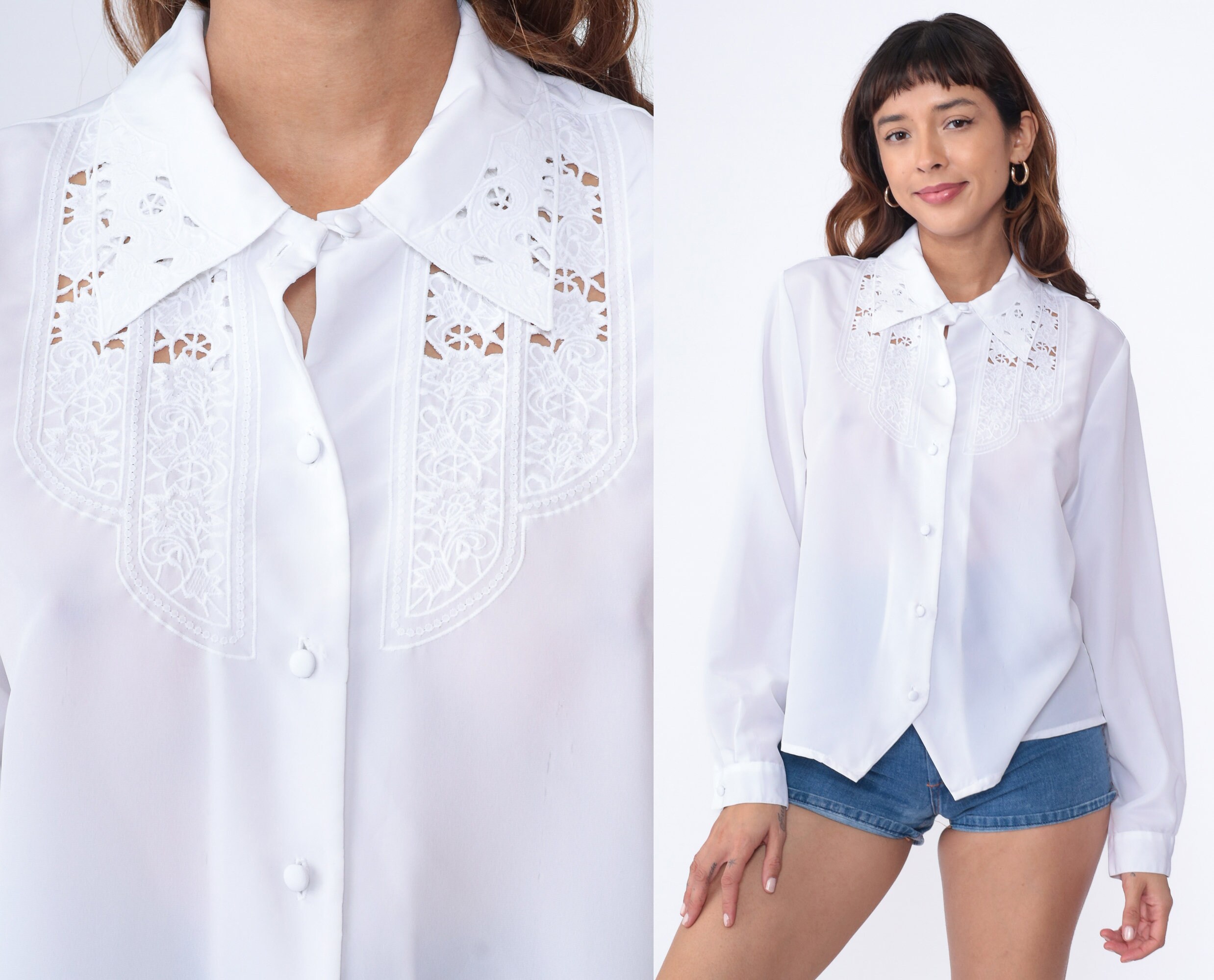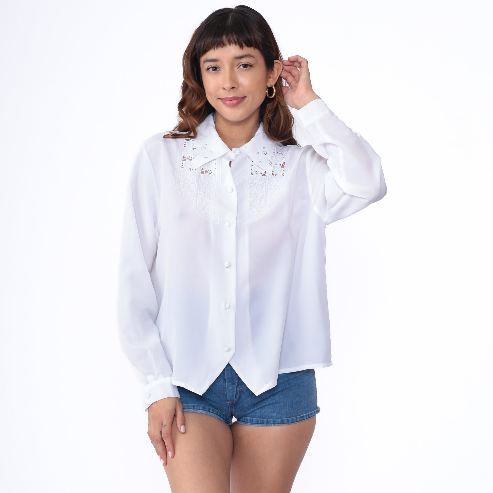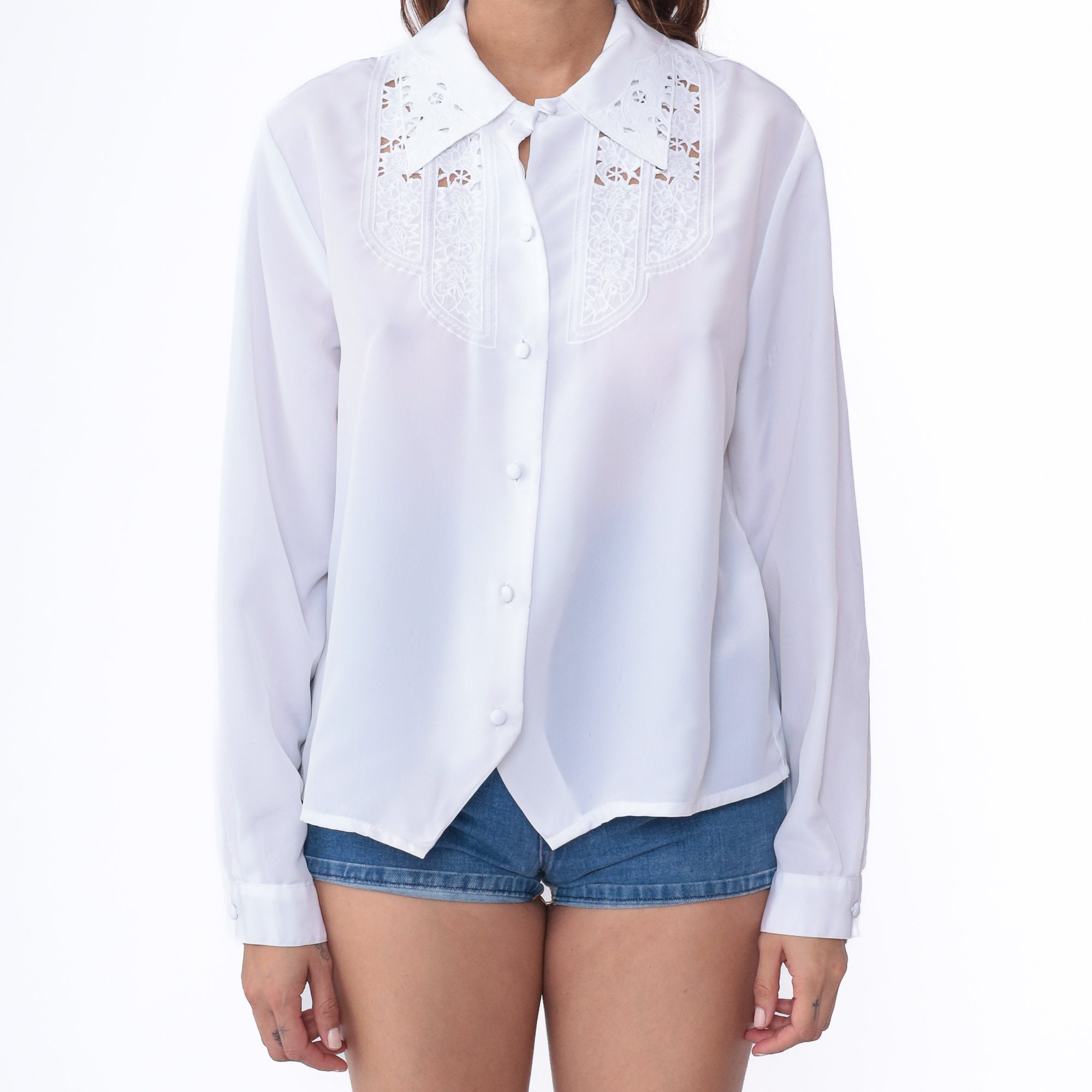 Vintage 90s blouse in white with lace cutouts and floral embroidery. Long sleeves, buttons up the front.