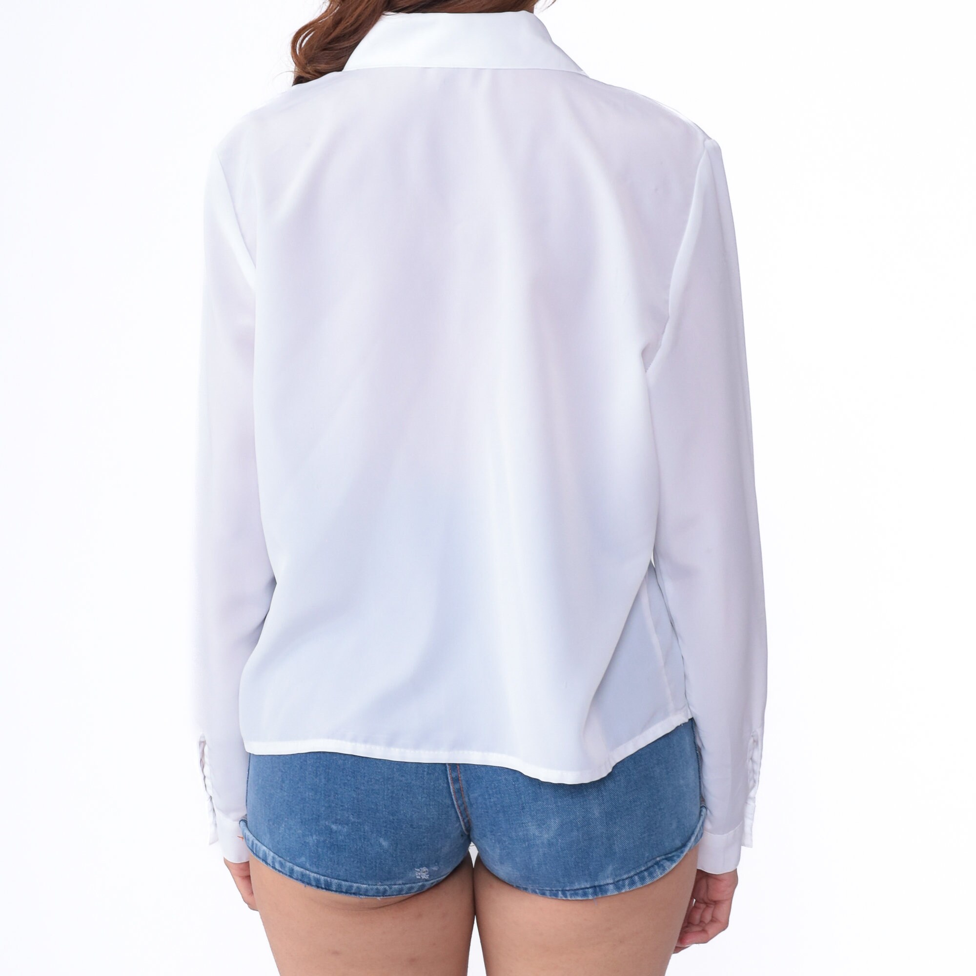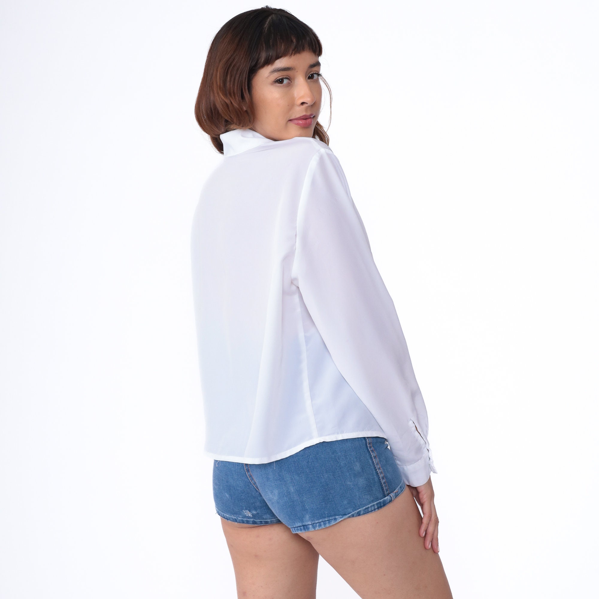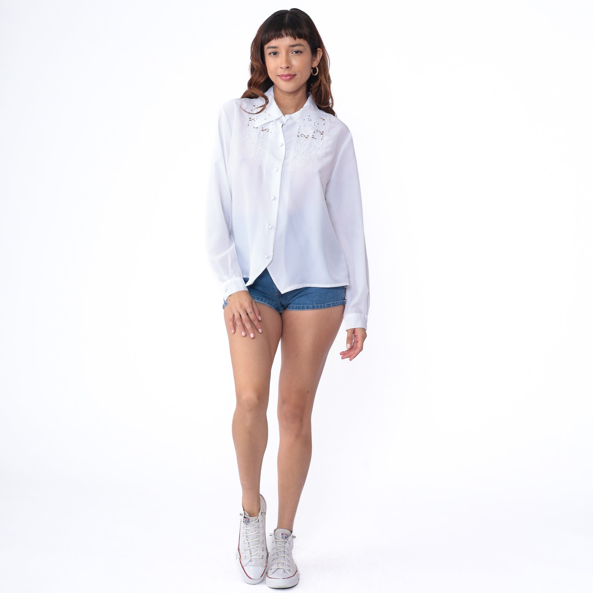 Vintage 90s blouse in white with lace cutouts and floral embroidery. Long sleeves, buttons up the front.