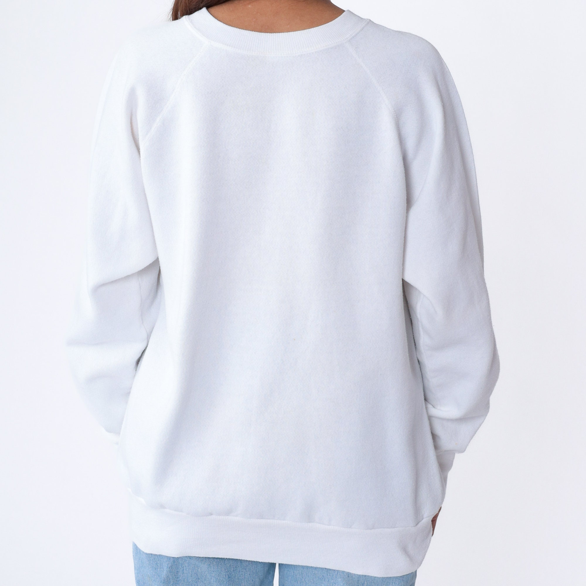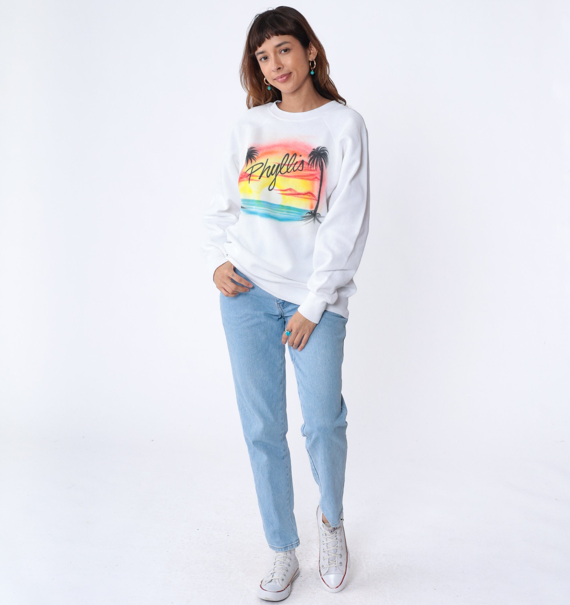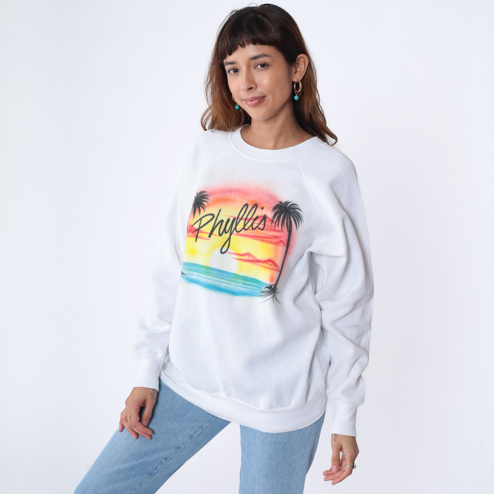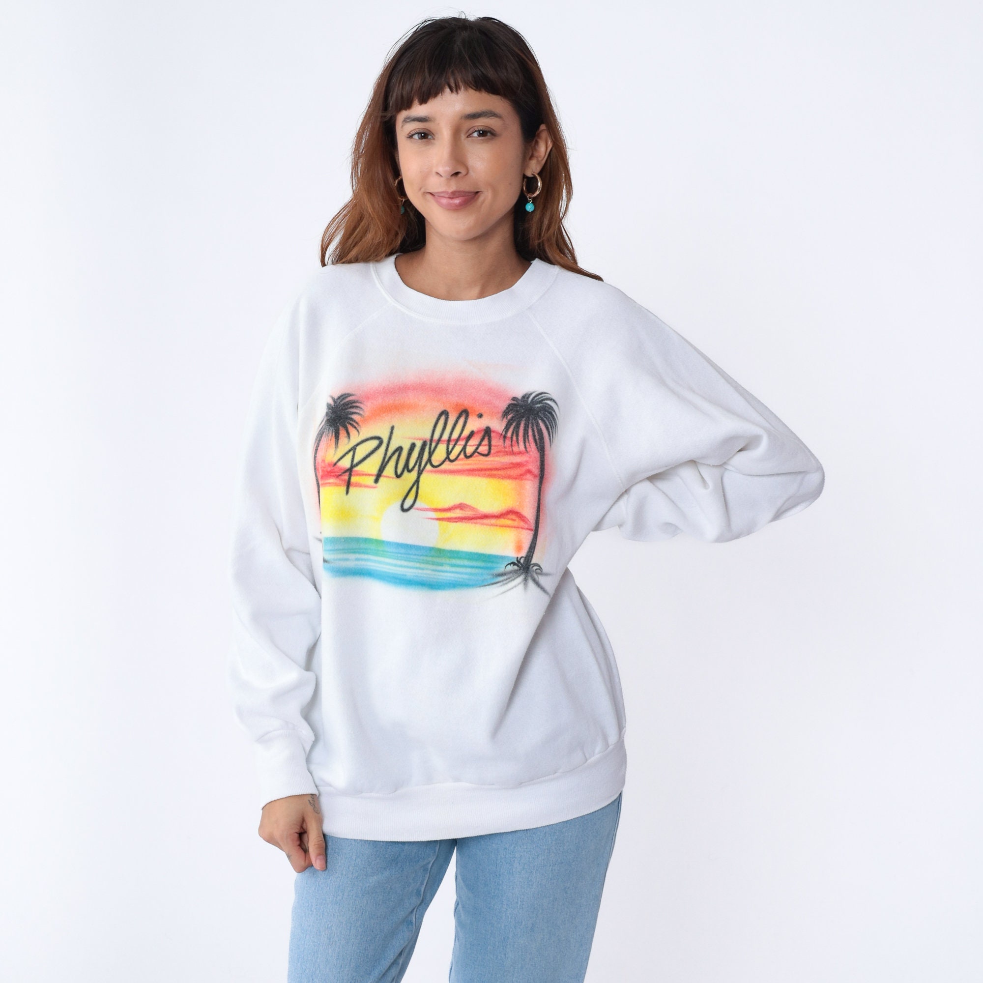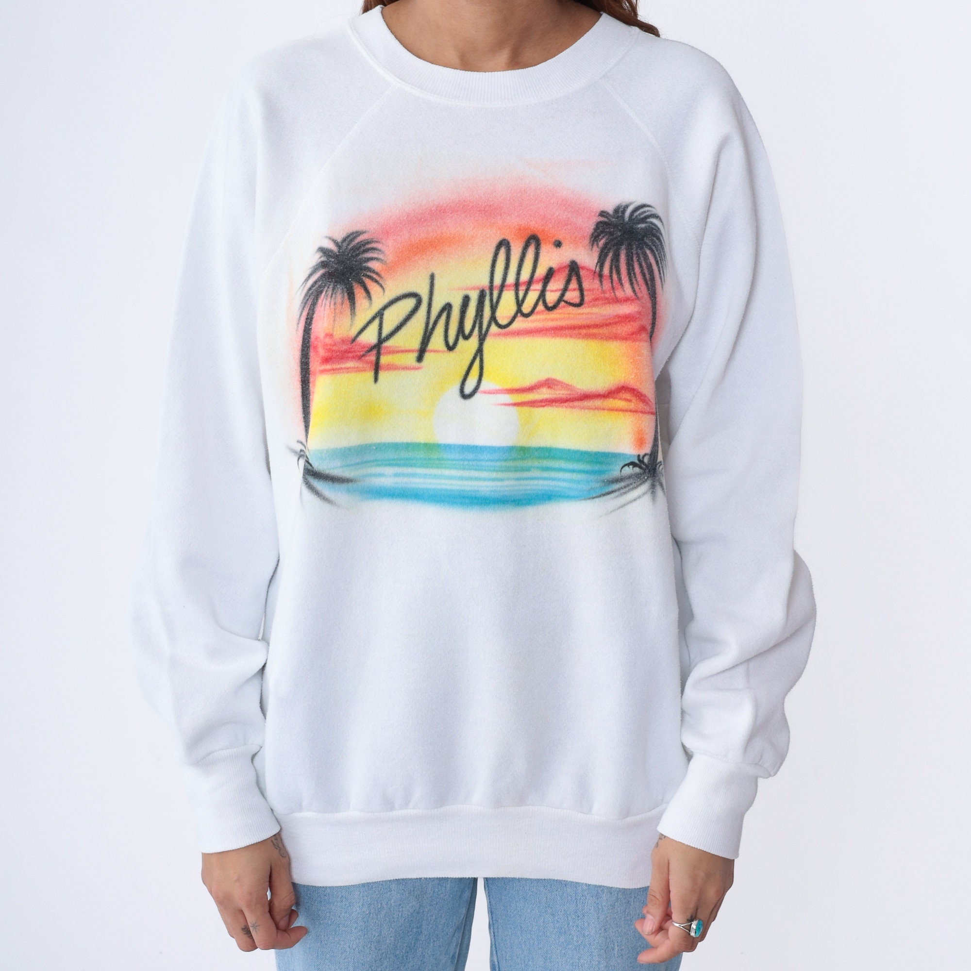 Vintage 80s sweatshirt in white with a Tropical island sunset graphic and "Phyllis" on the front.