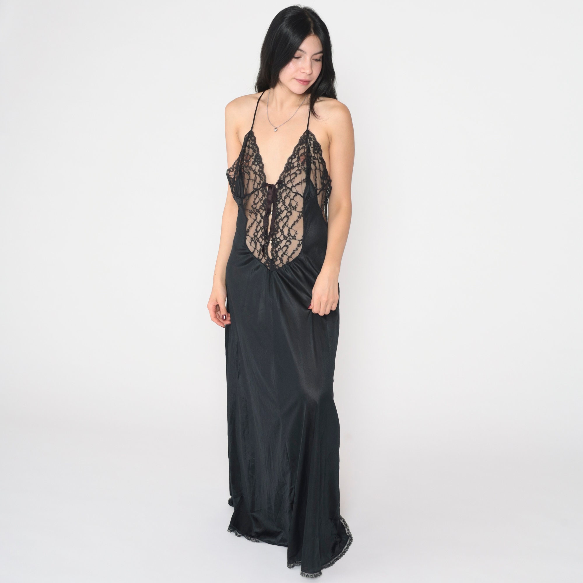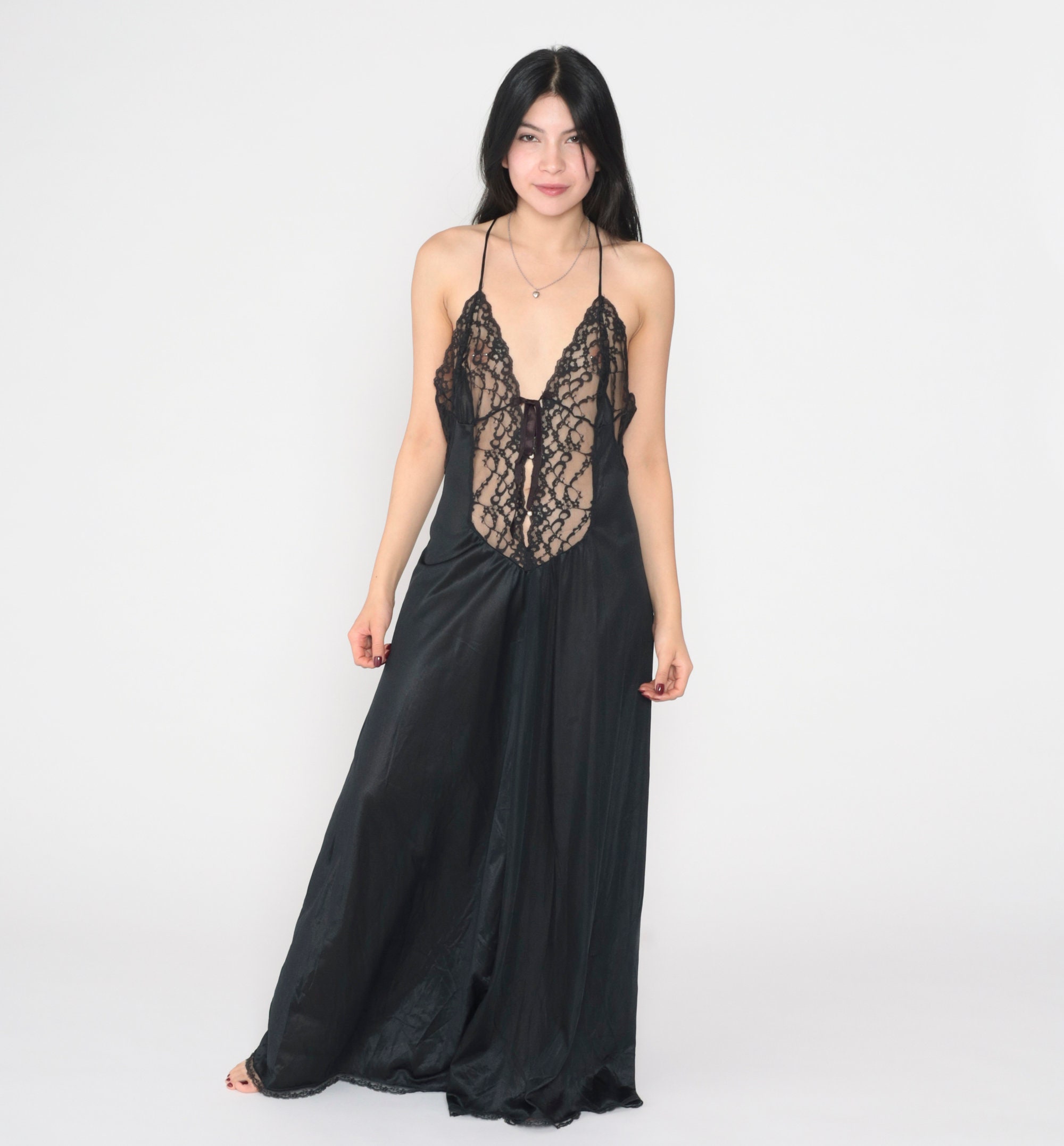 Vintage 80s nightgown in black with sheer lace and a lace-up bodice. Sleeveless with a low back. Maxi length.