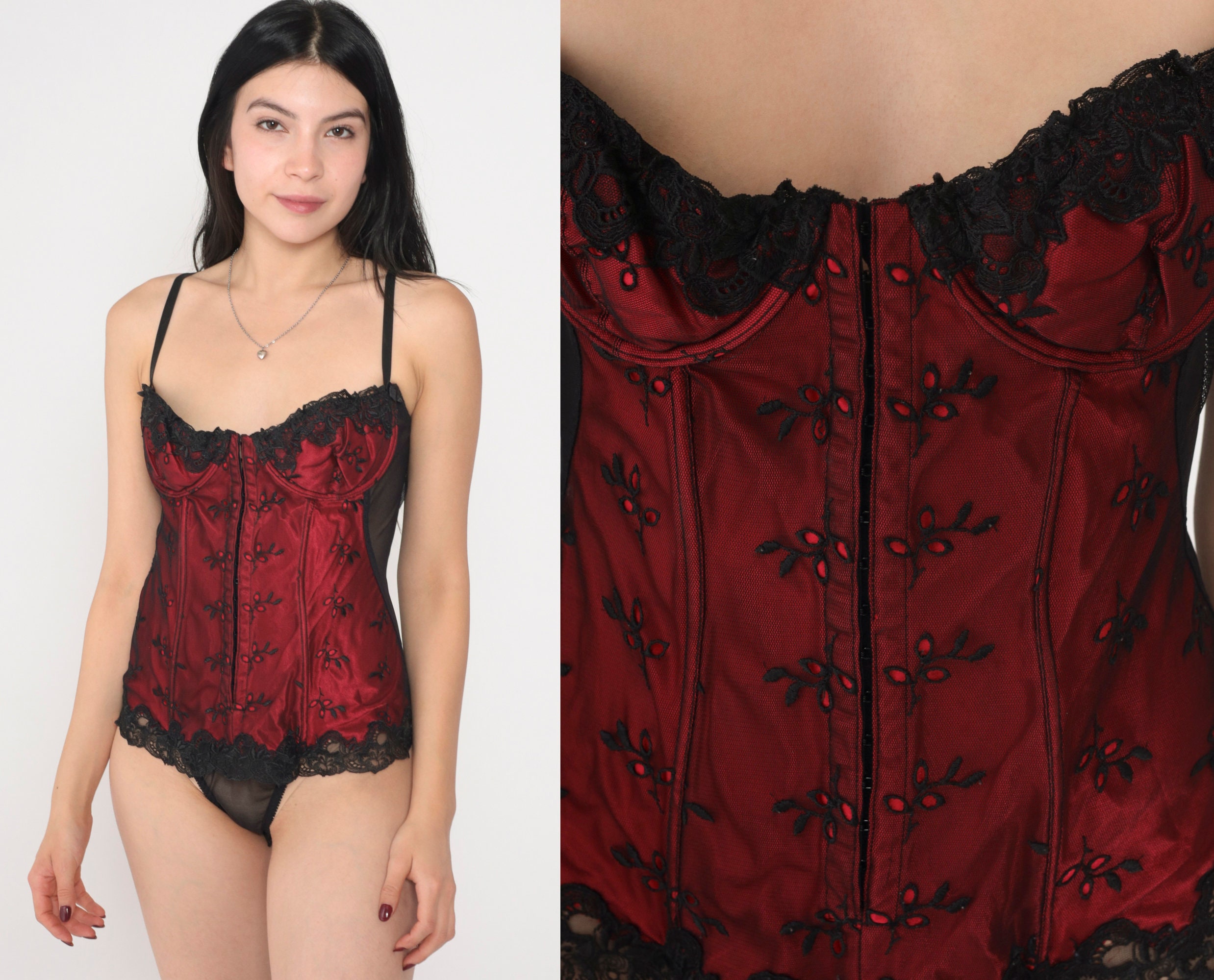 Vintage 90s bodysuit with a red floral embroidered front and a sheer black back. Bustier style cut with hook and eye closures up the front and floral lace trim.