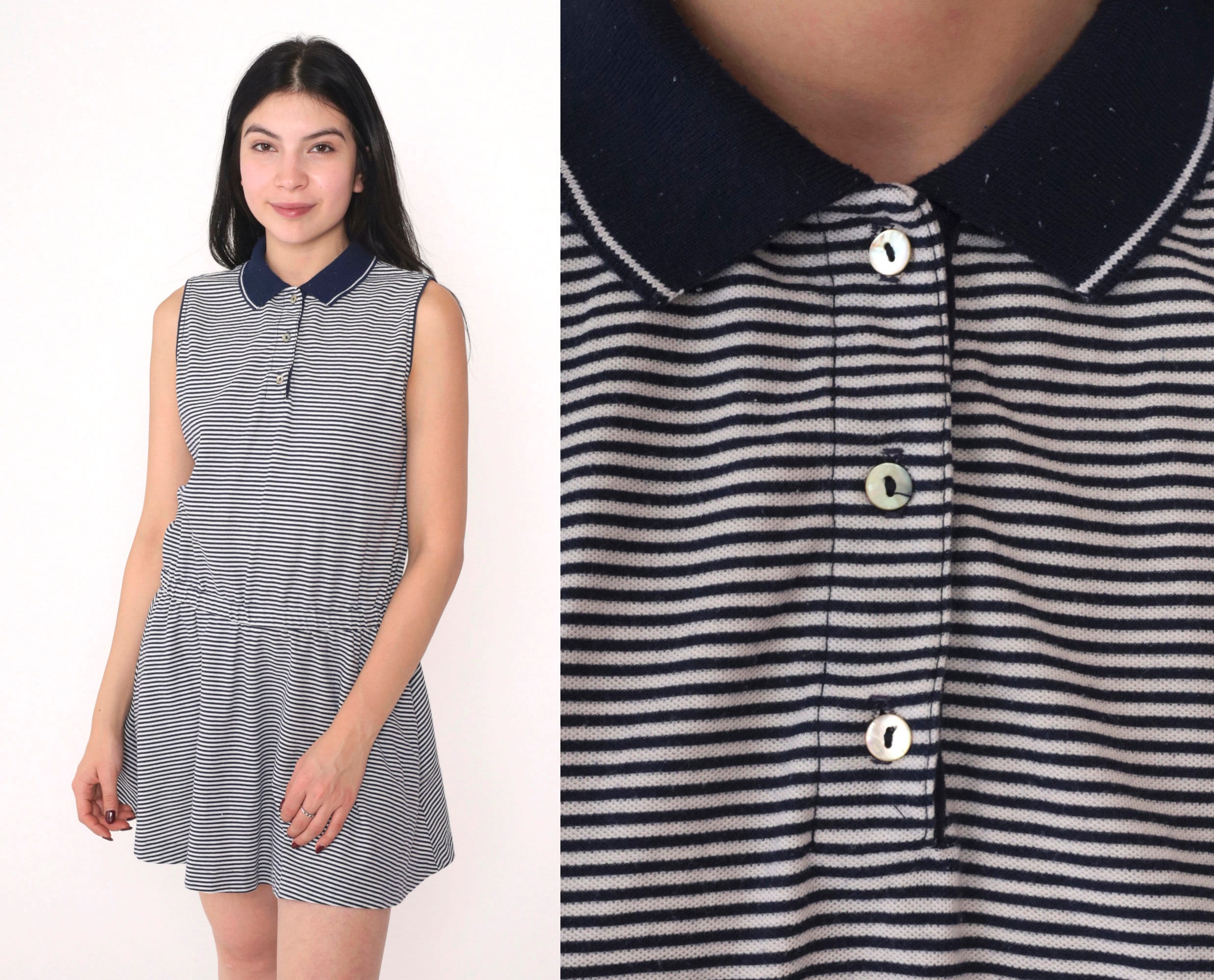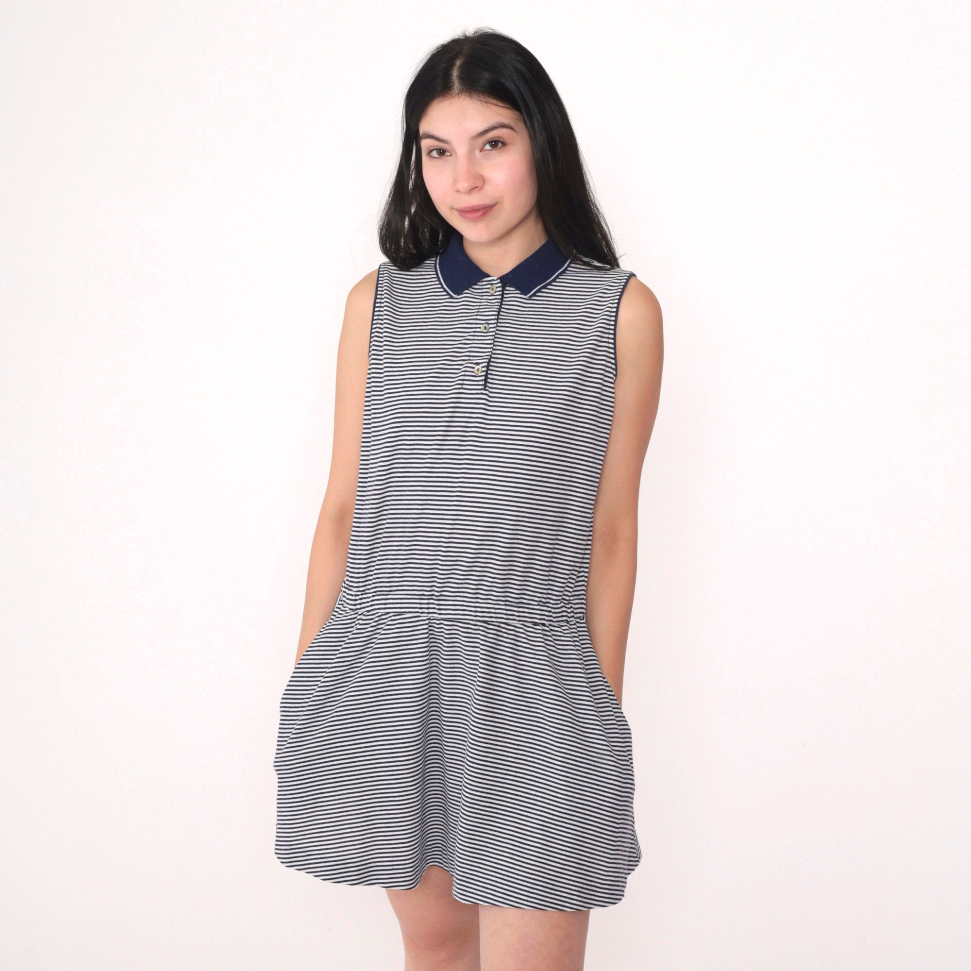 Vintage 80s dress by Tail in blue and white stripes. Sleeveless with a drop waist. Buttons up the chest with a collar. Mini length.
