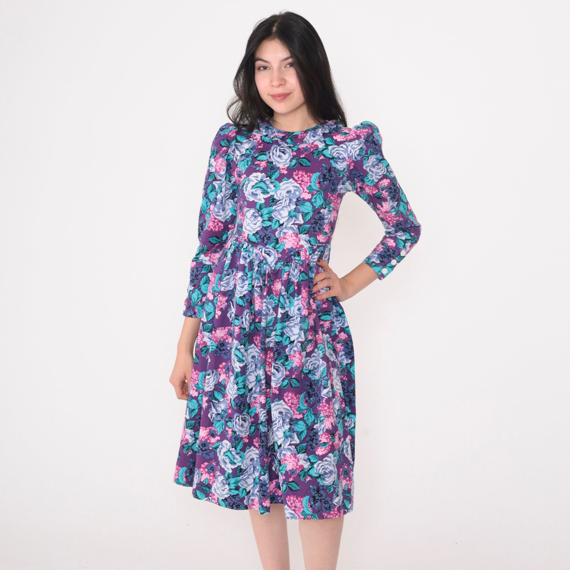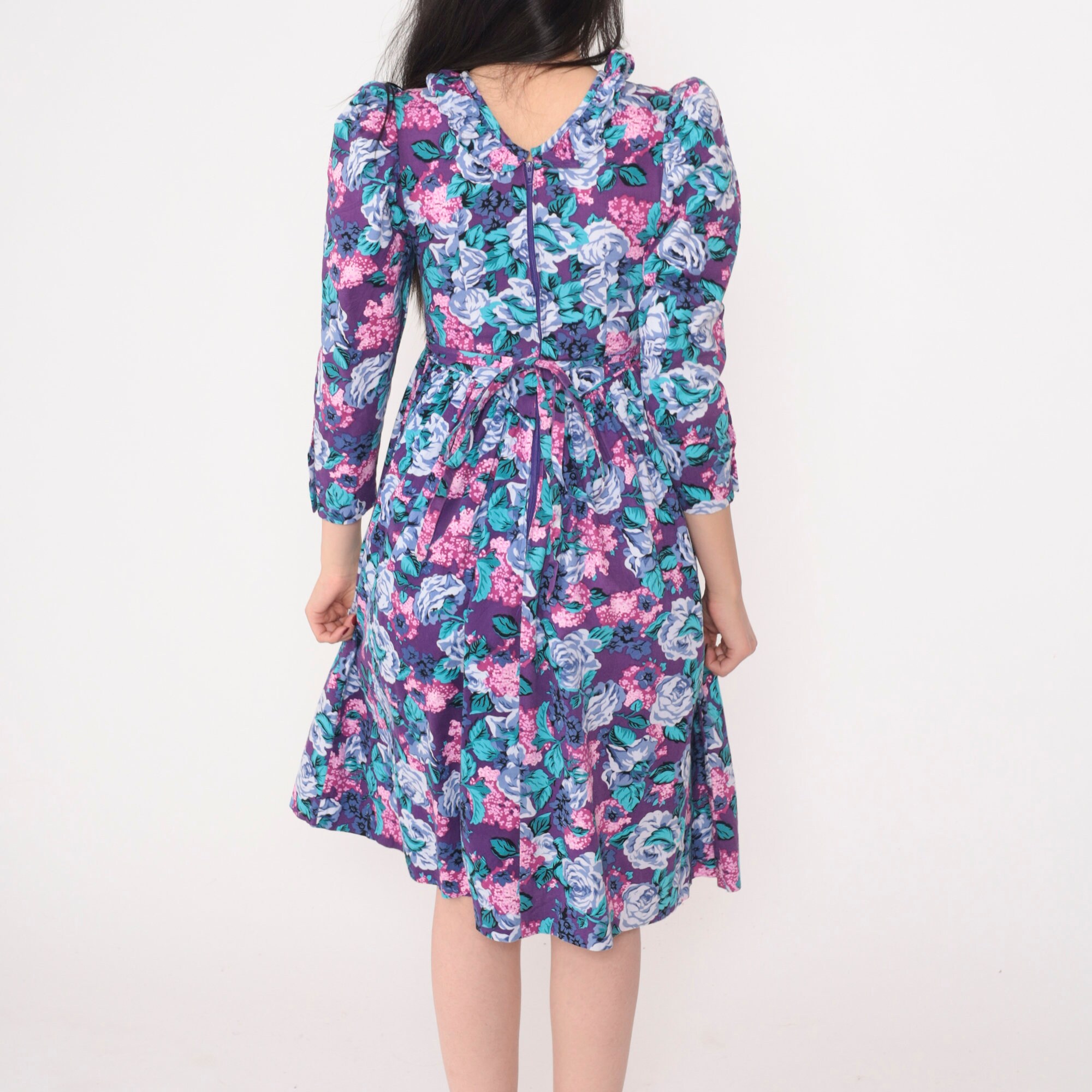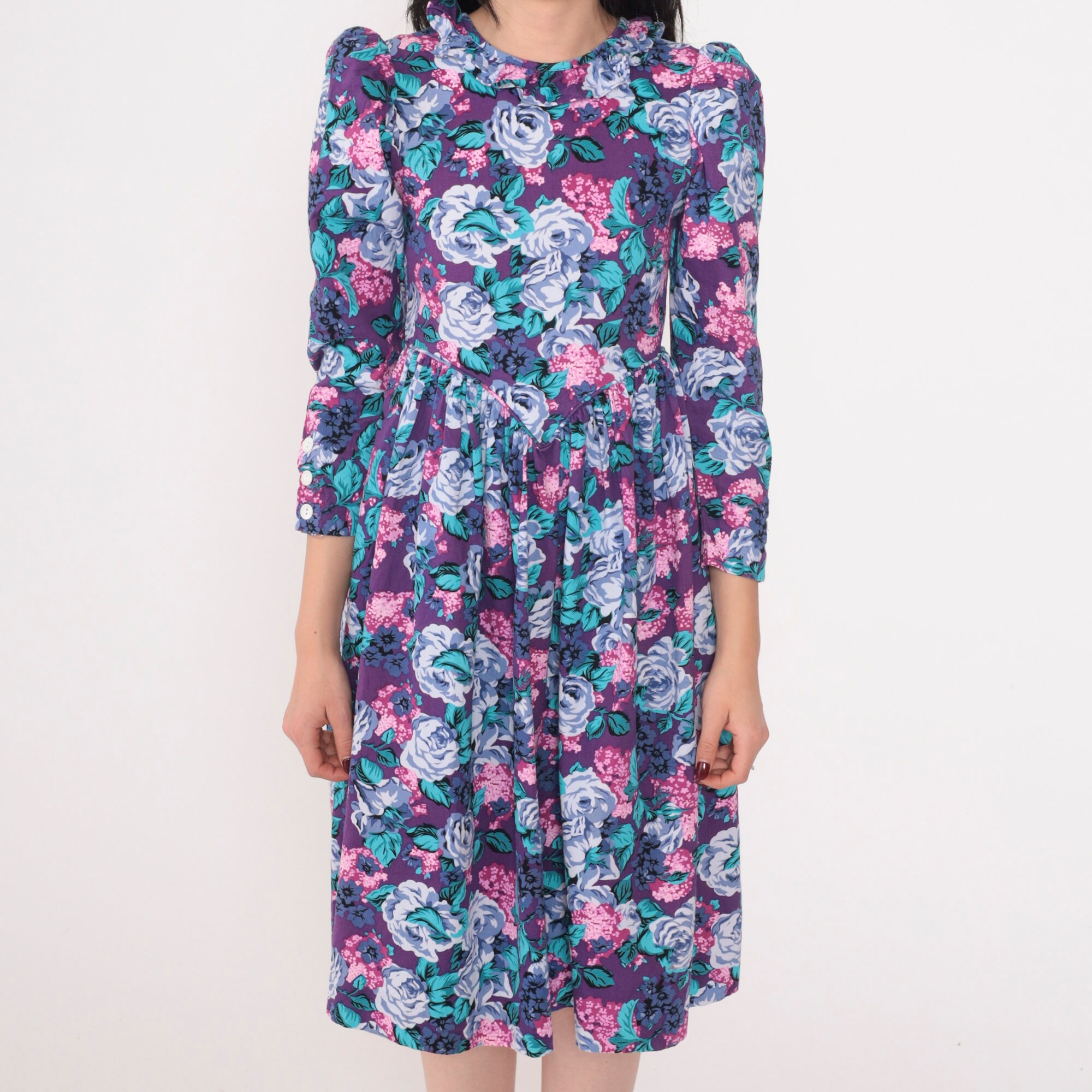 Vintage 80s dress in a purple floral print. High basque waist with a ruffled neckline and long puff sleeves. Midi length