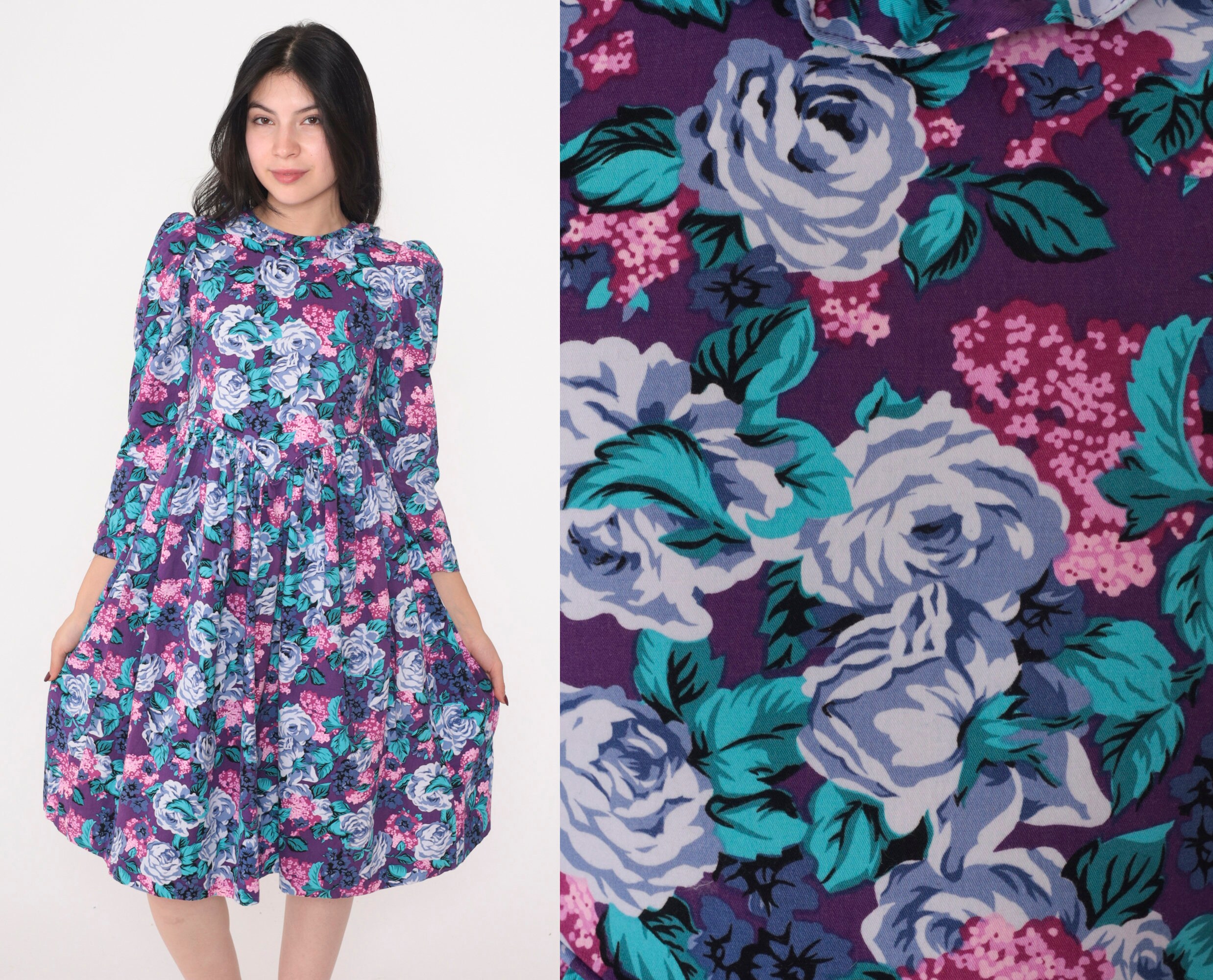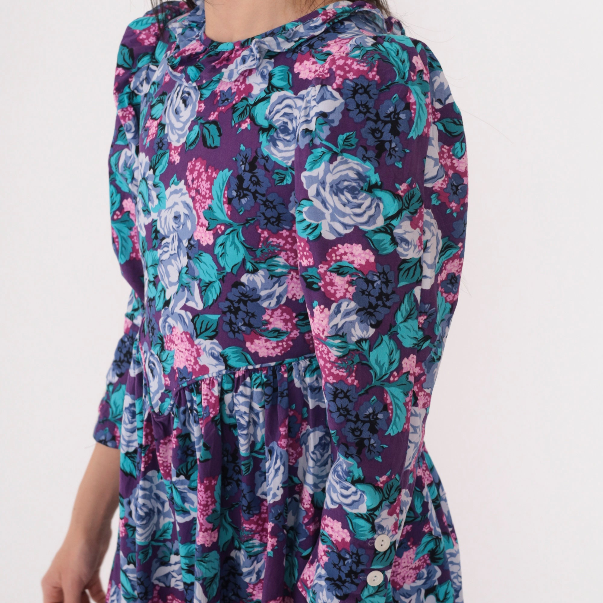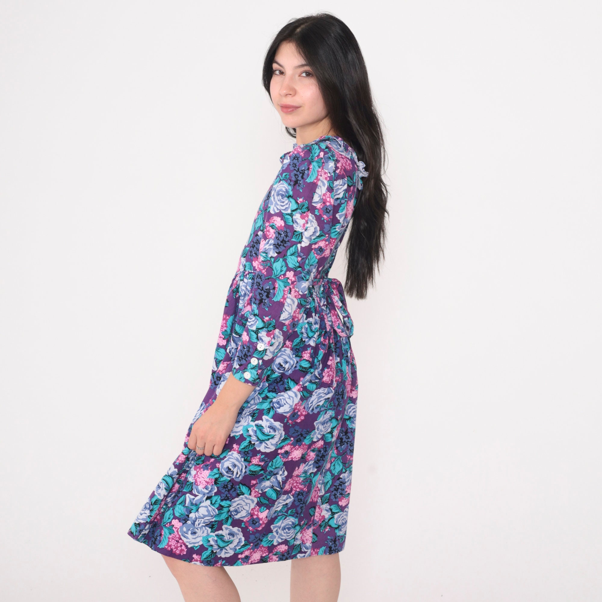 Vintage 80s dress in a purple floral print. High basque waist with a ruffled neckline and long puff sleeves. Midi length