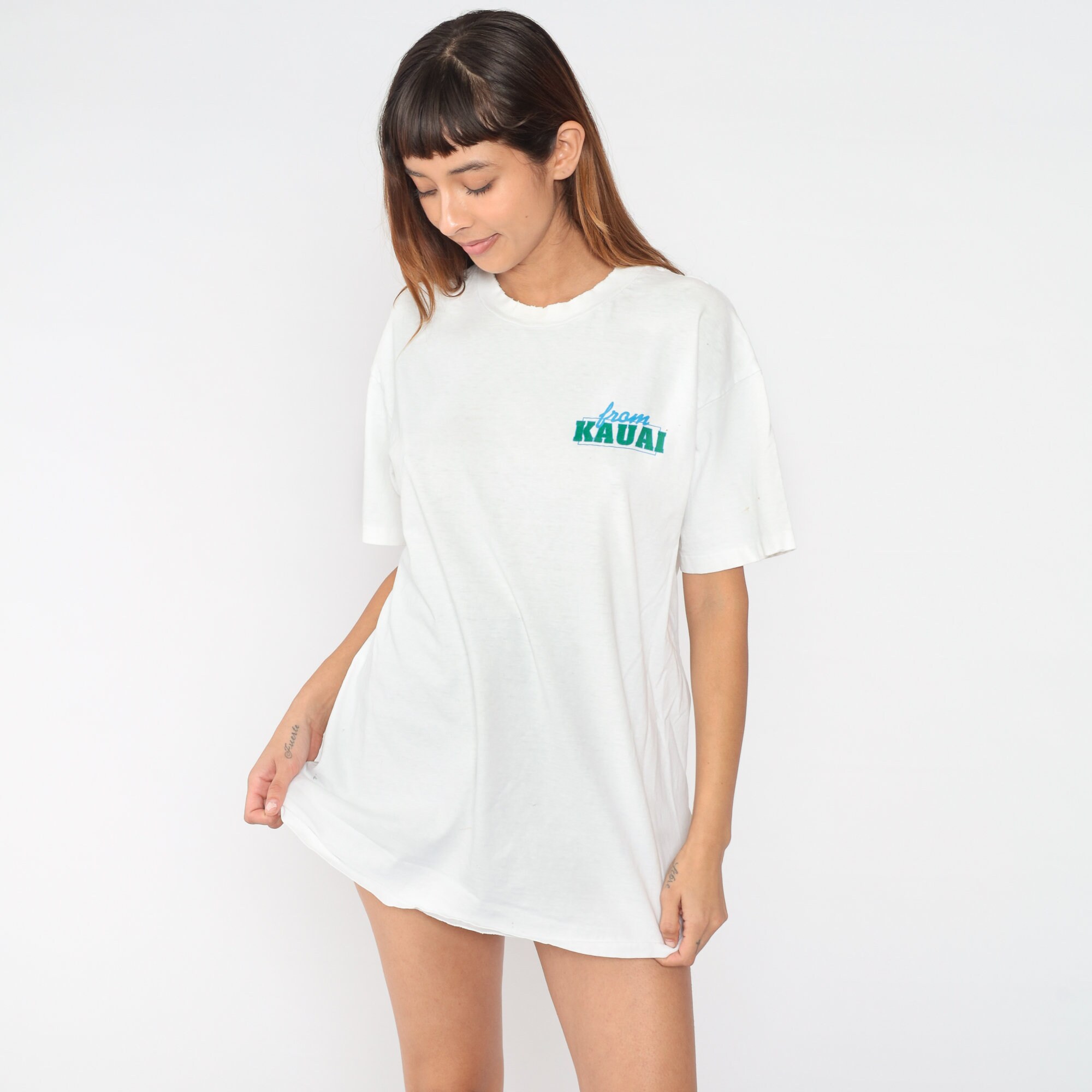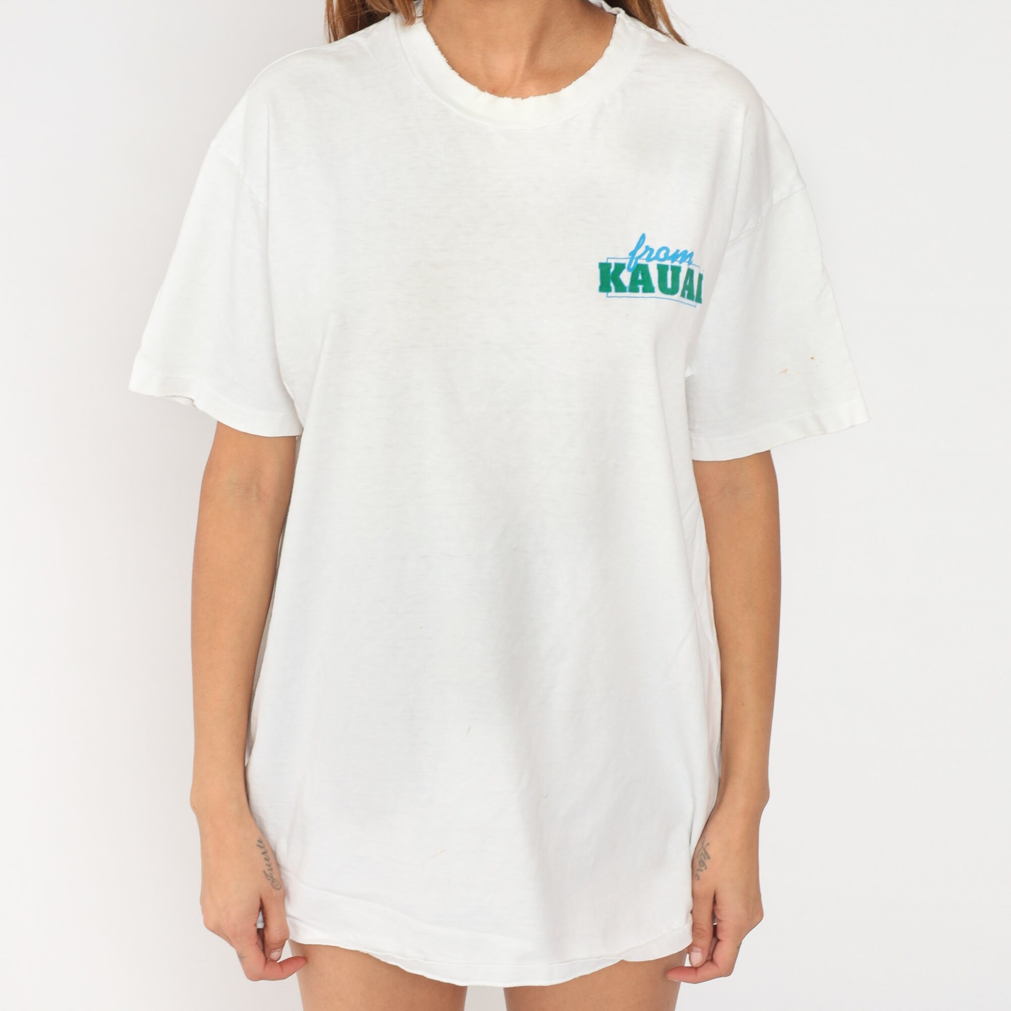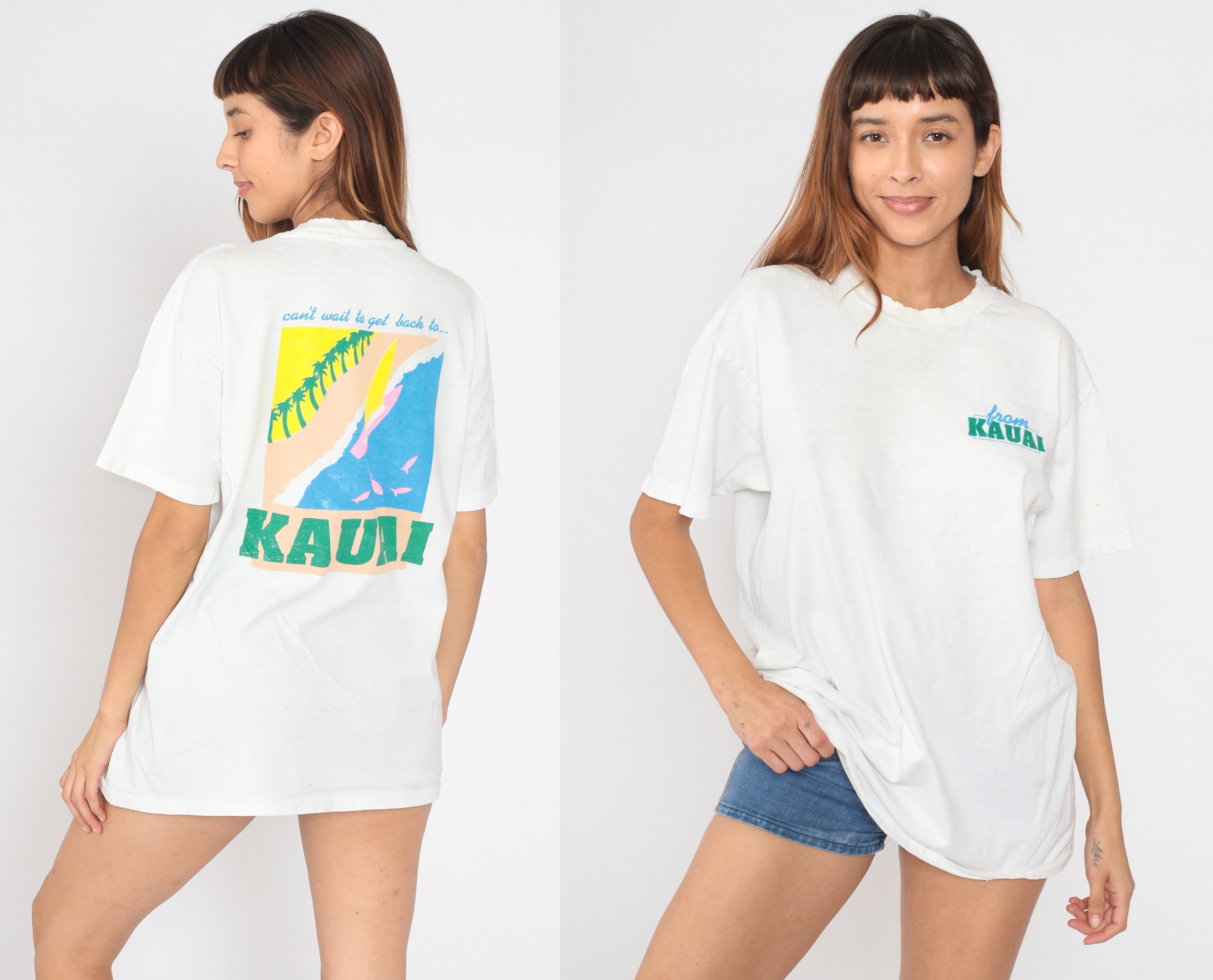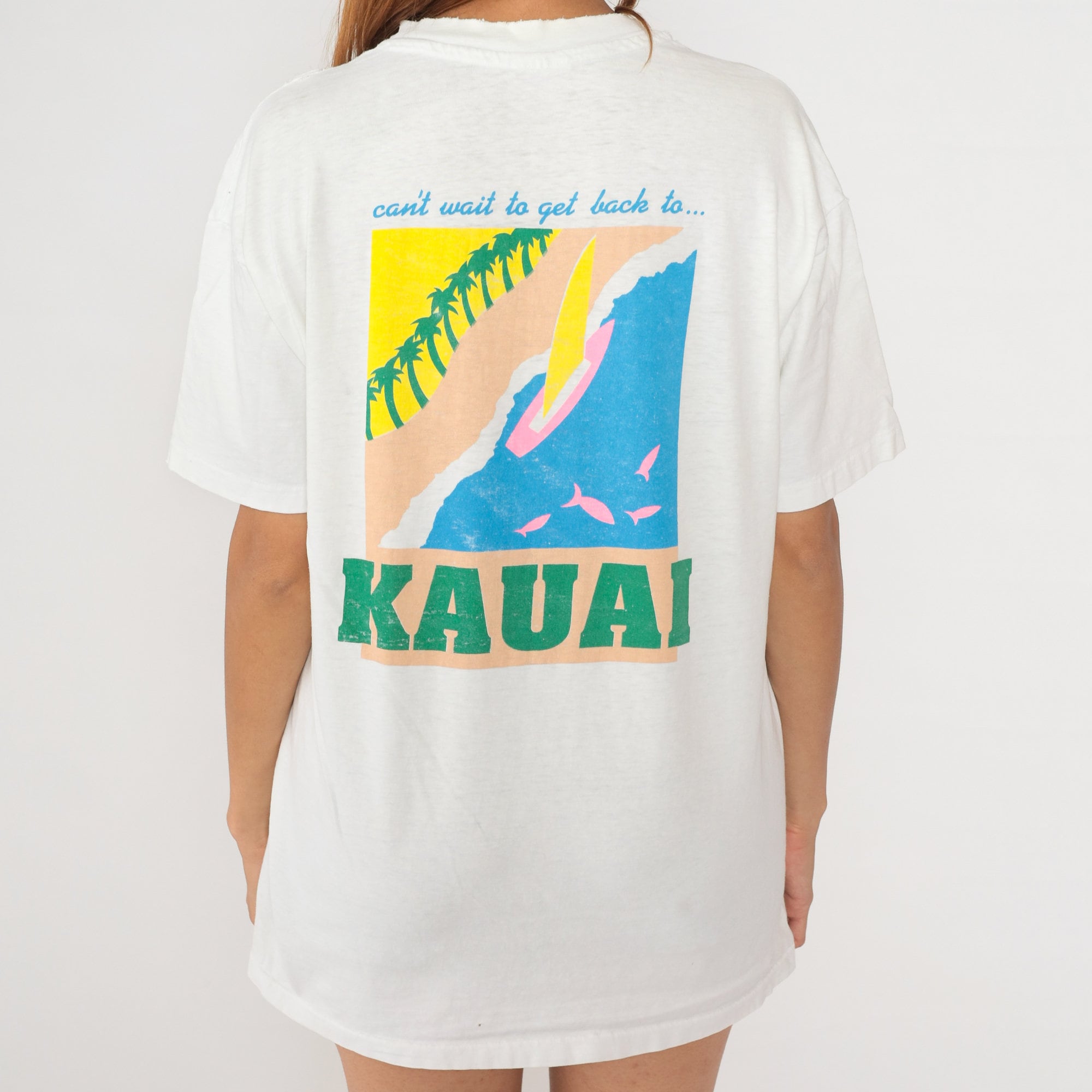 Vintage 90s shirt from Kauai, Hawaii with a beach print and 'Can't wait to get back to Kauai' on the back. Distressed, see condition below.