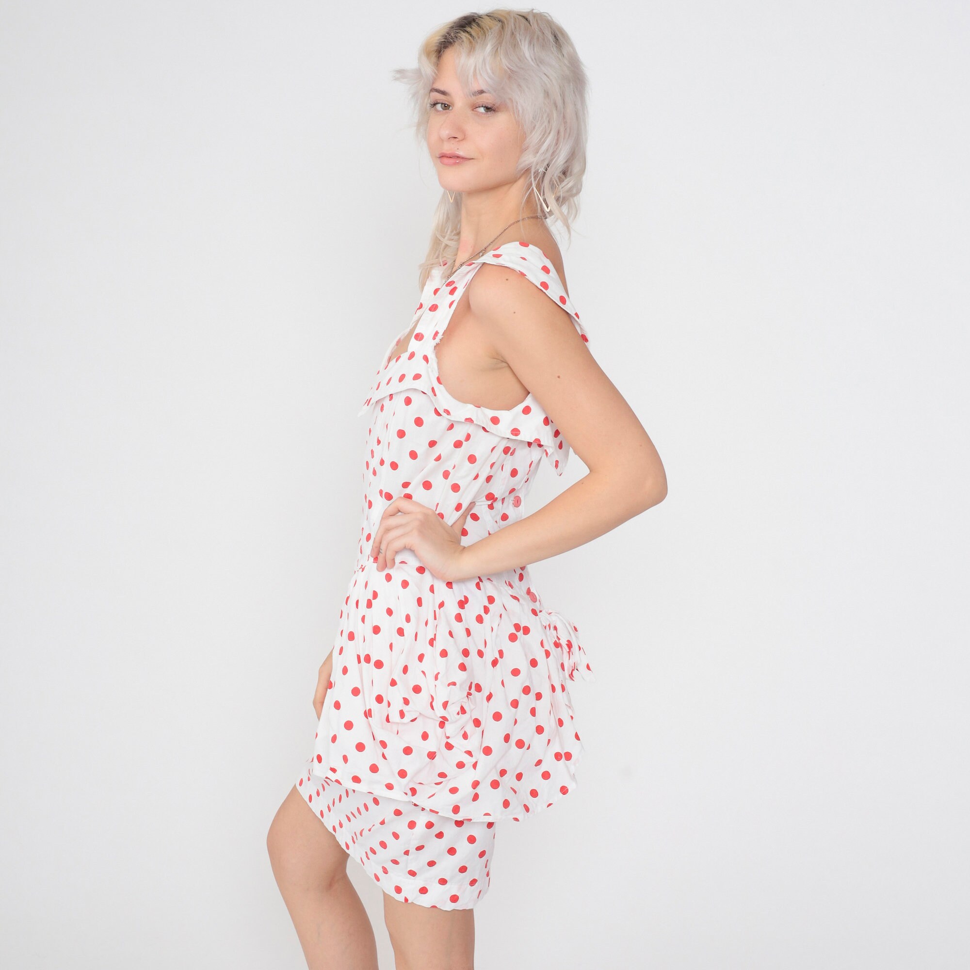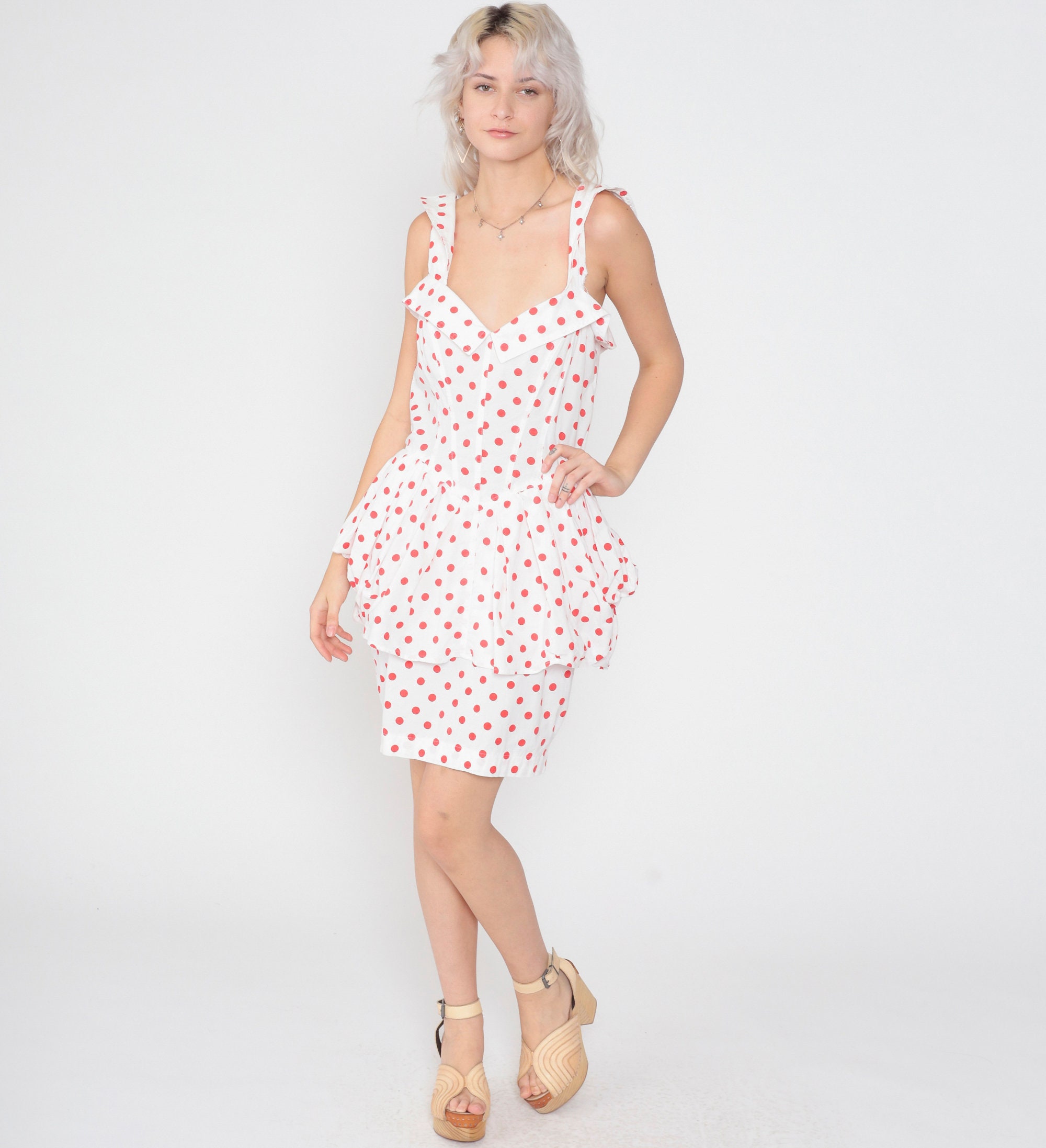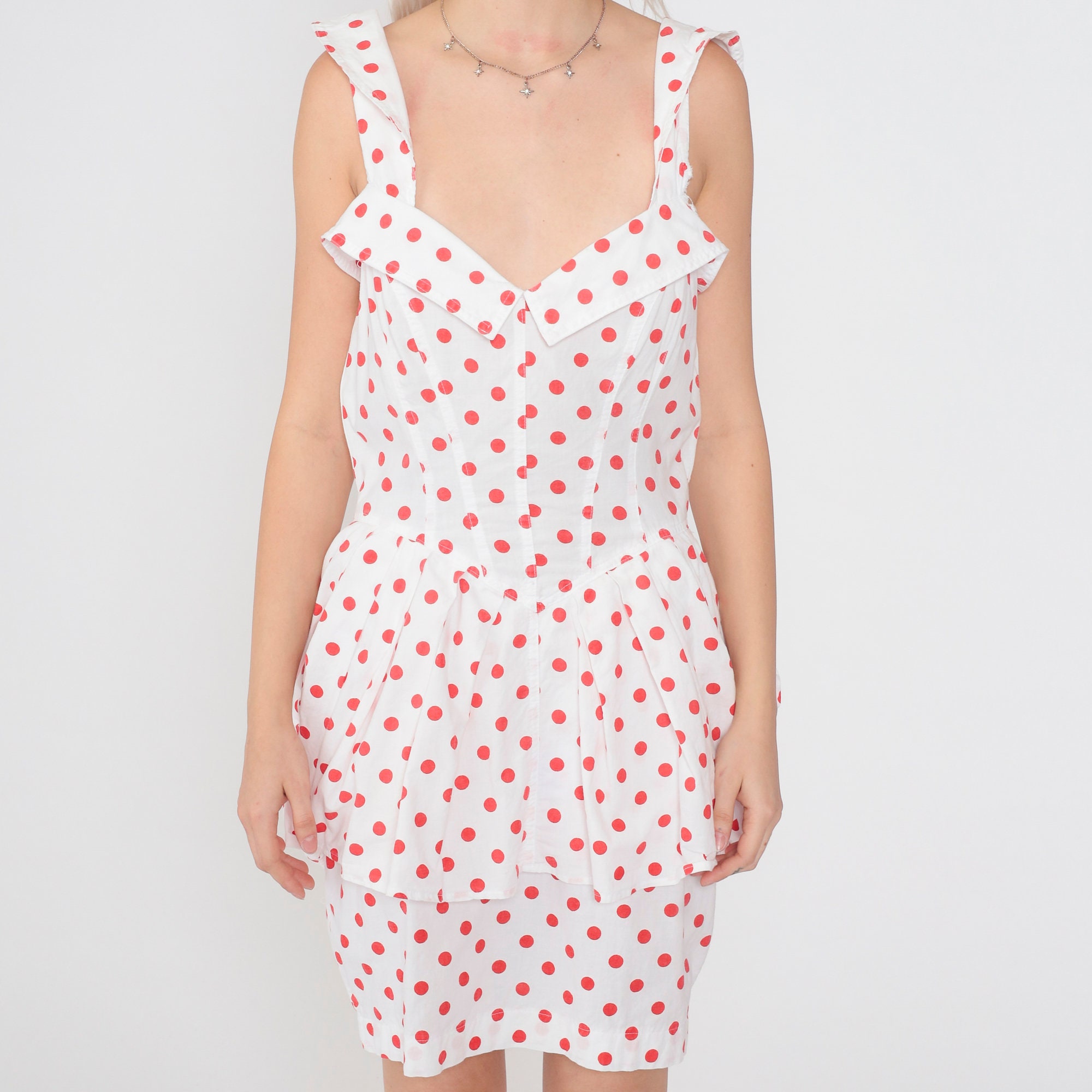 Vintage 80s dress in white with red polka dots. Sleeveless with a high pelum waist. Mini length with buttons up the back.